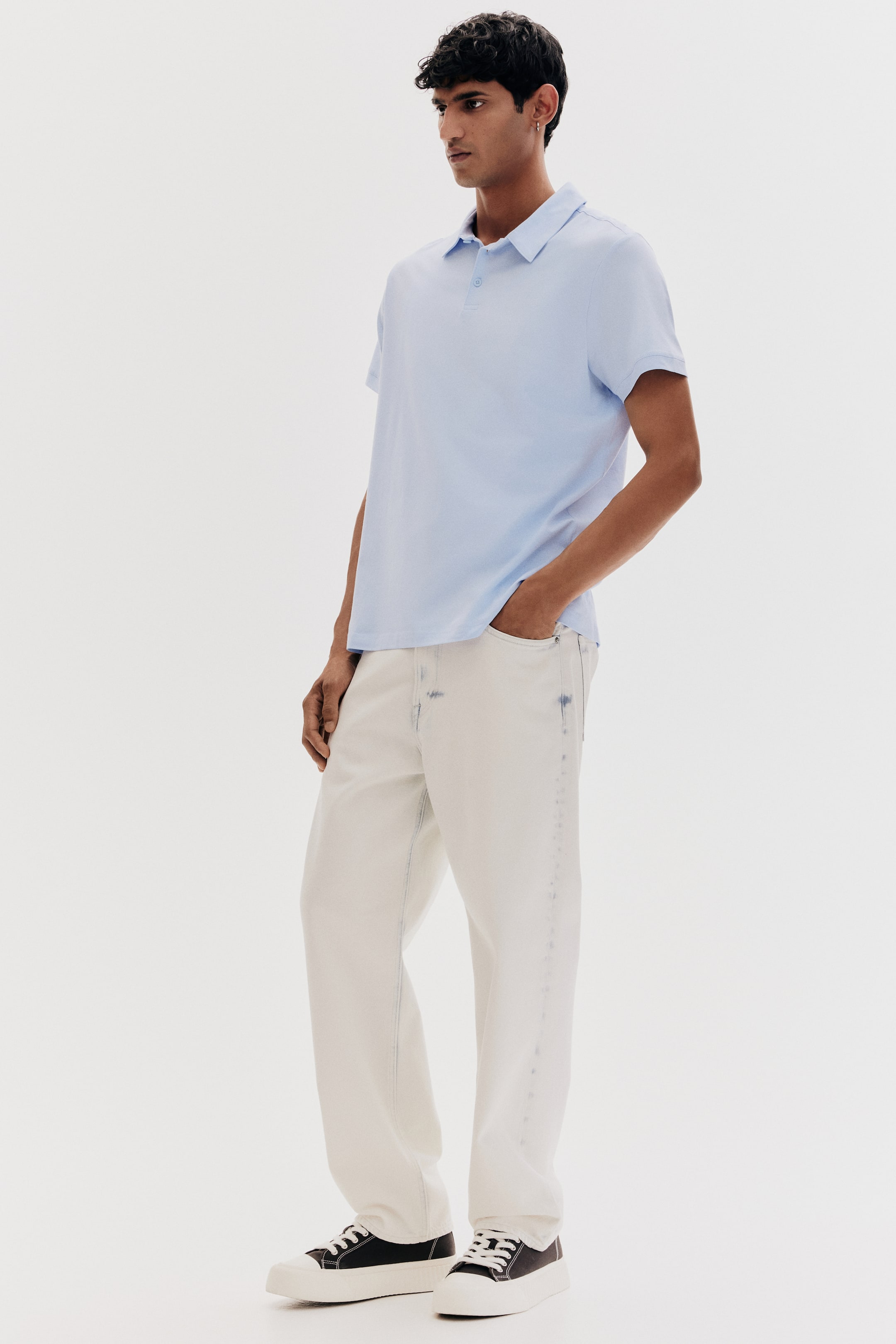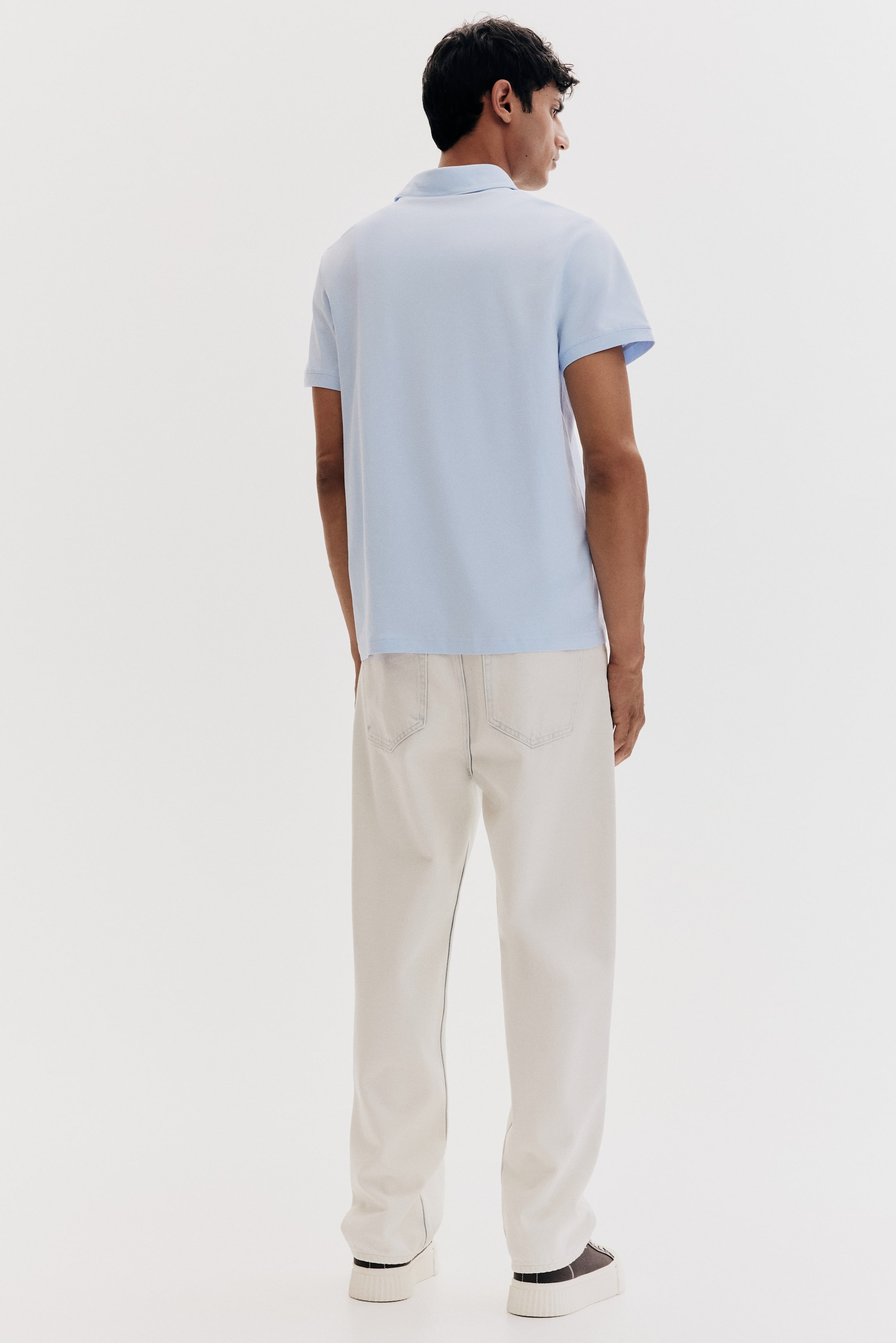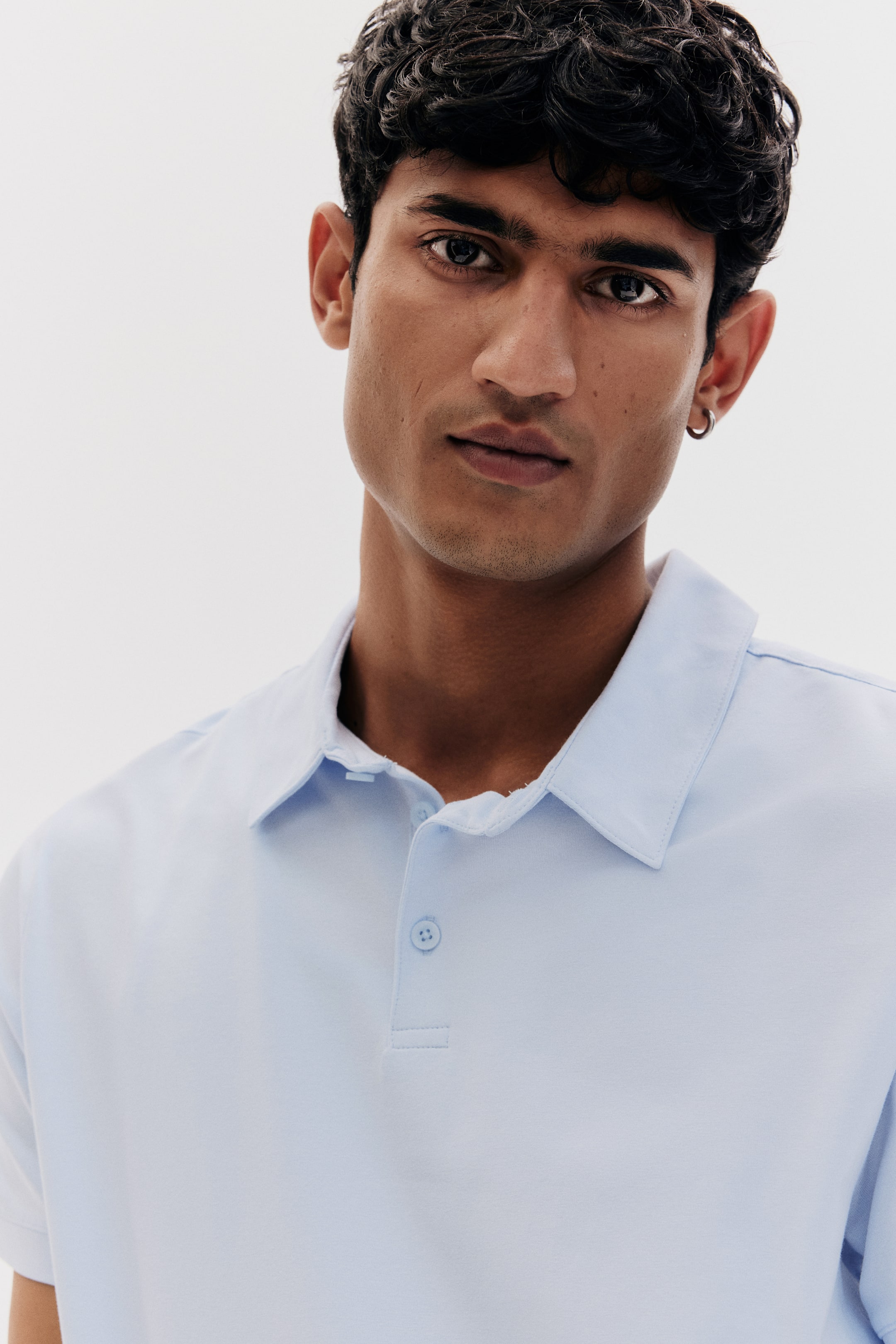 Poloshirt i let bomuldsjersey med krave, knapper foroven, korte ærmer og lige skåret kant forneden. Slim fit, som følger kroppen og giver en figursyet silhuet.