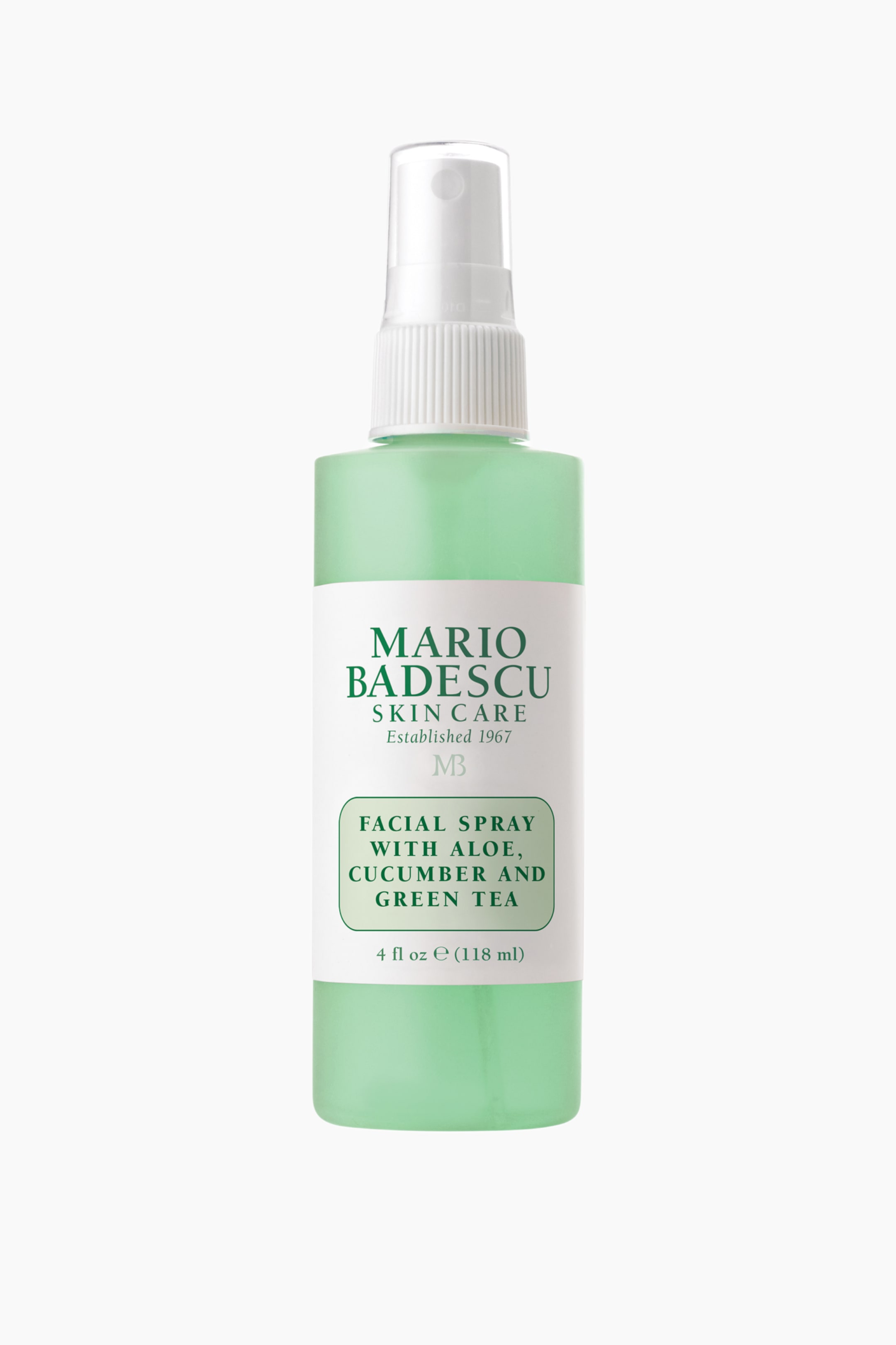 Mario Badescu Facial Spray With Aloe, Cucumber & Green Tea 118ml er en forfriskende ansigtsspray med essentiel agurkevand og pebermynte til genoplivning mat hud. Denne ansigtsspray giver et kølende boost af fugt, og grøn te sørger for kraftfuld antioxidant beskyttelse. Huden efterlades forfrisket og revitaliseret. Fugtende og opfriskende ansigtsspray til mat hud. Egnet til alle hudtyper.