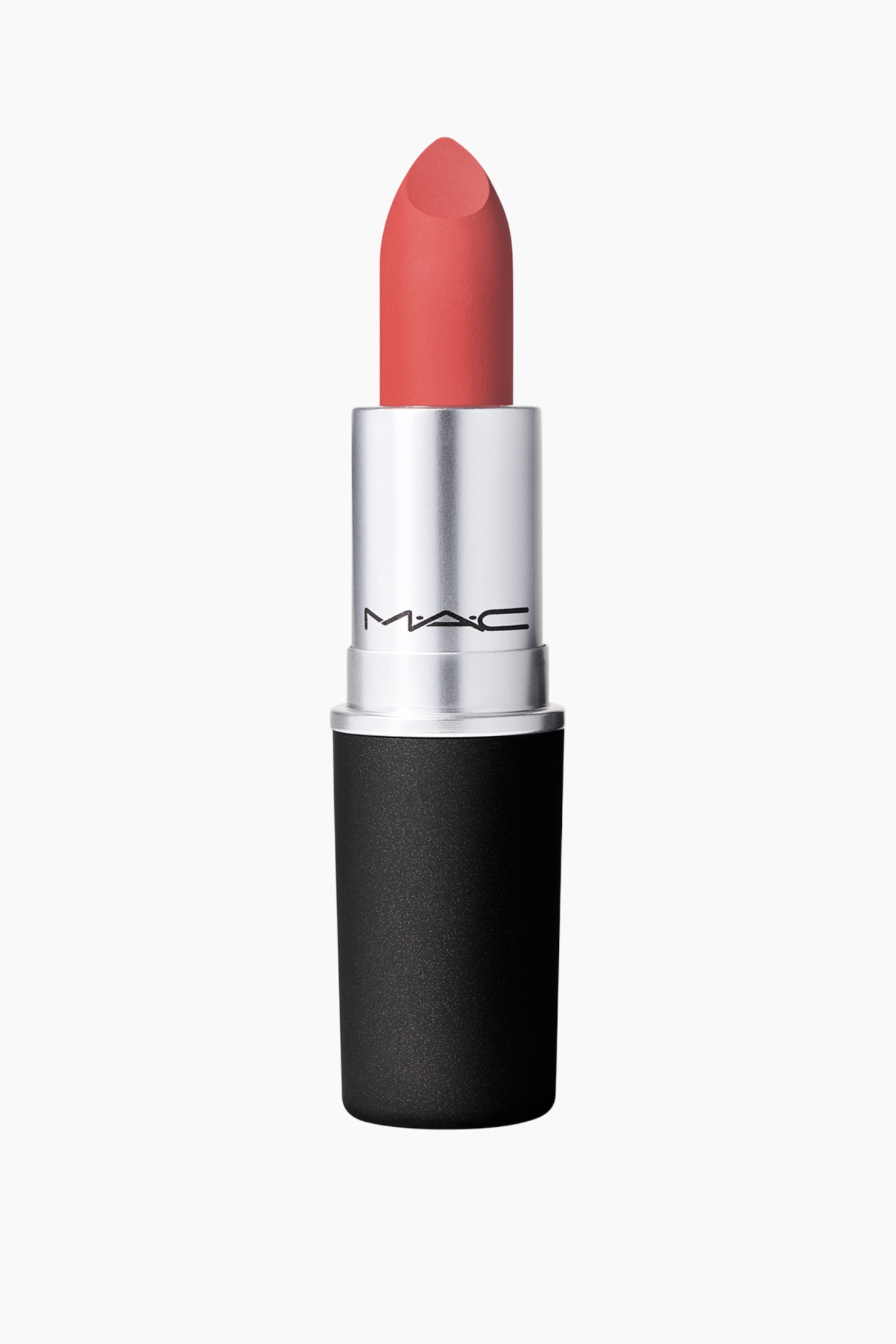Powder Kiss Lipstick MAC Cosmetics har en let pudret konsistent, som giver fugt og blødgør læberne samtidigt med, at den giver et flot og mat finish. MAC Cosmetics Powderkiss læbestift er udviklet på baggrund af ønsker fra makeupartister verden over – de ville gerne have en mat læbestift og som kunne udtones i kanten for at give en blødere overgang. Den unikke Powder Kiss læbestift formularen fra MAC Cosmetics indeholder fugtgivende pudderpigmenter, hvilket gør at din Powderkiss læbestift føles som en fugtgivende læbebalsam, der giver en flot farve uden at udtørrer dine læber. Powder Kiss Lipstick fra MAC Cosmetics findes i mere end 20 forskellige nuancer, hvorfor du nemt kan finde en farve der passer til enhver lejlighed og hudtone.