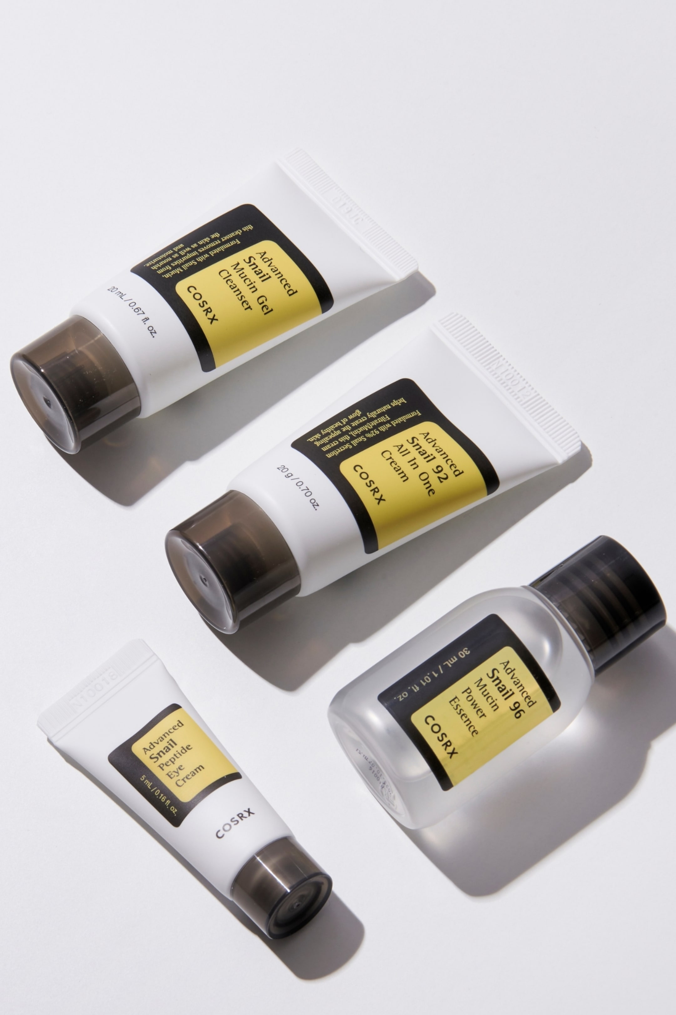 COSRX's mest elskede 4-trins Advanced Snail Trial Kit: Hudpleje baseret på det berømte snegleslim til at reparere, fugte og berolige din hud.