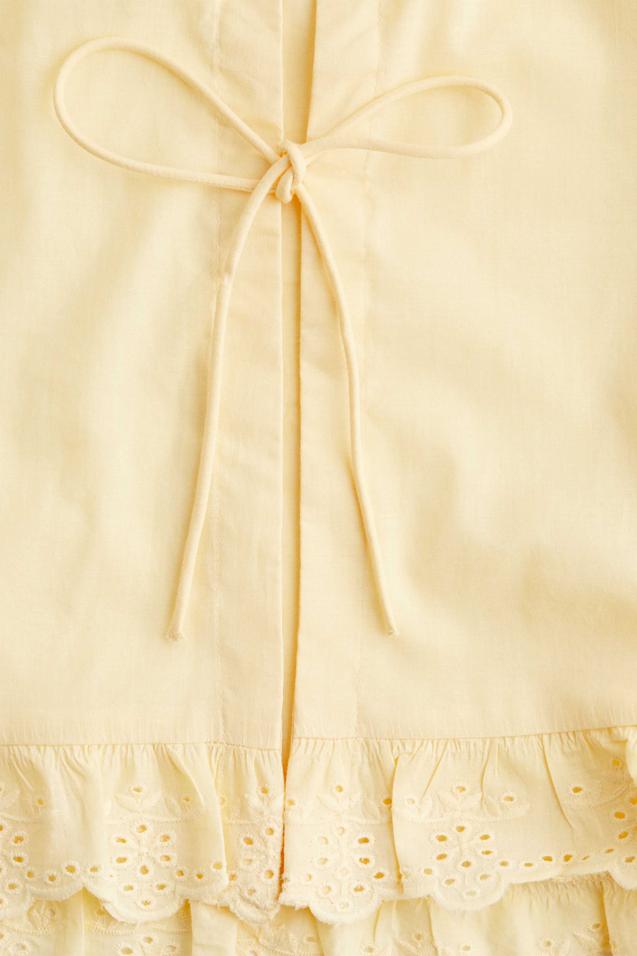 Bluse i blød, vævet bomuldskvalitet med flæser med tungekant og broderie anglaise i halsudskæringen, nederst på ærmerne og forneden. Blusen har rund hals, åbent forstykke med to sæt smalle bindebånd samt korte pufærmer med smal elastik og bindebånd forneden.