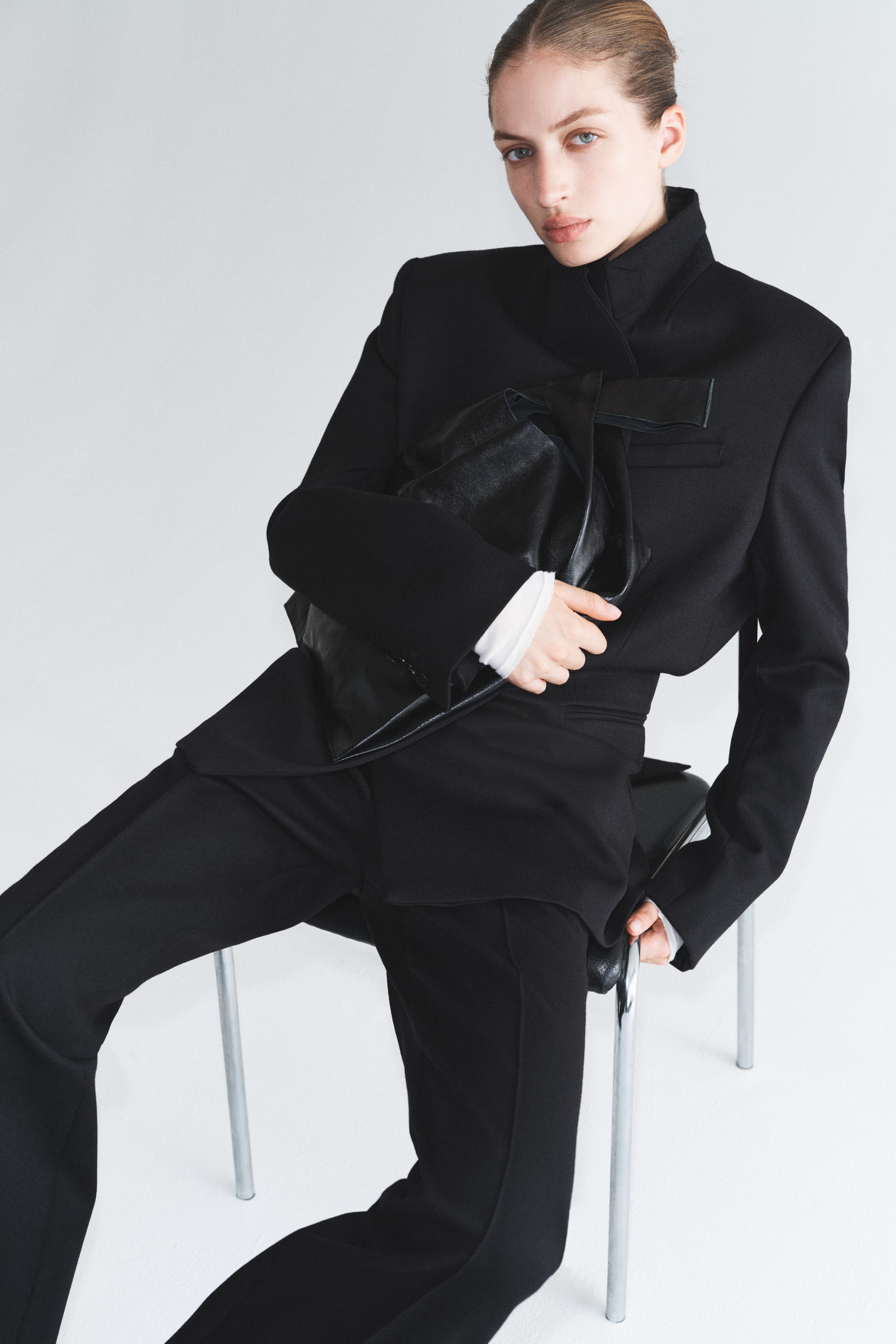 Stylede bukser i vævet uldkvalitet med lav talje med lynlåsgylp og forlænget linning med skjult knap og hægtelukning. Bukserne har skrå sidelommer og en paspoleret baglomme med knap. Lavt skridt samt lige ben med syet pressefold foran og almindelig pressefold bagpå. Forholdsvis lange ben, som falder ud over foden.