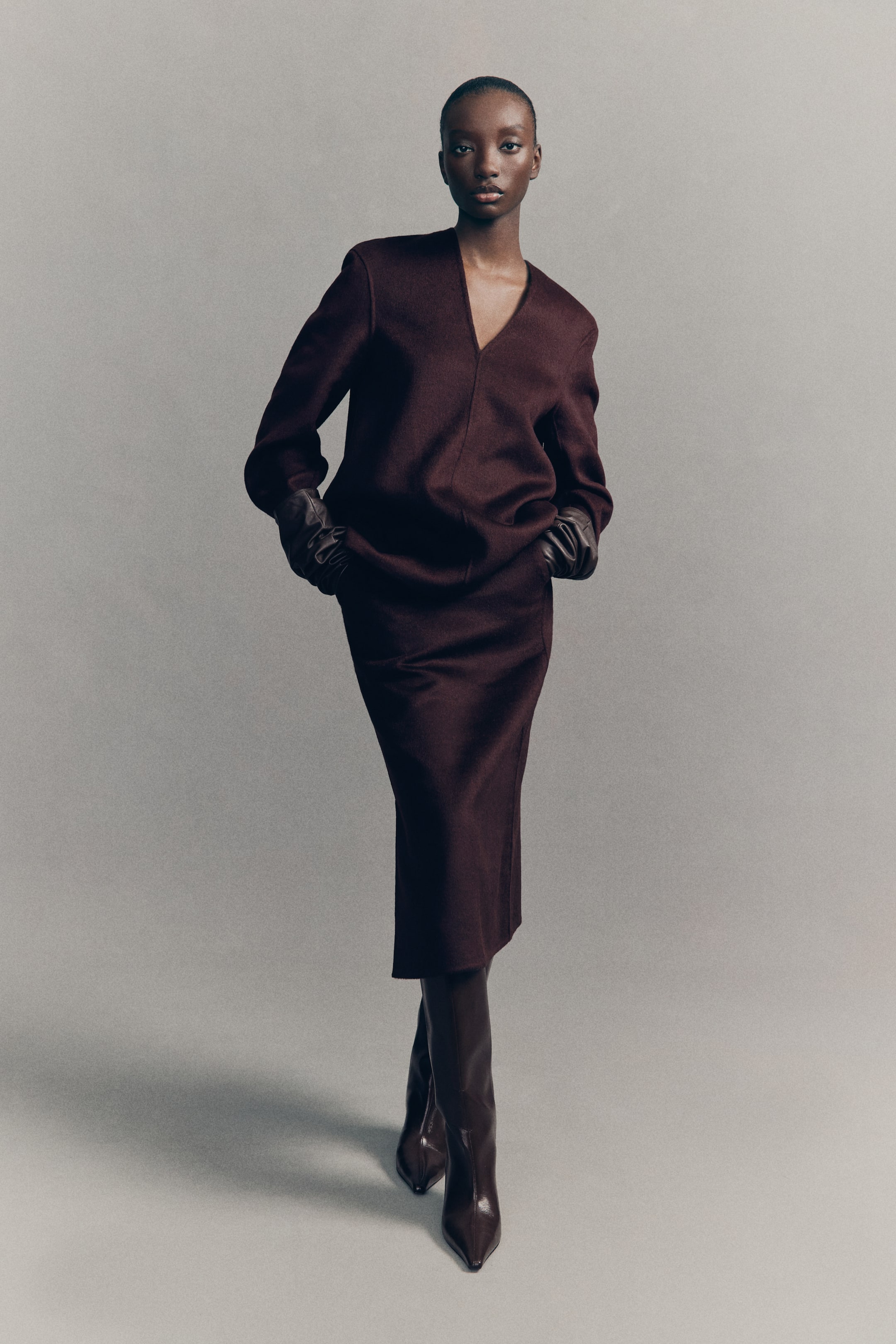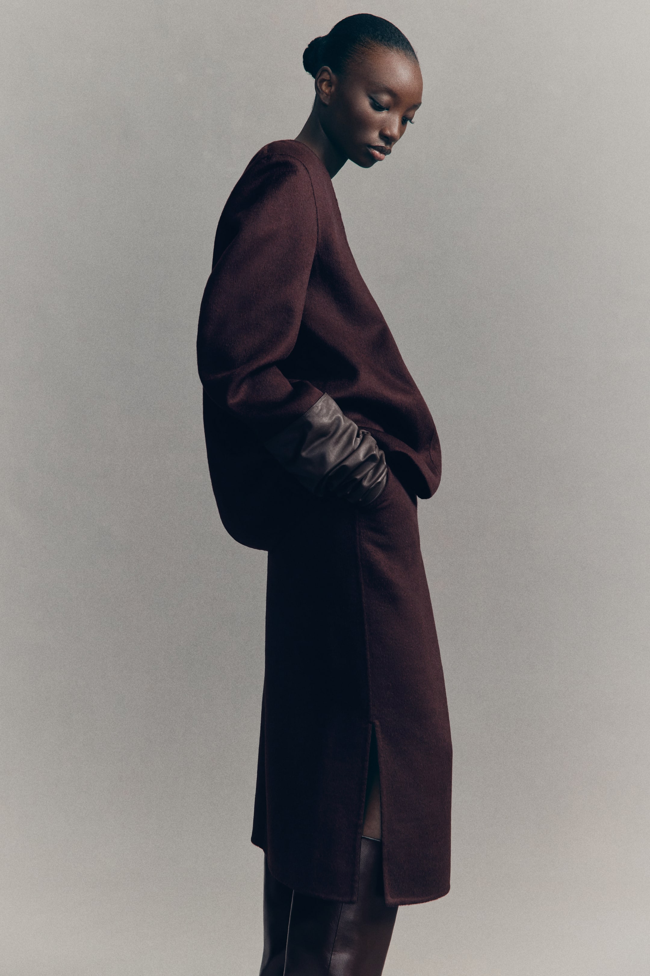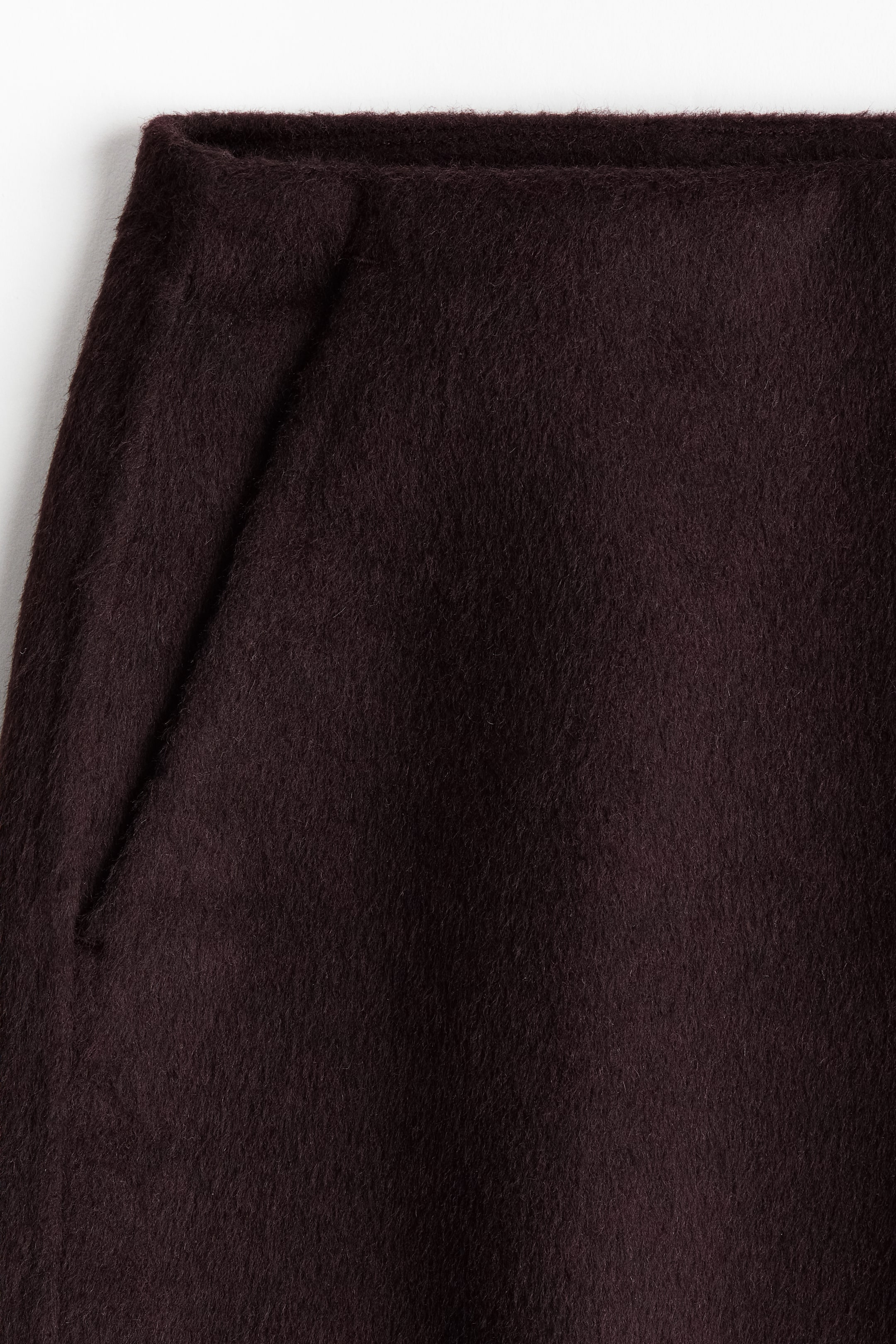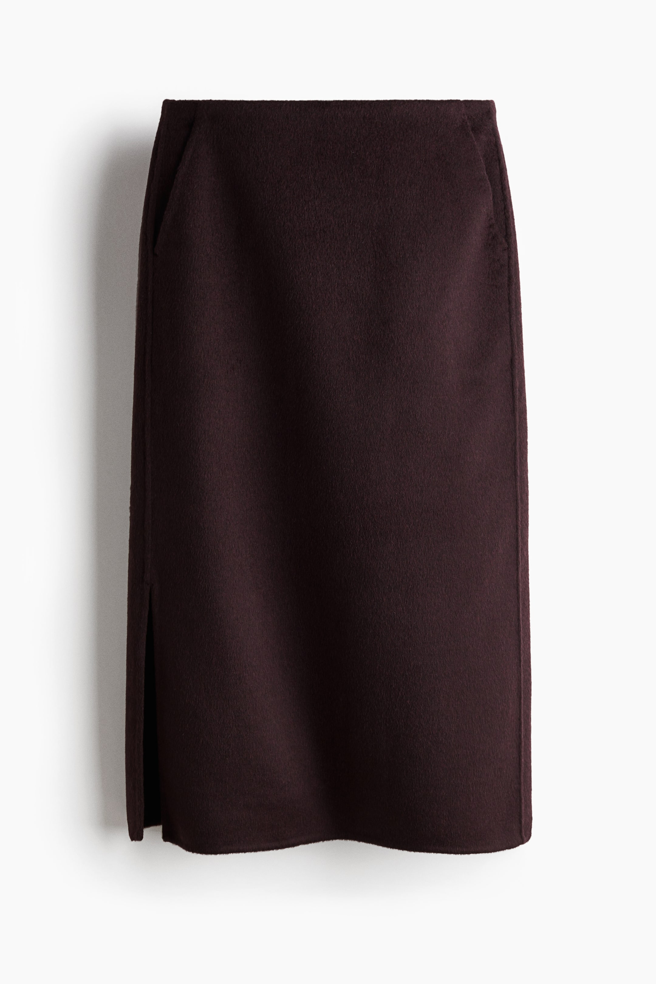 Pencilnederdel i midi-længde i vævet uldblanding med almindelig talje med skjult lynlås og hægtelukning bagpå. Skrå sidelommer og slids i den ene side forneden. Delvis foret.
