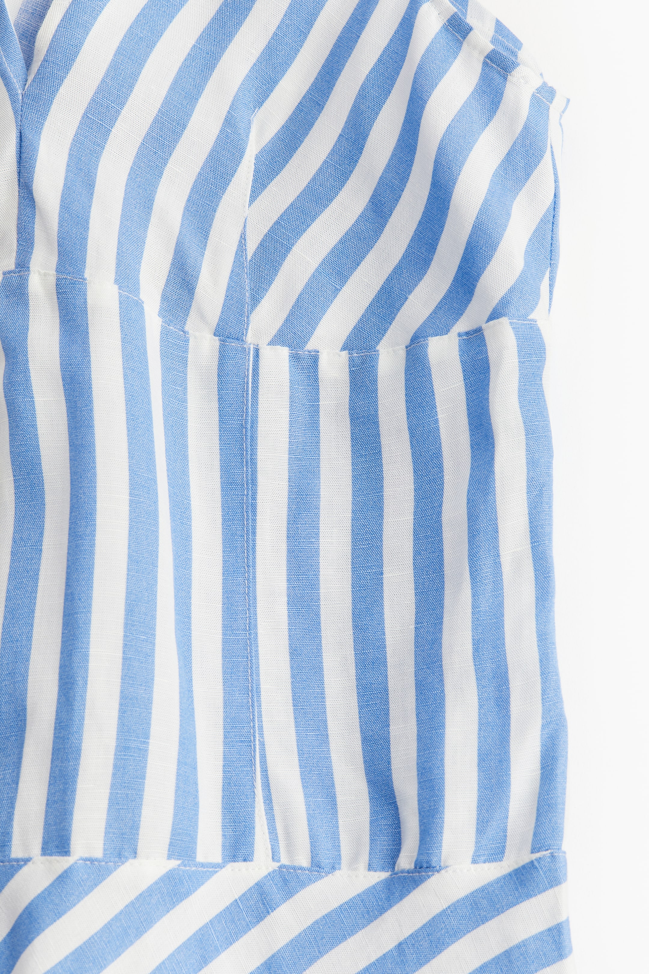 Wadenlanges Kleid aus einem Leinen-Viskose-Gewebe mit tiefem V-Ausschnitt und breiten Bindeträgern. Anliegende Taillenpasse mit figurformenden Abnähern, ein verdeckter Rückenreißverschluss und ein leicht ausgestellter Rock. Ungefüttert.