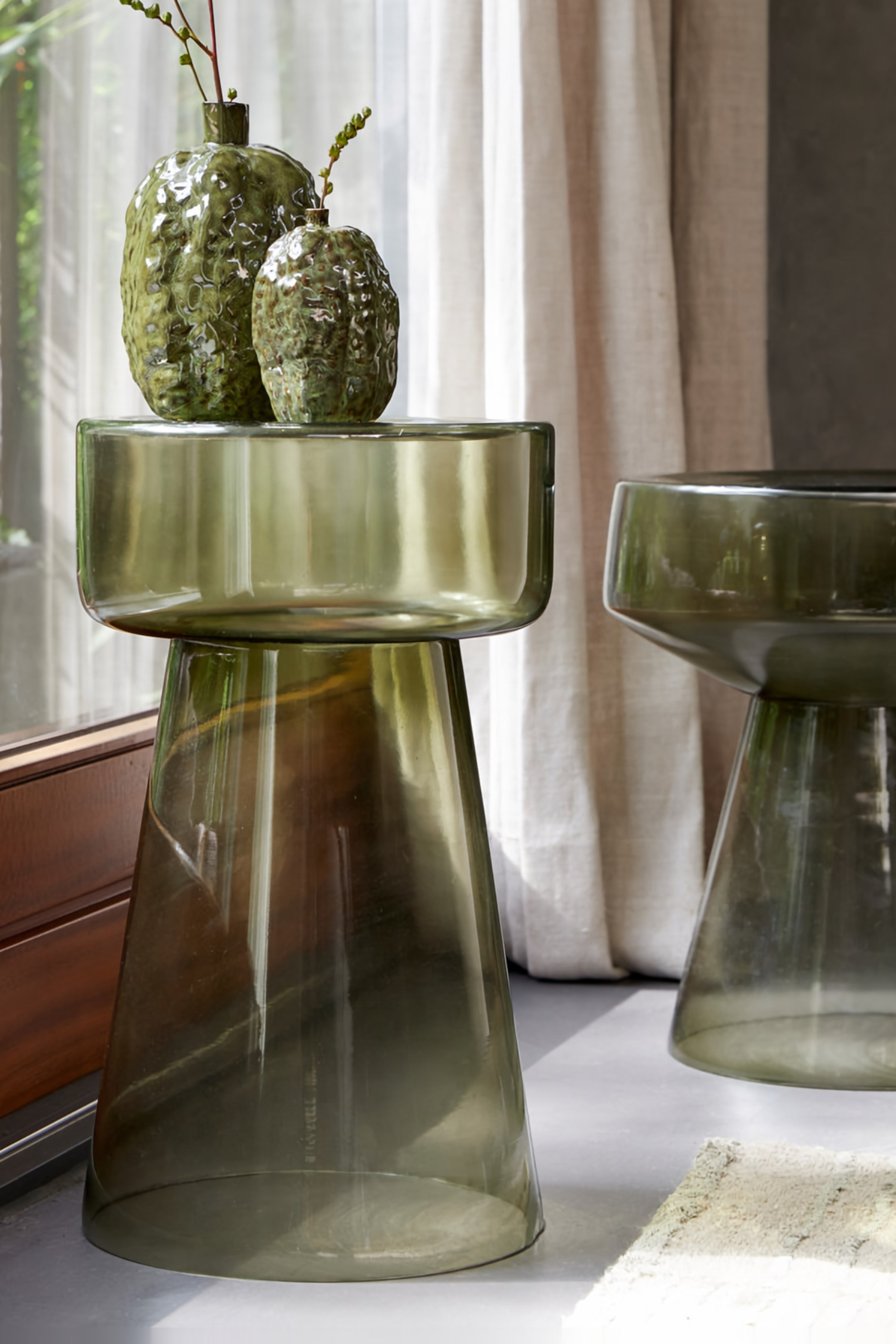 Der graue Beistelltisch aus Glas Dakwa, mit einem Durchmesser von 37 cm, ist markant und attraktiv, ohne seine Funktion zu vernachlässigen. Stellen Sie ihn neben Ihre Couch, um einen Platz für Getränke, Lampen oder persönliche Schätze zu schaffen, und ziehen Sie die Aufmerksamkeit mit seinem einzigartigen Design auf sich. Als auffällige Mischung aus Kunst und Nutzen wertet dieser Tisch Ihren Raum auf und regt zu Gesprächen an. Größe: 37 x 37 x 44