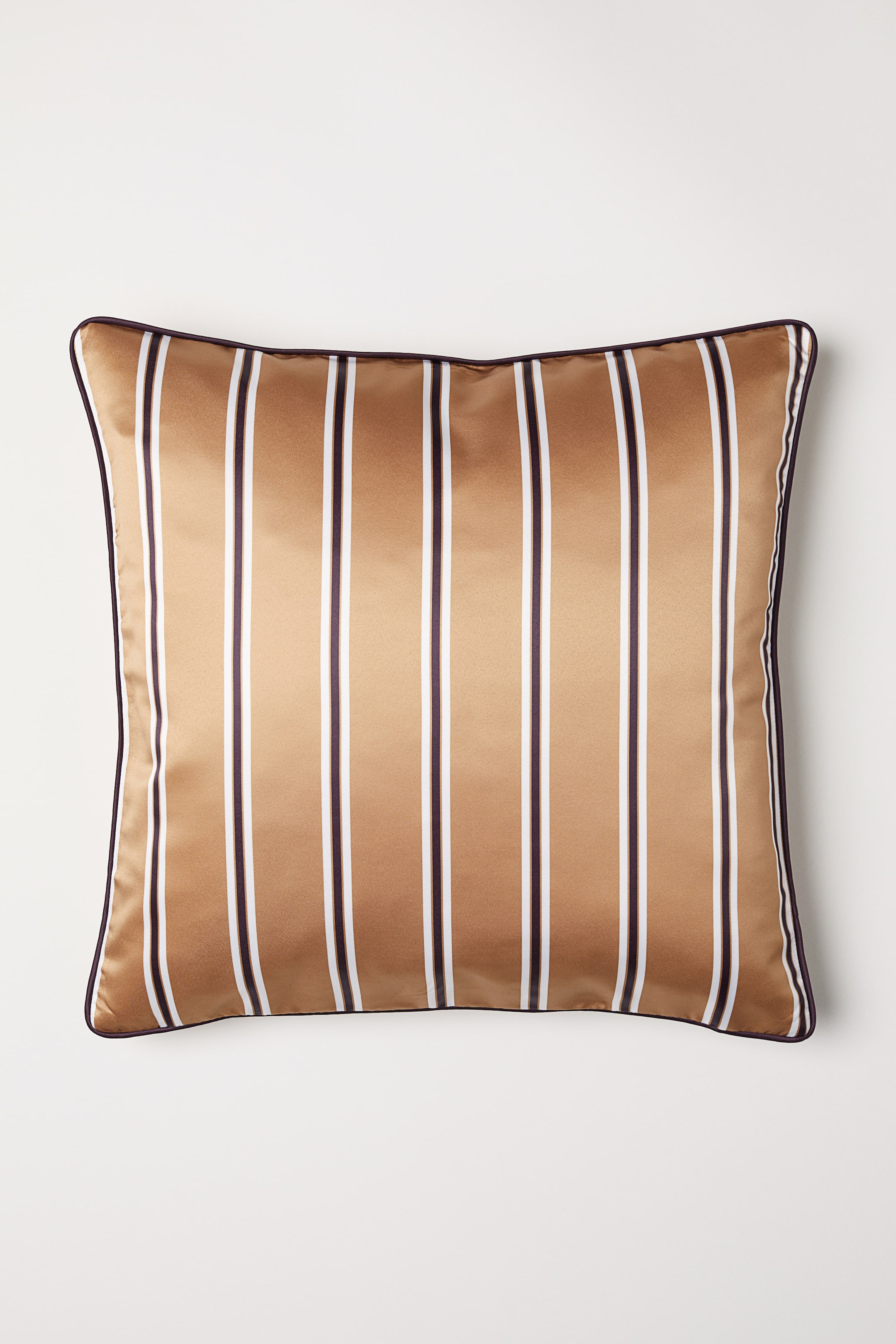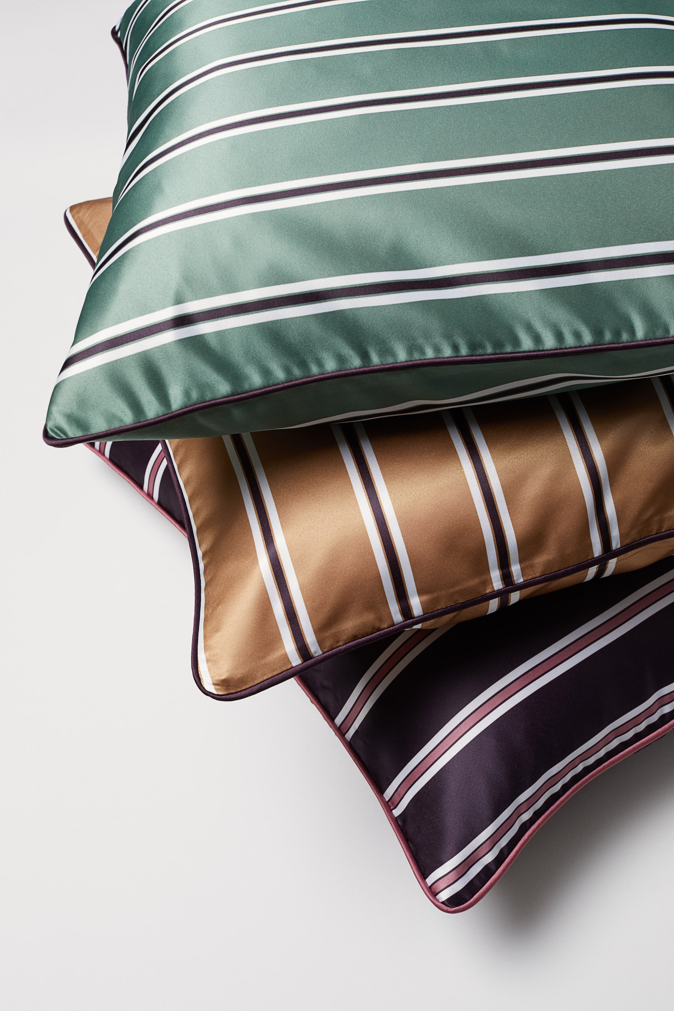 Gestreifte Kissenhülle aus glänzendem Satin. Mit Paspelierung und verdecktem Reissverschluss.