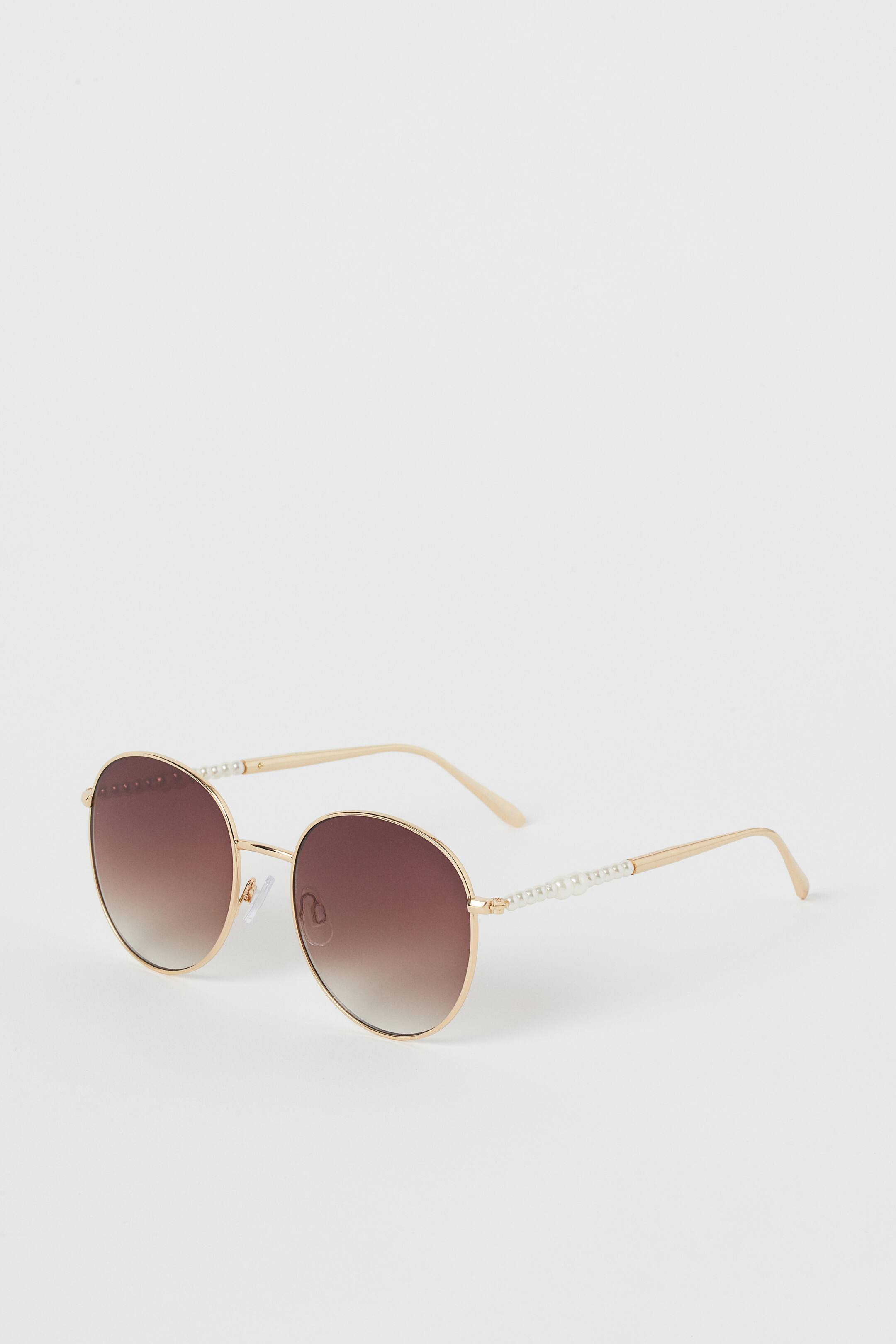 Sonnenbrille mit Metallgestell und dekorativen, perlmuttschimmernden Plastikperlen an den Bügeln. Die Brille hat getönte Gläser mit UV-Schutz.