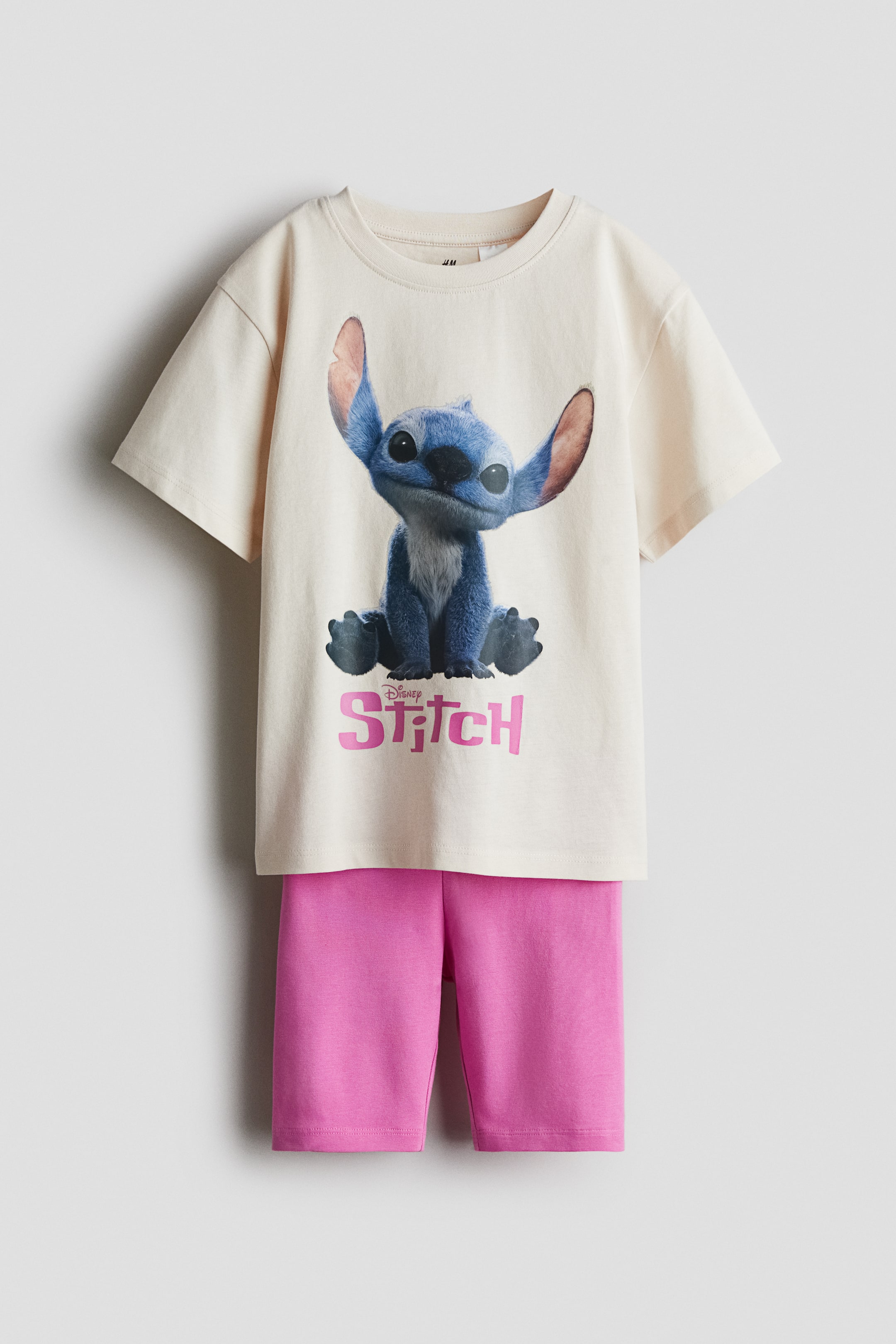 Set mit T-Shirt und einem Paar Radlershorts aus weichem Baumwolljersey. T-Shirt mit Motivprint und überschnittenen Schultern. Shorts mit elastischem Bund.