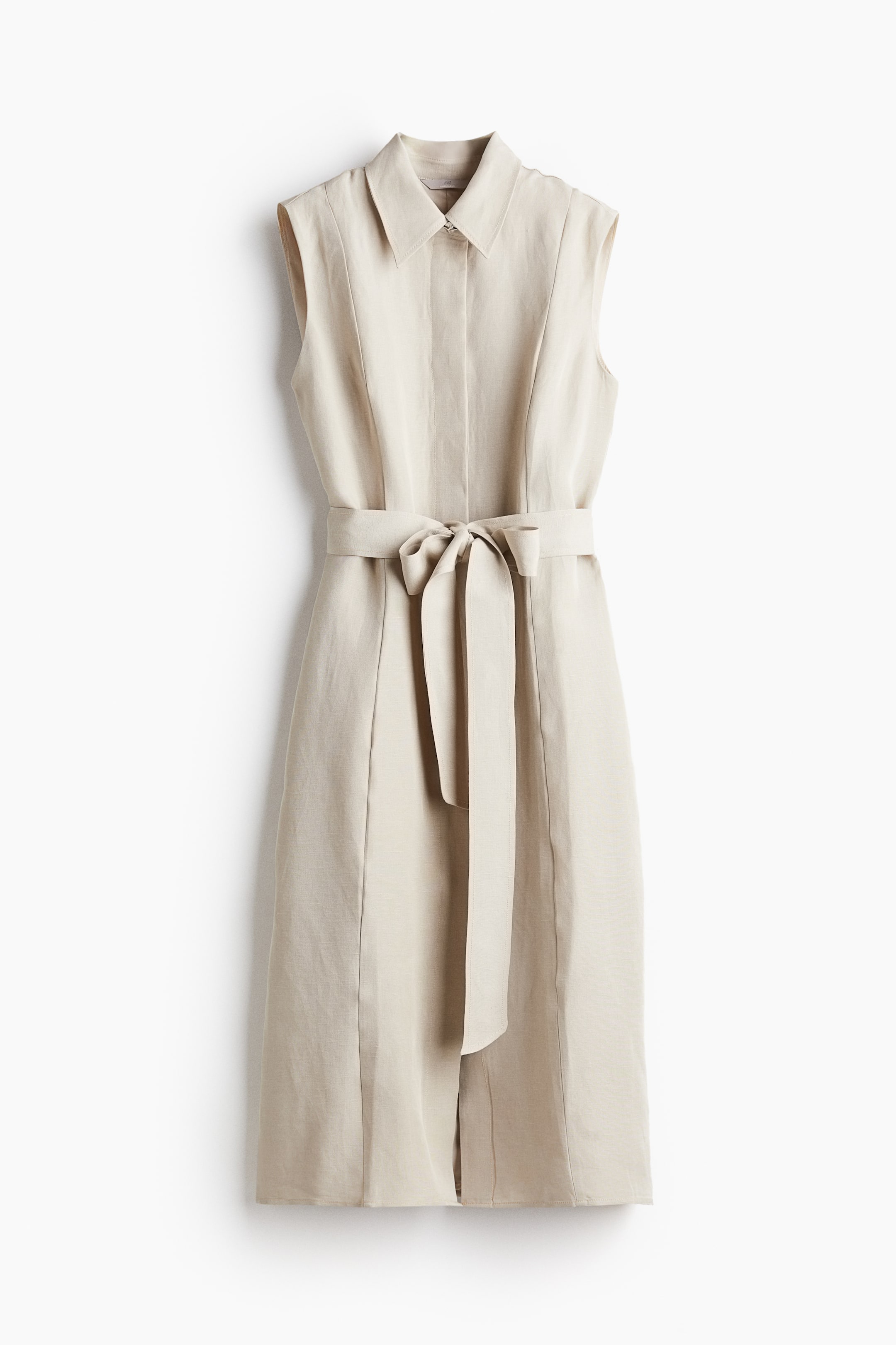 Wadenlanges, ärmelloses Kleid aus einem Leinen-/Viskosemischgewebe. Kragen, eine verdeckte Knopfleiste und ein breiter, abnehmbarer Bindegürtel in der Taille. Markante Nähte an Vorder- und Rückenteil. Gefüttert.