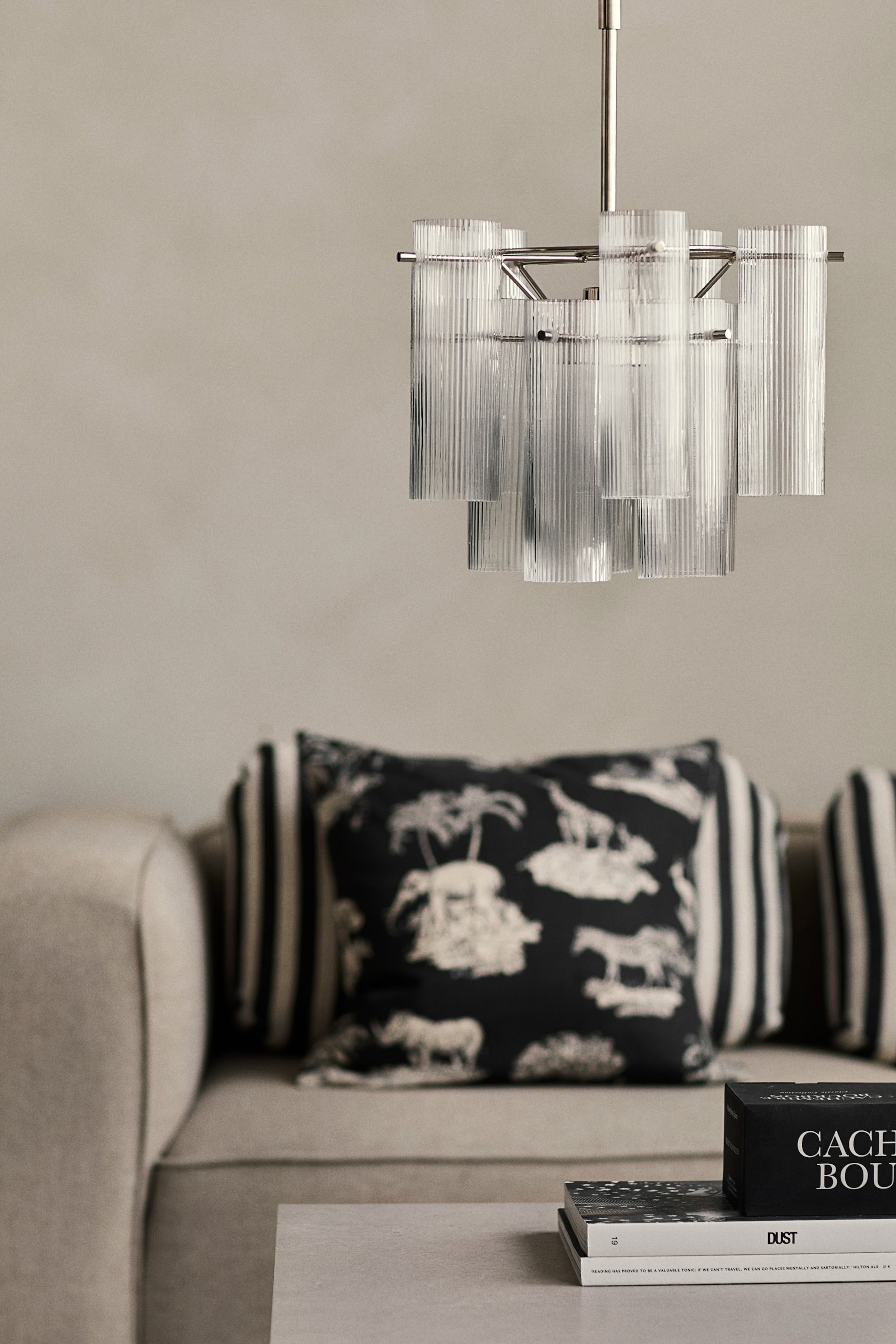 Pendelleuchte aus Metall mit zehn Armen, die in zwei Ebenen von der Mitte ausgehen. Trendiges Design mit Lampen aus geriffeltem Klarglas. Metallgehäuse. Textilummanteltes Kabel und eine E27-Leuchtmittelfassung. Max. 15 W LED. Leuchtmittel und Stecker sind nicht enthalten. Schirmdurchmesser 7,3 cm. Breite 34 cm. Höhe 26 cm. Kabellänge 200 cm.