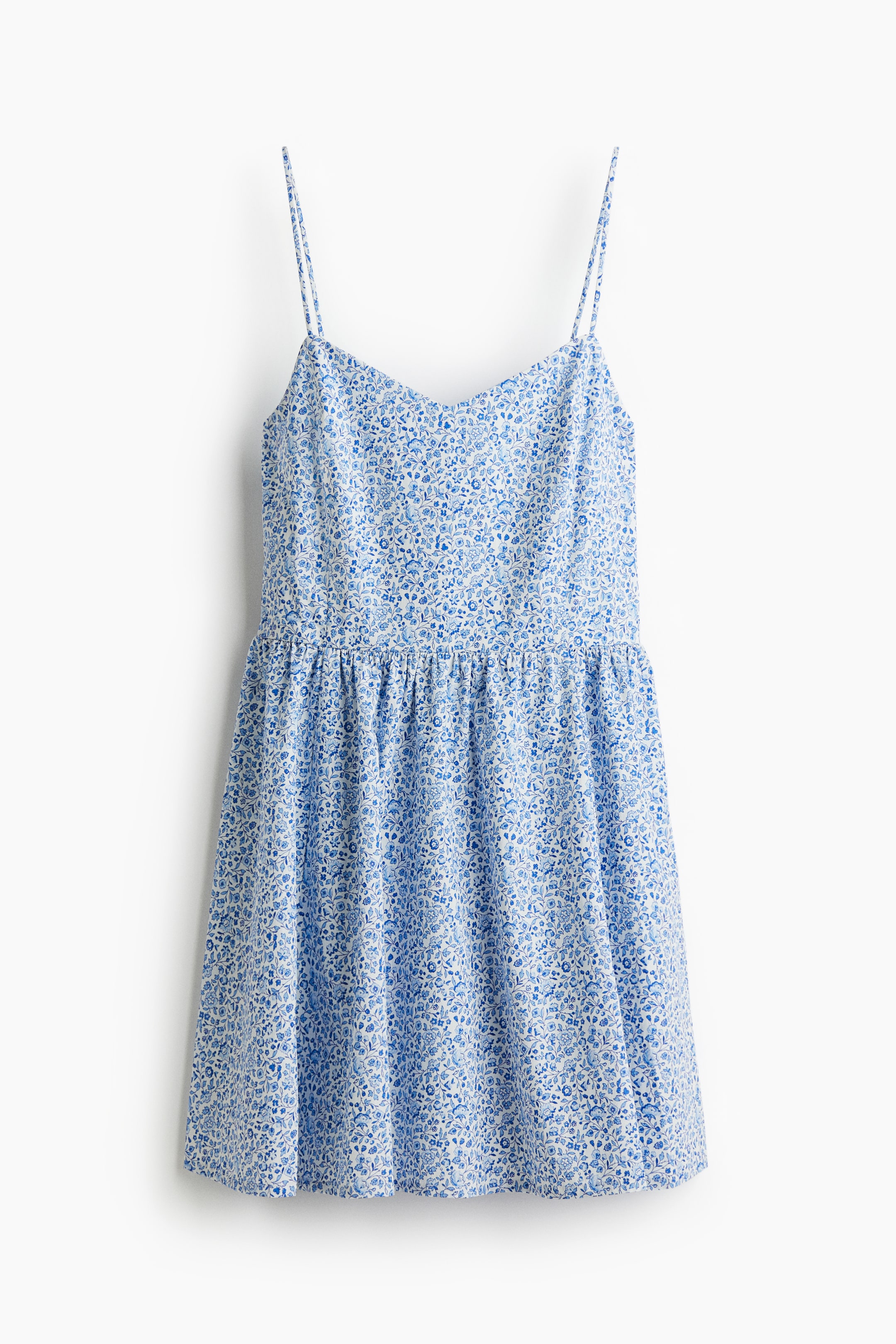 Kurzes Kleid aus luftigem Baumwollstoff mit figurbetontem Oberteil, Sweetheart-Ausschnitt, schmalen Trägern und breitem Smokeinsatz am Rücken. Geraffte Teilungsnaht mit Gummizug im Rücken und ein ausgestelltes Jupeteil. Ungefüttert.