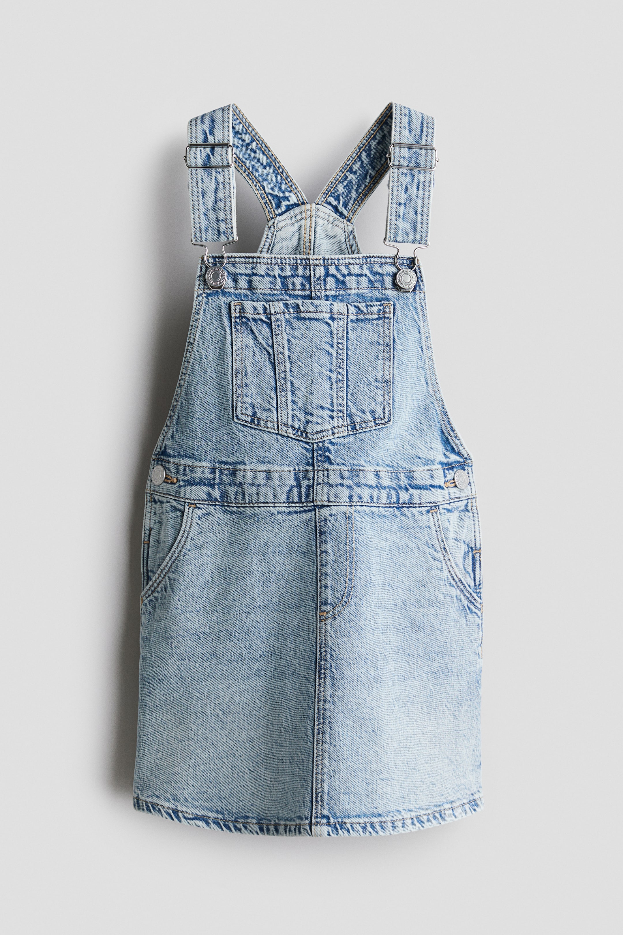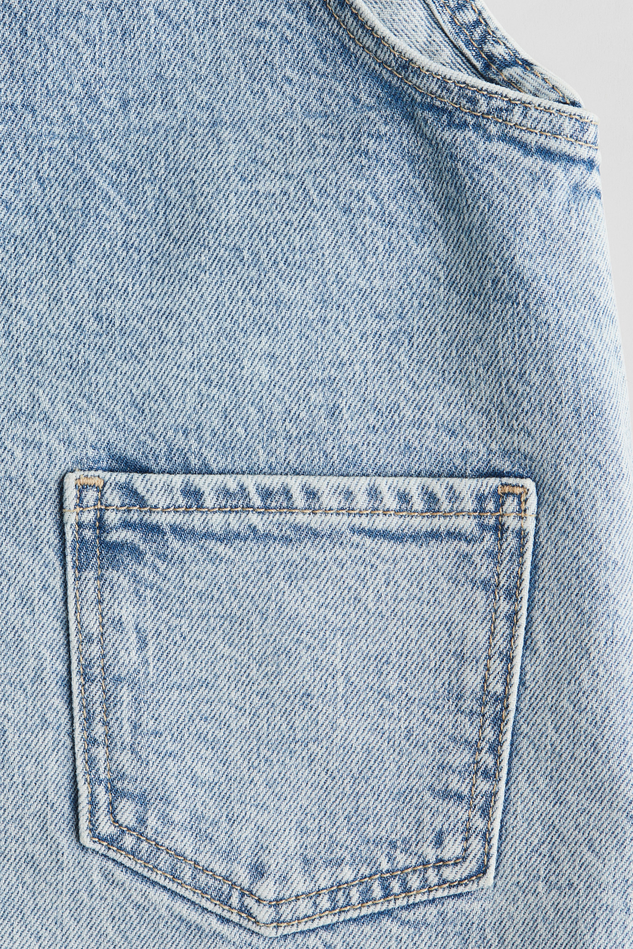Latzkleid aus Baumwolldenim. Verstellbare Träger mit Metallverschluss, eine Latztasche sowie Vorder- und Potaschen. Druckknöpfe an den Seiten. Fake Fly.