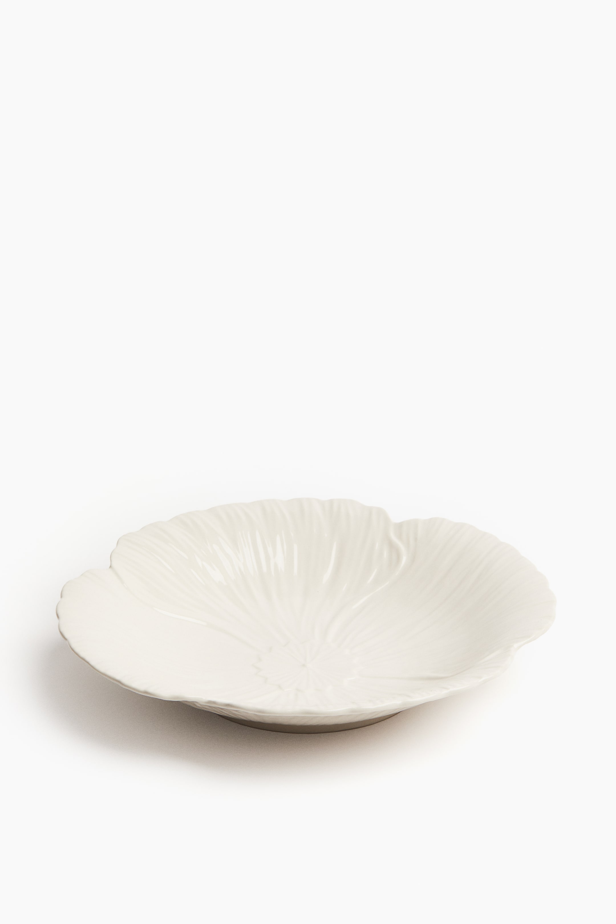Grosse, blütenförmige Servierschale aus glasiertem Steingut. Höhe 4 cm. Durchmesser 24 cm.