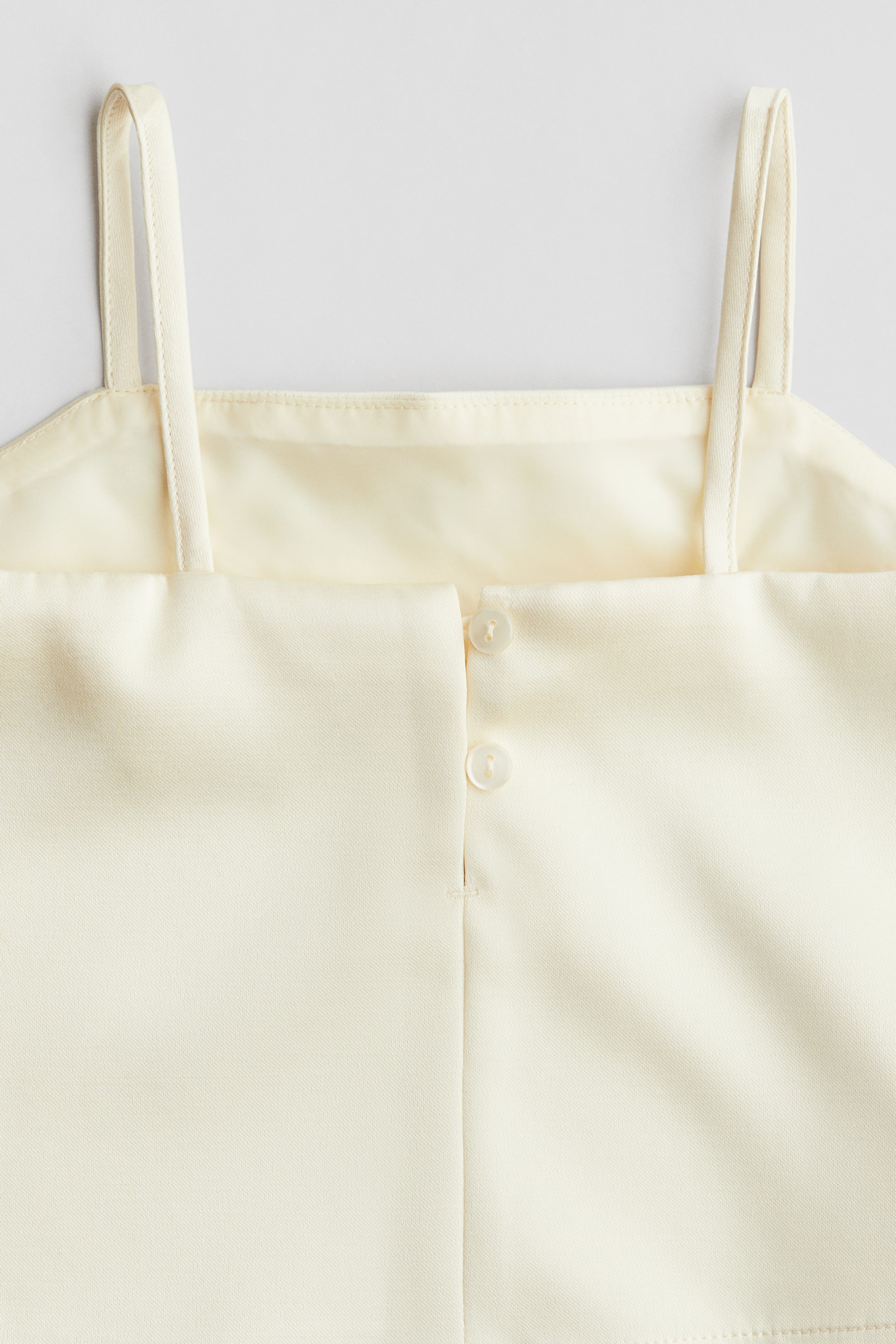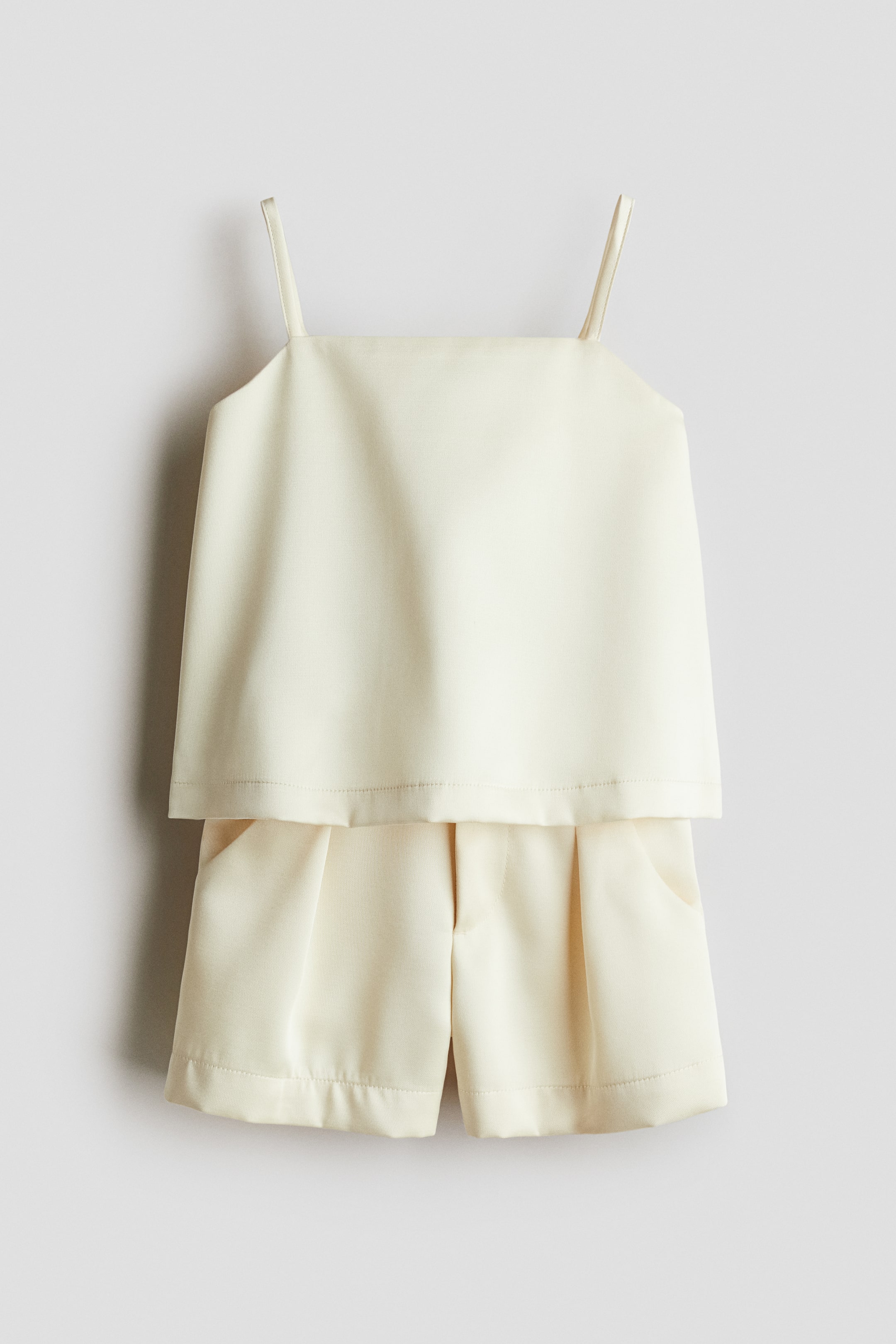 Set mit einem Trägertop und Shorts aus einem schimmernden Webstoff. Das Top hat eine gerade Ausschnittlinie und Knöpfe im Rücken. Dazu die Bundfaltenshorts mit verstellbarem Stretchbund, Zip Fly mit Knopf und schrägen Vordertaschen.