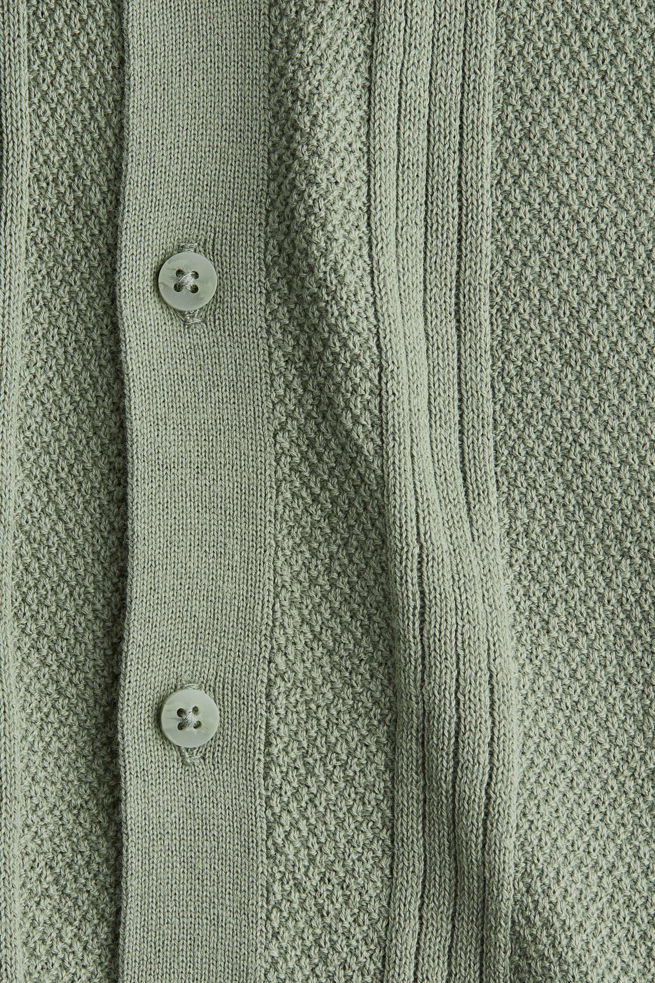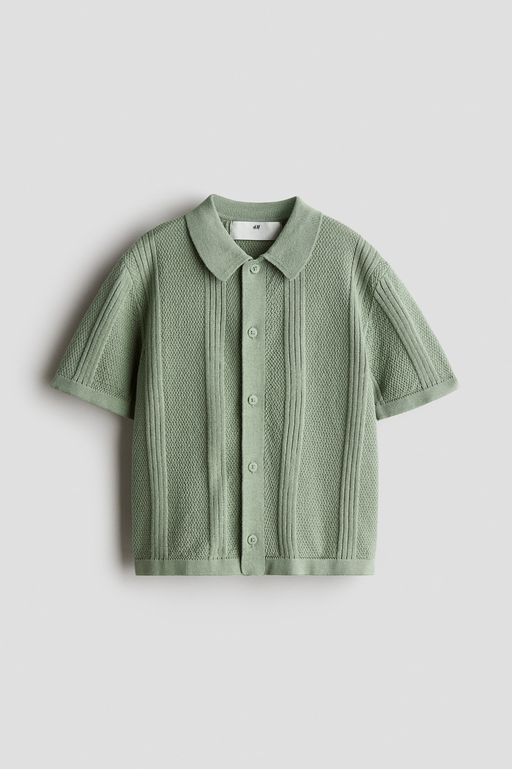 Durchgeknöpftes Baumwollshirt aus weichem Strukturstrick mit Umlegekragen, Kurzarm und locker Passform. Kragen, Ärmelabschlüsse, Saum und Knopfleiste in Feinstrick.