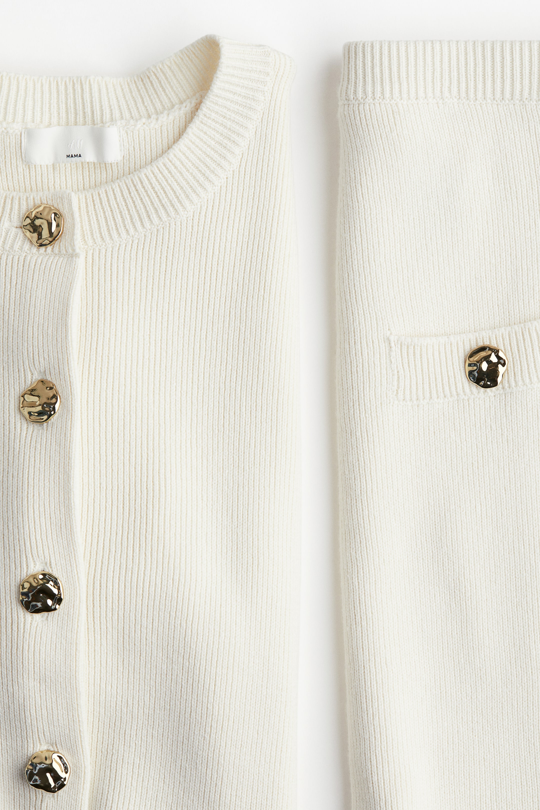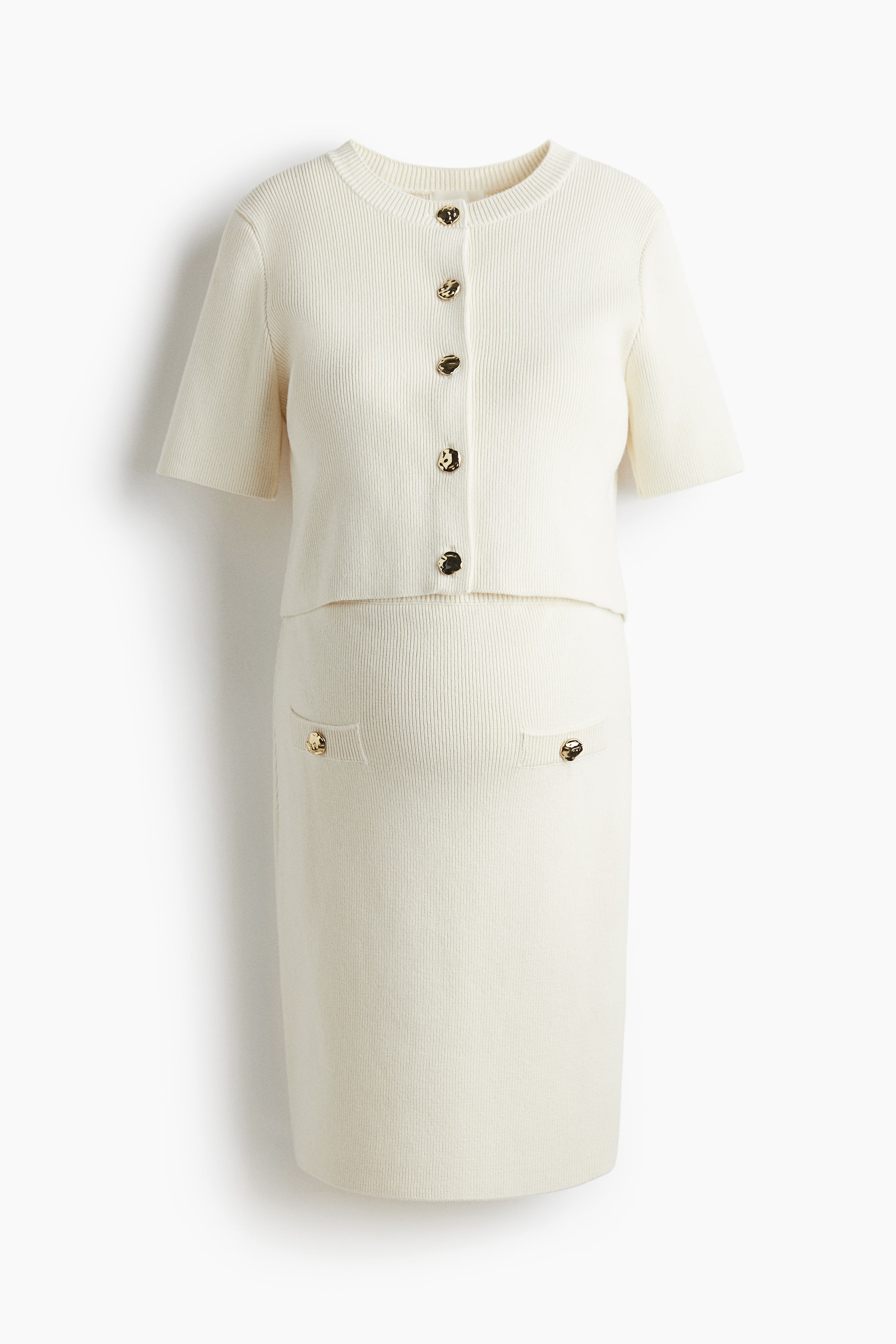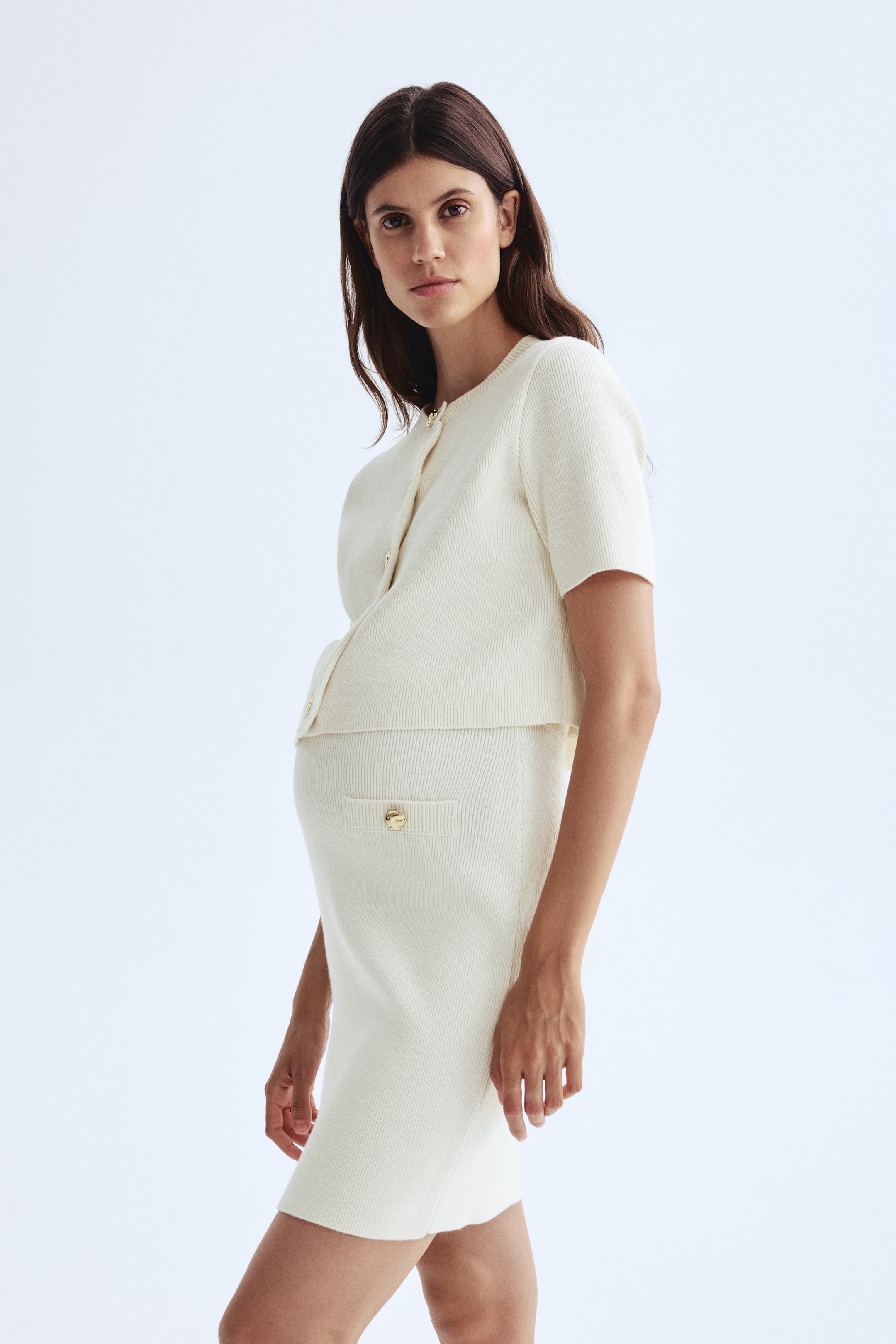 Baumwollset mit Cardigan und Jupe aus weichem Rippstrick. Cardigan mit geripptem Halsausschnitt, leicht gehämmerten Metallknöpfen und Kurzarm. Dazu der Jupe mit angedeuteten Leistentaschen mit einem gehämmerten Metallknopf und einem verdeckten Gummizug im Bund für die optimale Passform am Bauch.