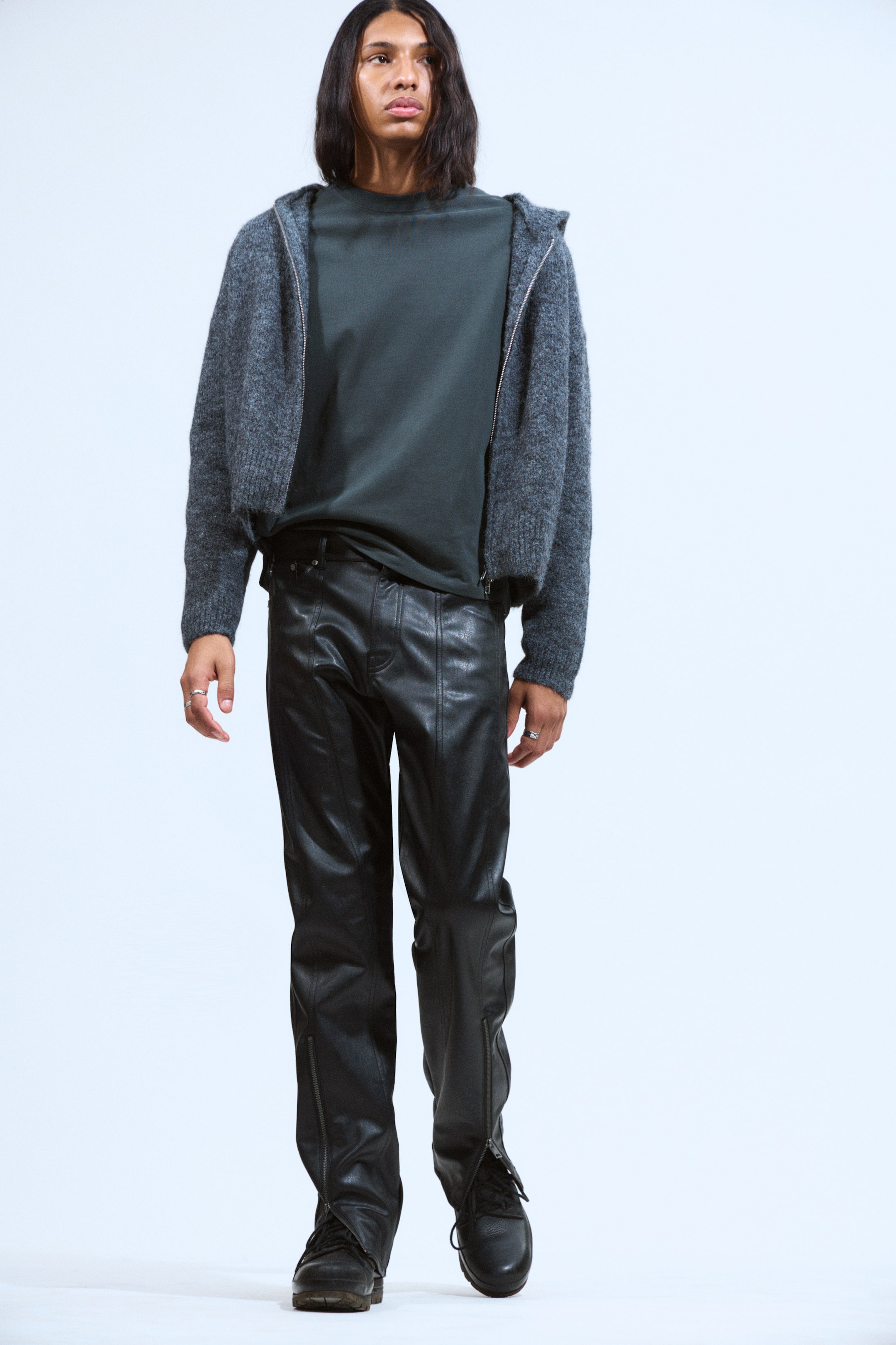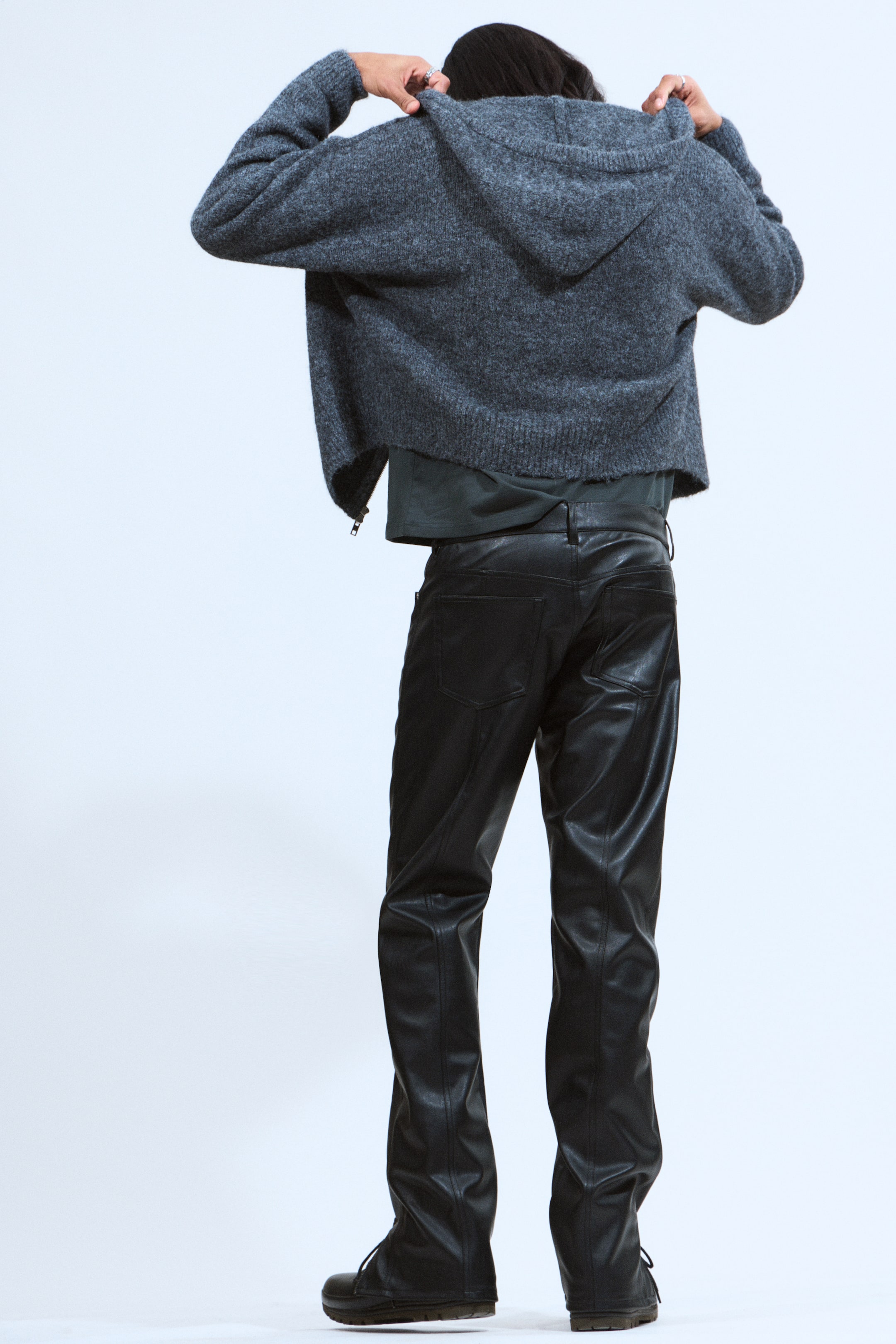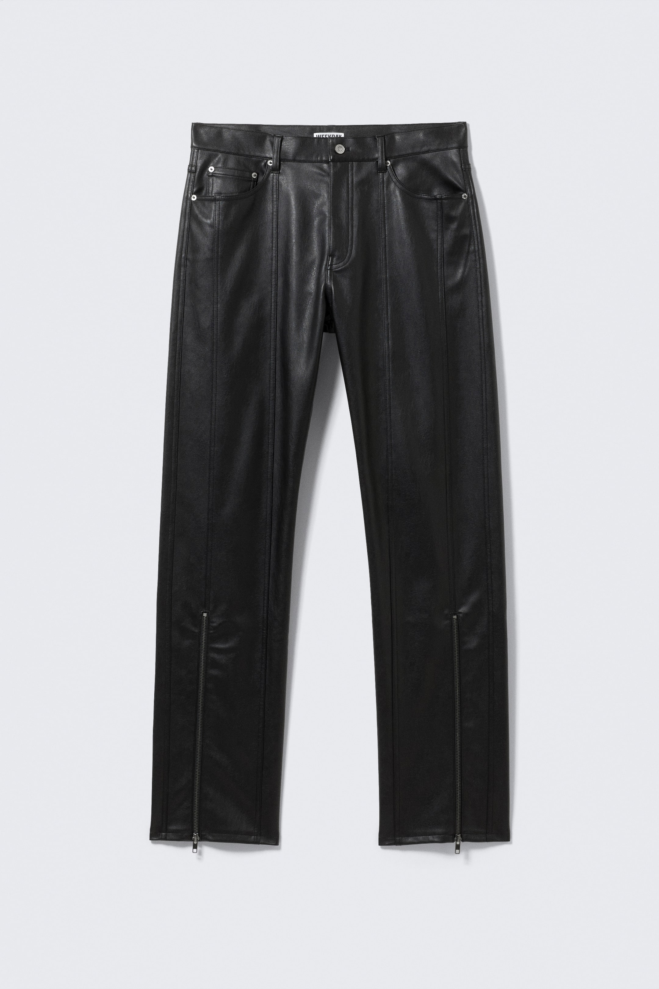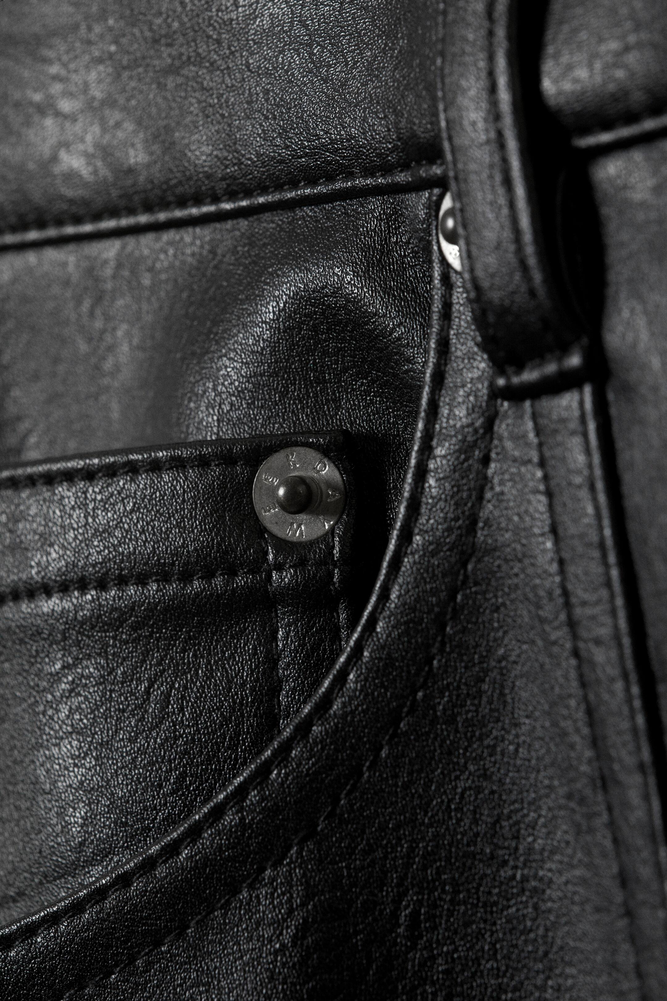 Eine Hose mit geradem Bein, relaxter Passform und Reißverschluss am Saum. Sie ist aus glattem Kunstleder gefertigt und verfügt über ein Fünf-Taschen-Design, Metallnieten und einen Hosenschlitz mit Reißverschluss. Sie ist eine moderne Interpretation unserer klassischen Space-Jeans.
