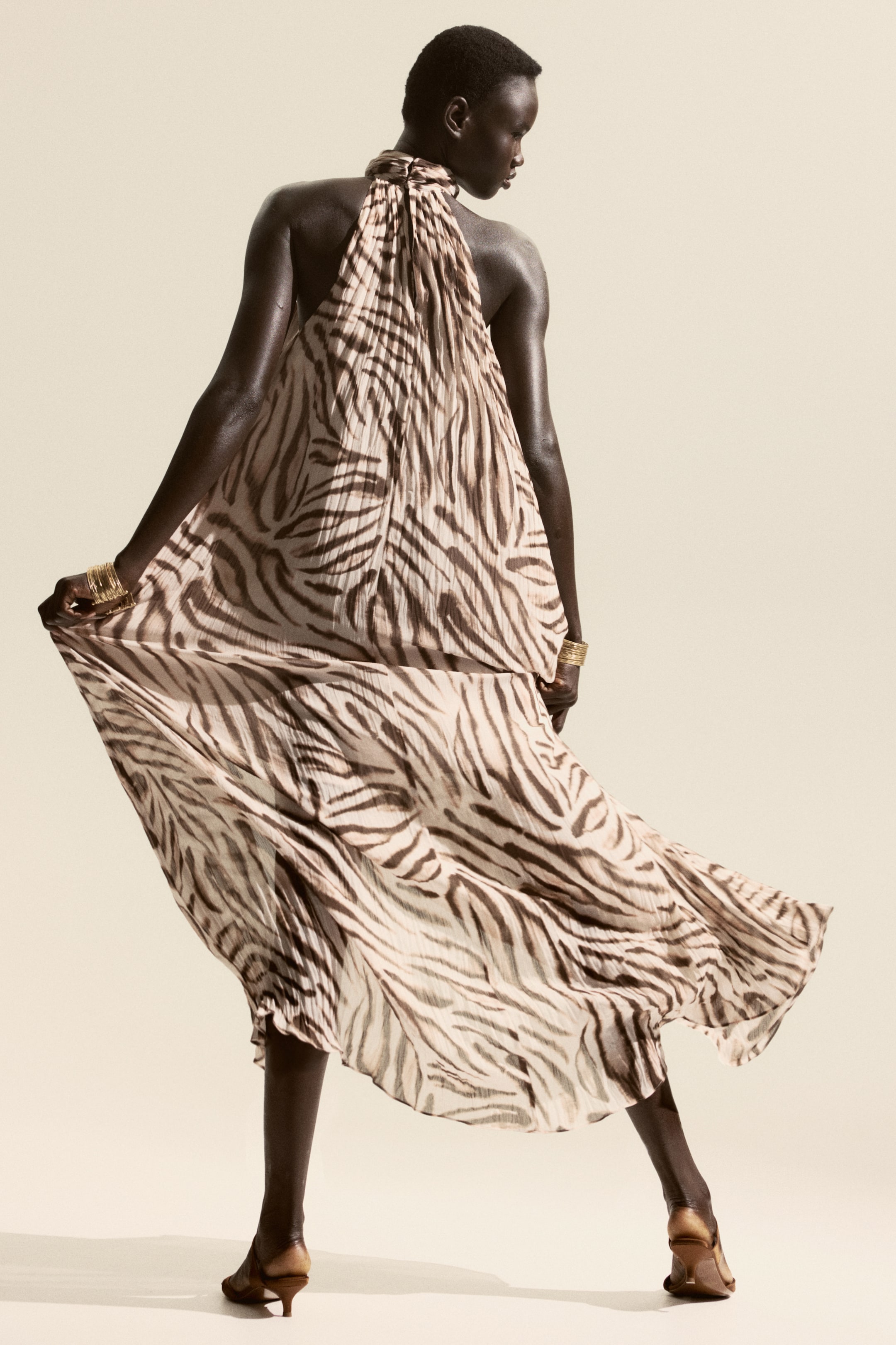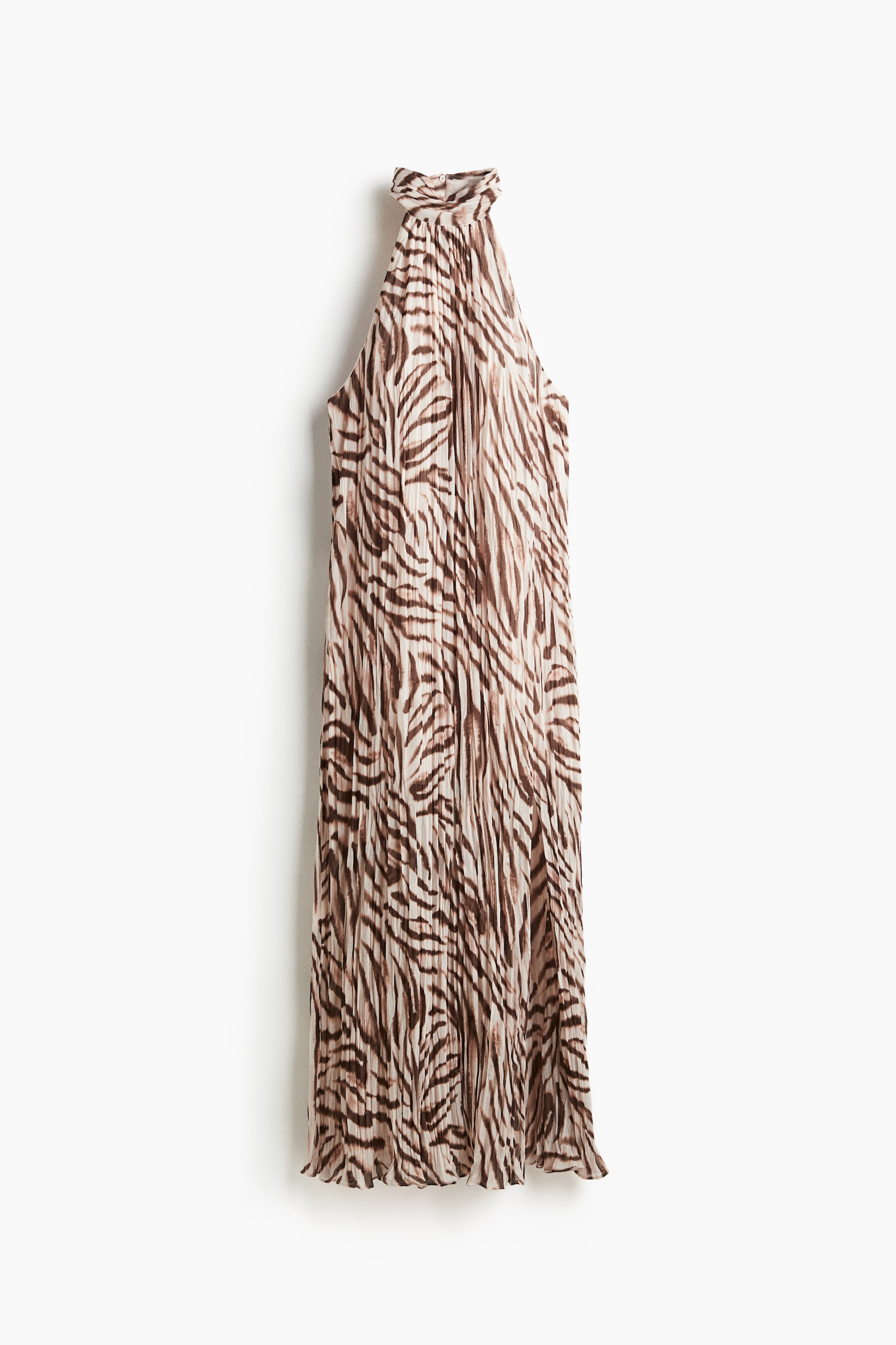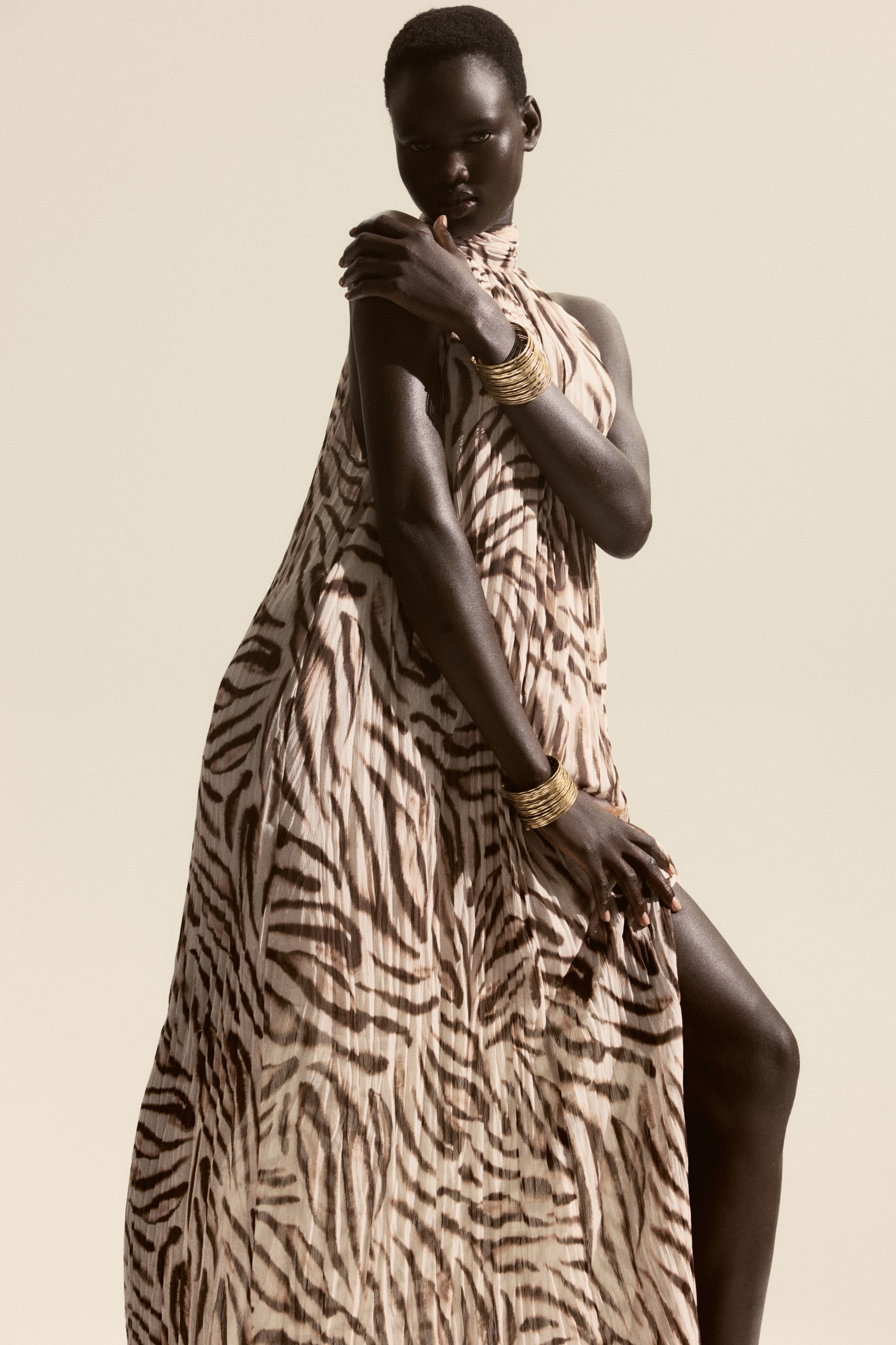 Langes, ärmelloses Kleid aus einem durchscheinenden Crinklestoff. Mit rundum gerafftem Stehkragen mit verdeckten Knöpfen im Nacken. Im Rücken eine tiefe Keyhole-Öffnung. Ausgestellte Silhouette mit Beinschlitz. Teilgefüttert.