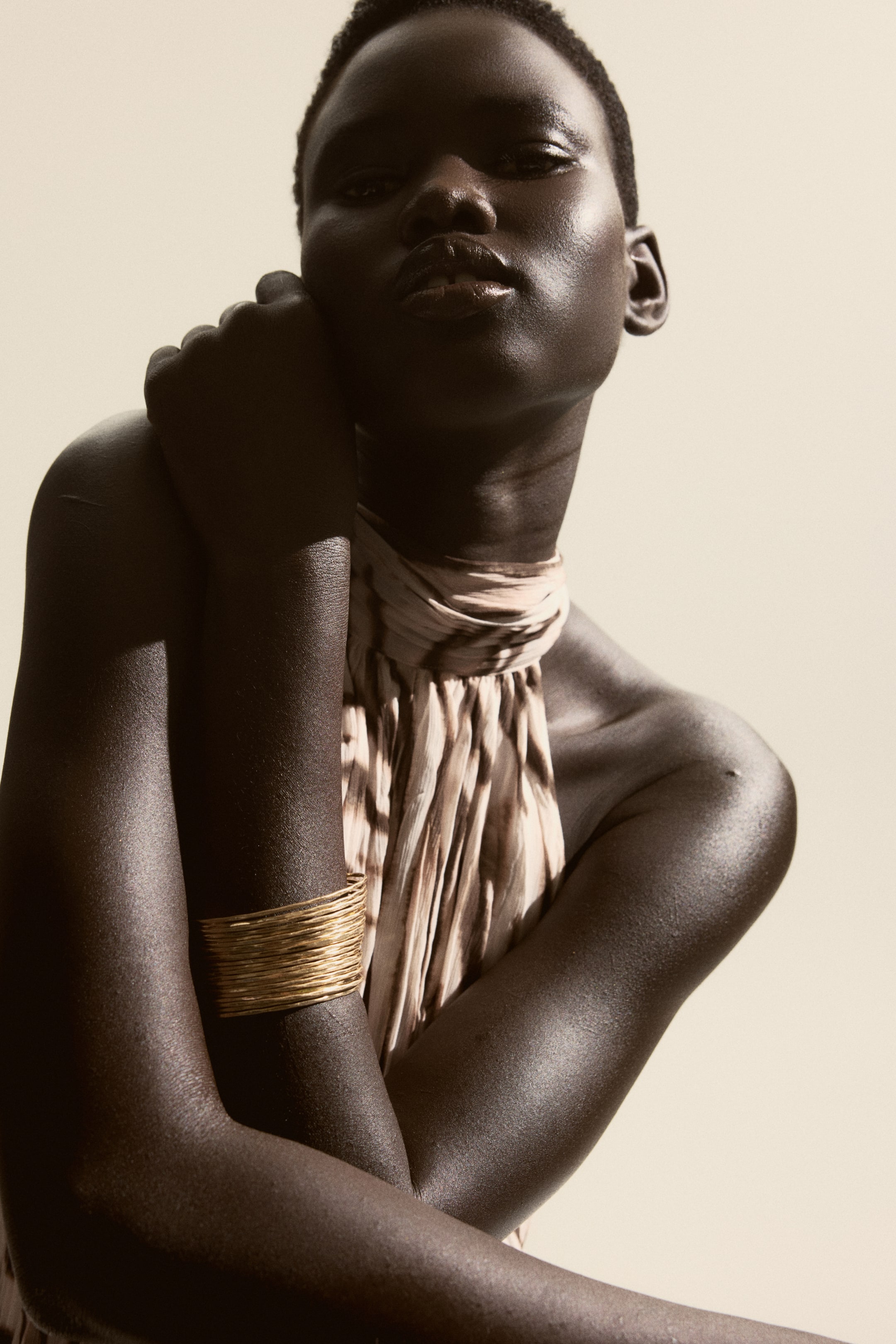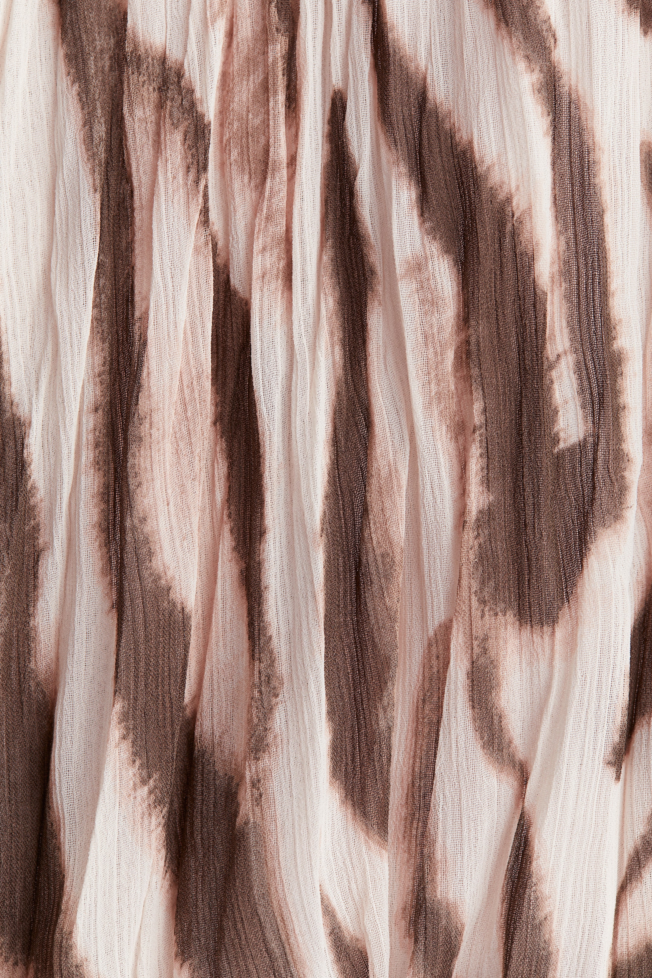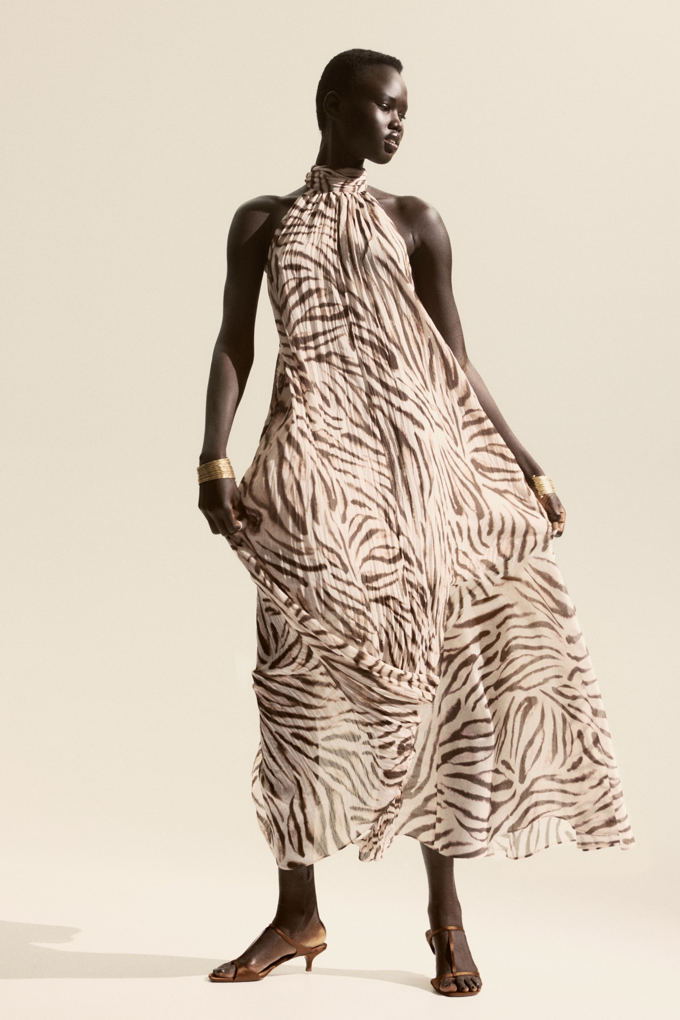 Langes, ärmelloses Kleid aus einem durchscheinenden Crinklestoff. Mit rundum gerafftem Stehkragen mit verdeckten Knöpfen im Nacken. Im Rücken eine tiefe Keyhole-Öffnung. Ausgestellte Silhouette mit Beinschlitz. Teilgefüttert.