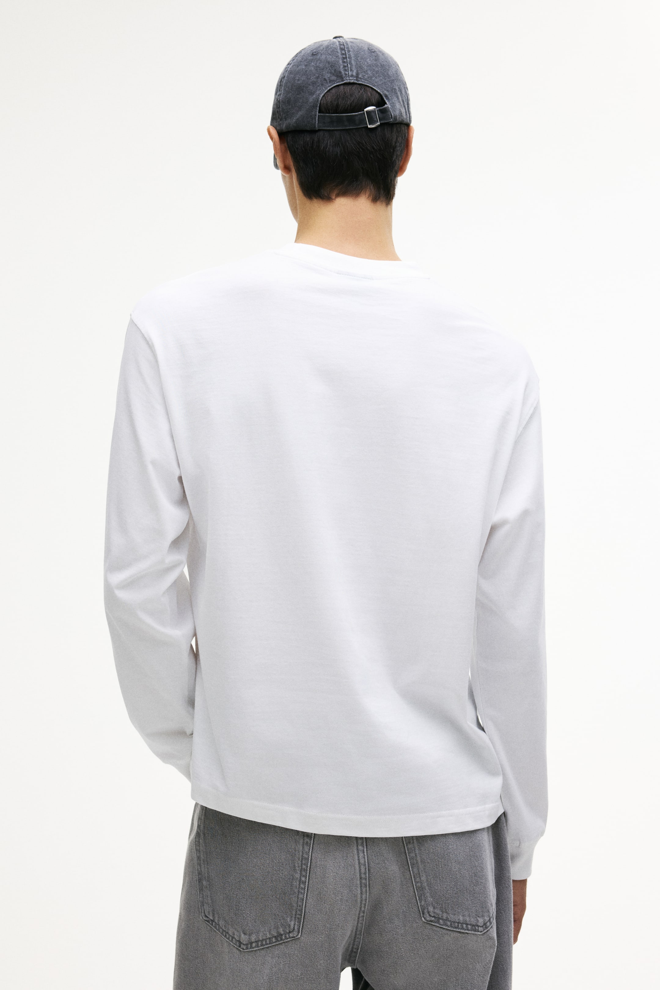 Shirt aus mittelschwerem Baumwolljersey mit geripptem Rundausschnitt, überschnittenen Schultern, gerippten Ärmelbündchen und geradem Saum. Lockere Passform mit einer grosszügigen, jedoch nicht oversized Silhouette.
