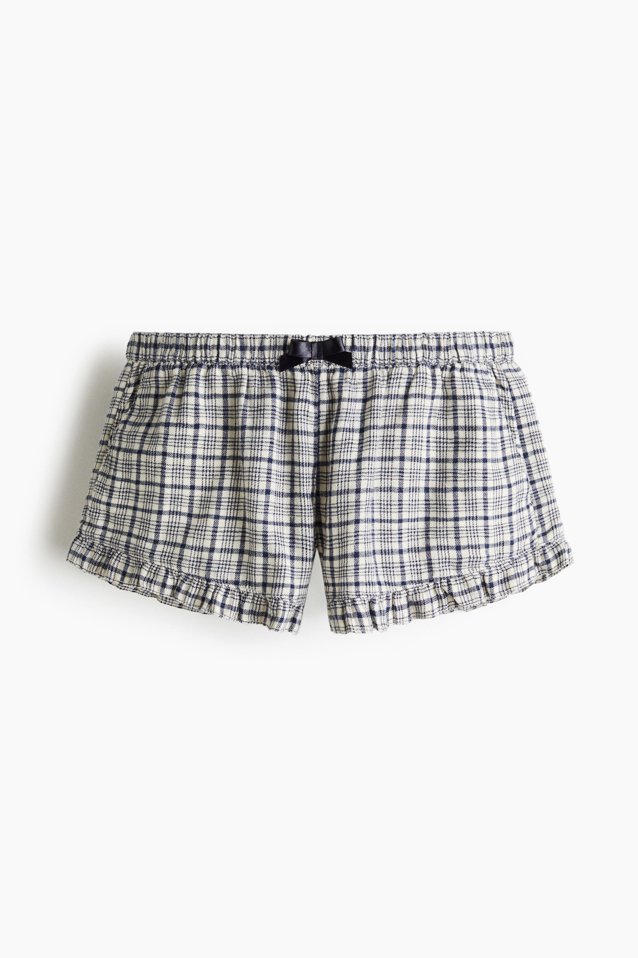 Shorts aus Baumwolltwill mit normaler Bundhöhe, verdecktem Gummizug und dekorativer Satinschleife vorne. Dezente Seitentaschen und ein Volantbesatz an den Beinabschlüssen.