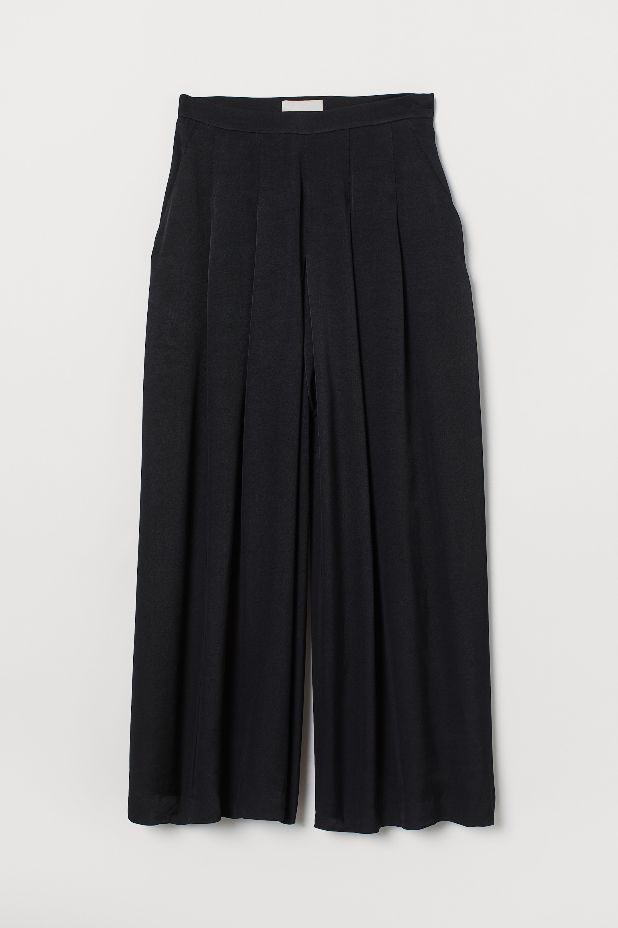 Bundfaltenhose aus Viskosestoff mit weitem, geradem Bein in 3/4-Länge. Modell mit hohem Bund, seitlichen Taschen und verdecktem Seitenreißverschluss.