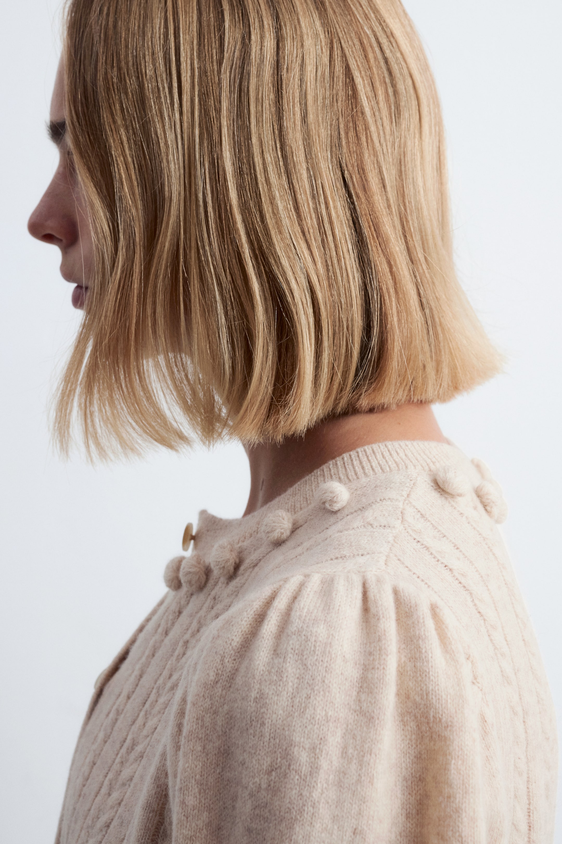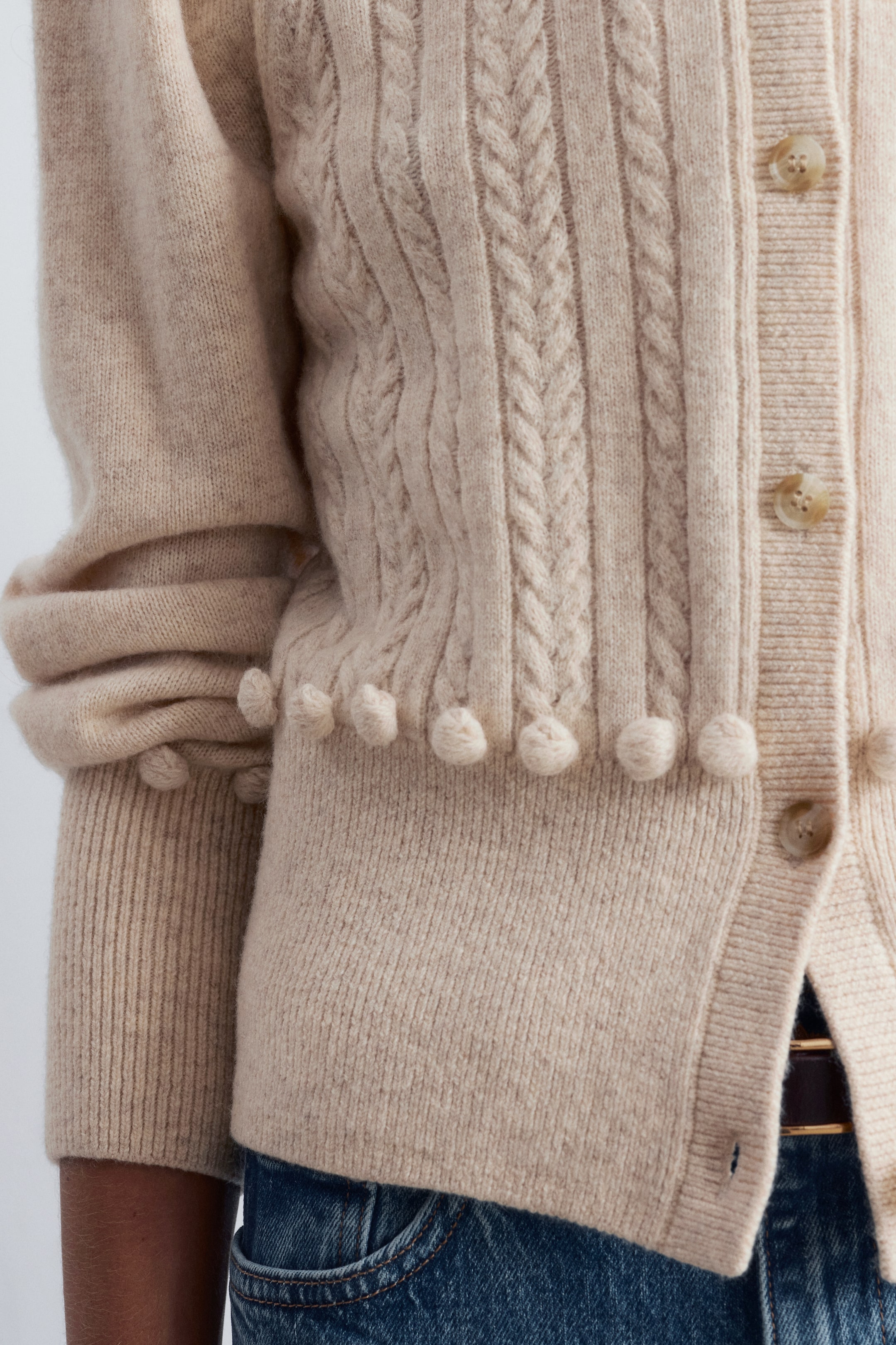 Cardigan aus Wolle mit Zopfmuster und Puffärmeln, gerippten Abschlüssen und Bommeldetails. • Knopfleiste • 100 % RWS-Wolle (TE-00047206) • Länge der Strickjacke:54 cm (EU 36/UK 8/US 4)