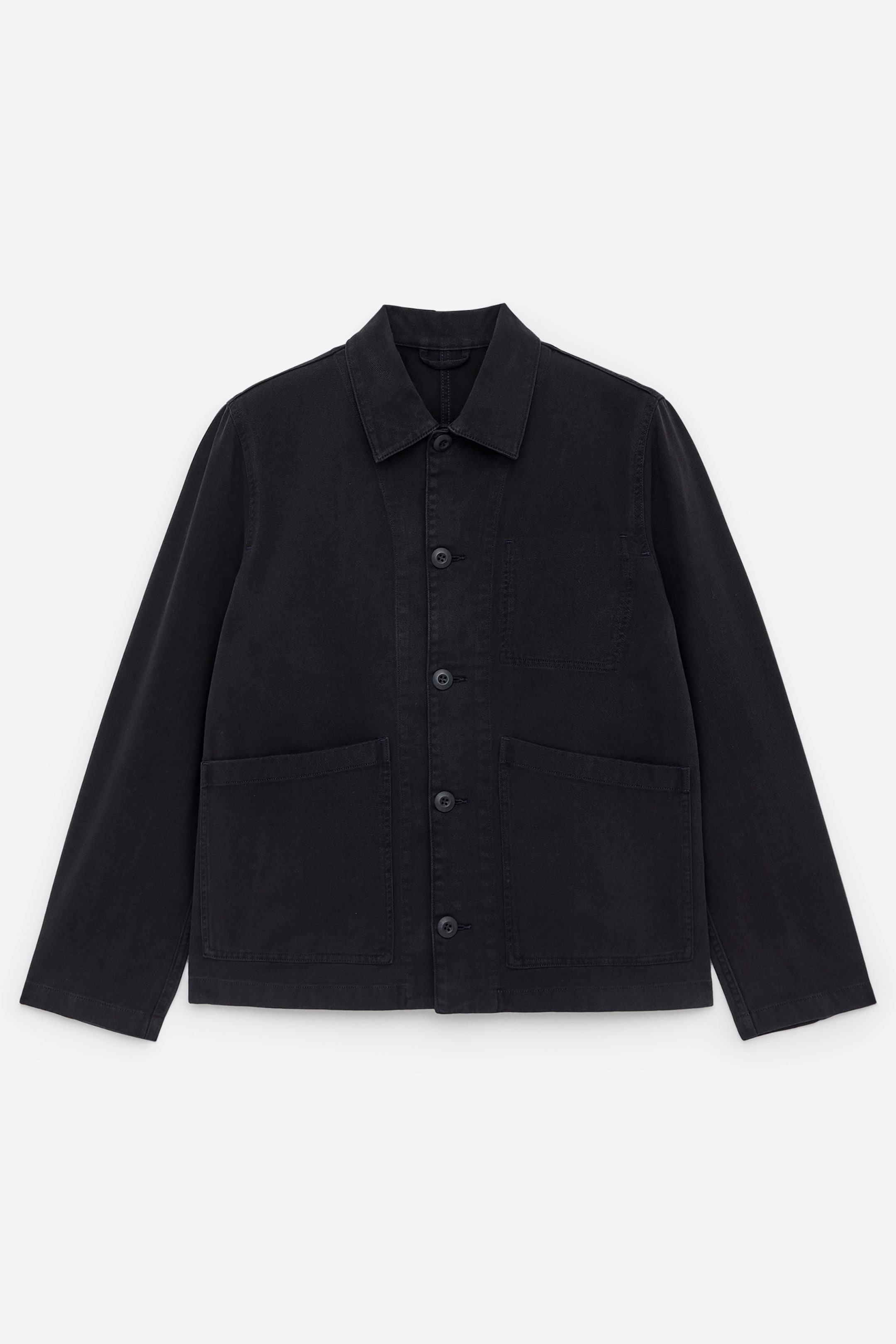 Baumwolljacke im Workwear-Look mit normalem Kragen, Knopfverschluss auf der Vorderseite und zwei großen aufgesetzten Taschen. Naht der Innentasche außen auf Brusthöhe sichtbar. Gerader Schnitt und normale Passform. Ungefüttert.