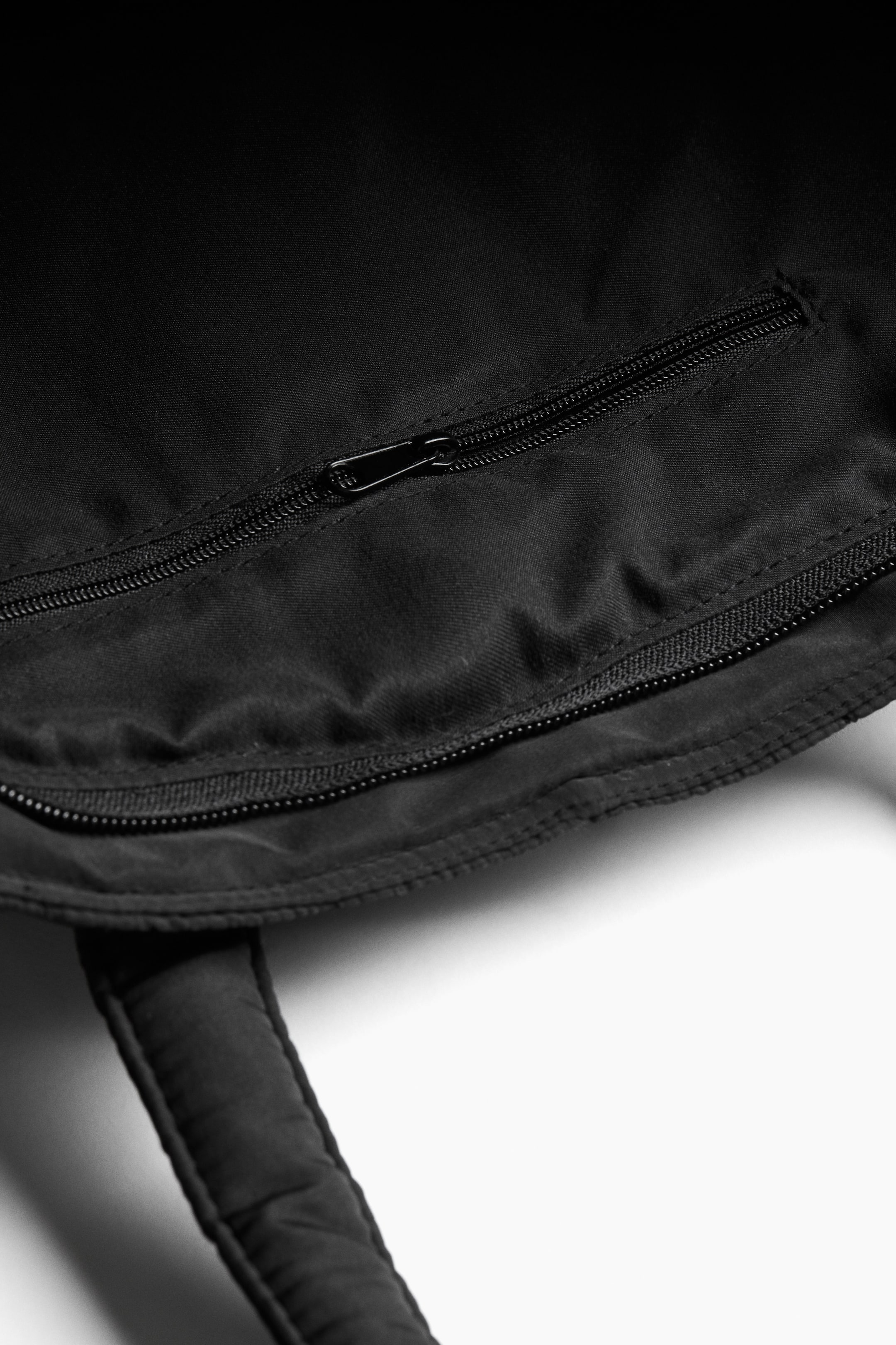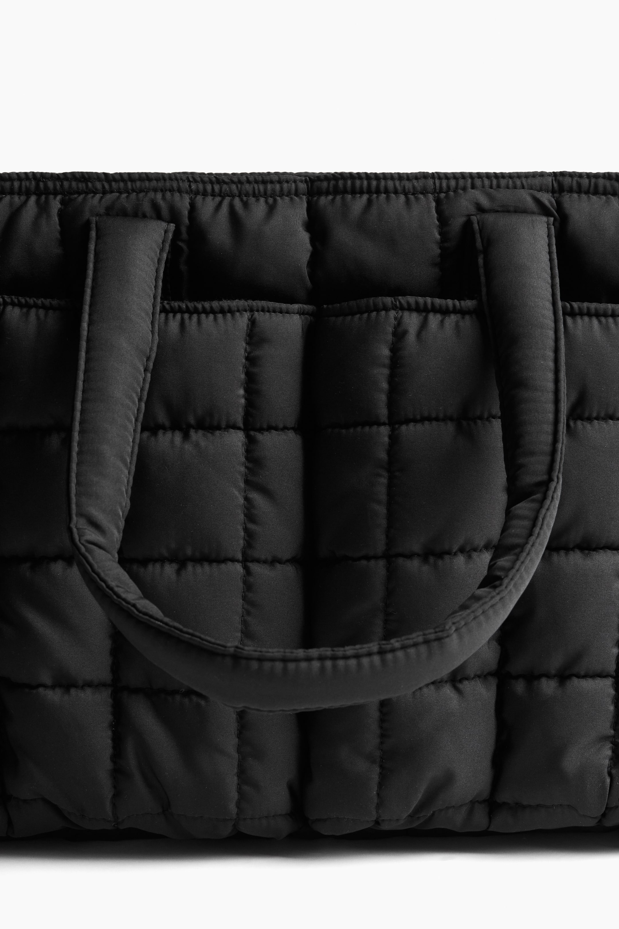 Stylische Wickeltasche aus Steppstoff mit diversen praktischen Fächern, in denen man beim Wickeln immer gleich das Gesuchte findet. Reißverschluss oben, zwei Tragegriffe und ein abnehmbarer, verstellbarer Schulterriemen. Tiefe 17 cm. Höhe 25 cm (ohne Griffe). Breite 40 cm. Gefüttert.