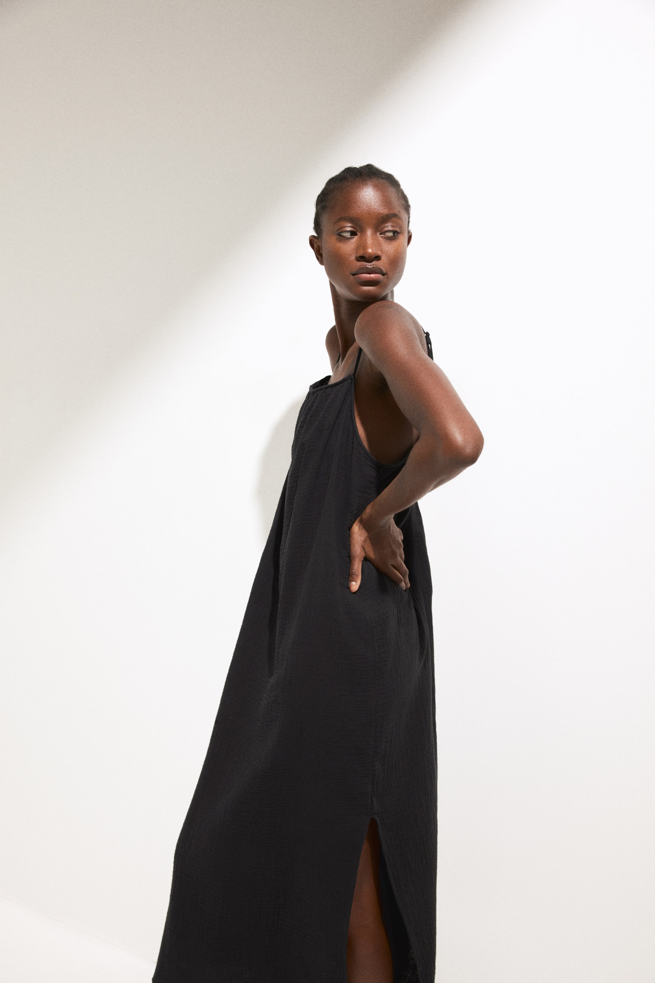 Knöchellanges Strandkleid aus weichem Baumwollmusselin mit schmalen, verstellbaren Trägern. Gerade Ausschnittlinie vorn und ein runder Rückenausschnitt. Gerader Saum mit hohen Seitenschlitzen. Lockere Passform.
