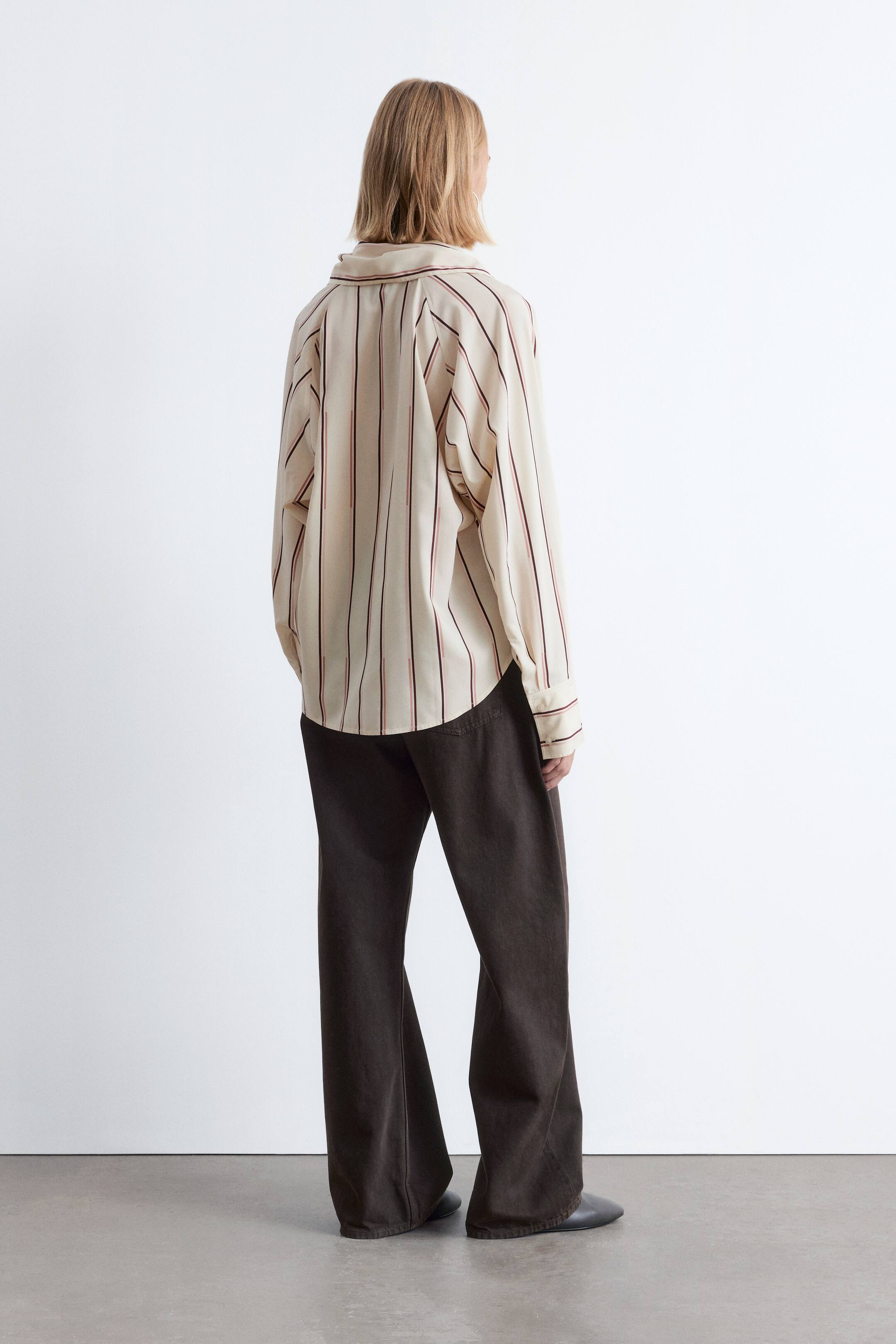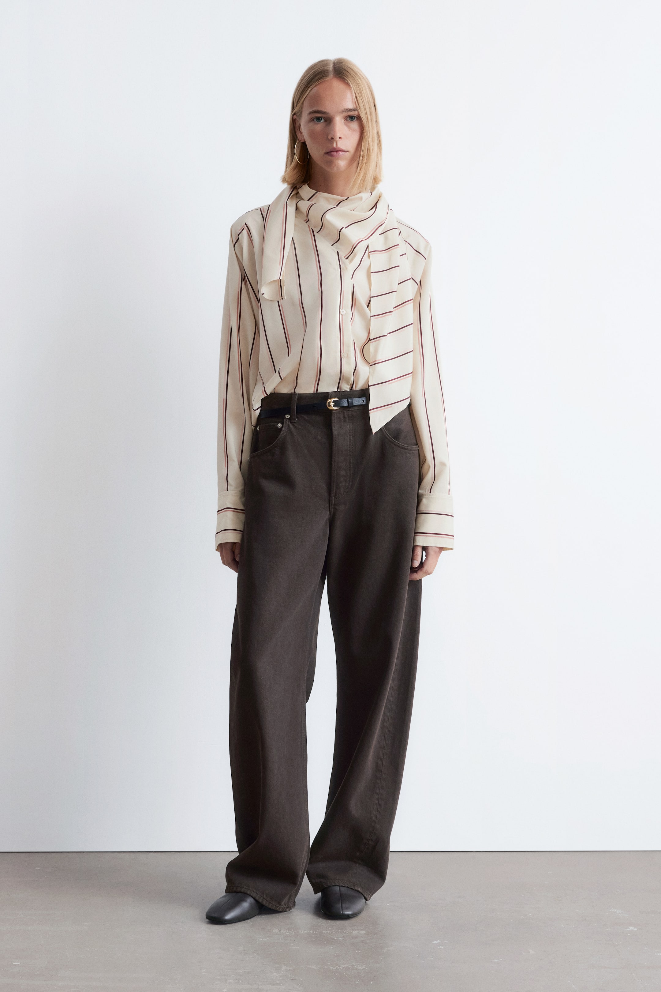 Dieses Hemd besteht aus einem griffigen, leichten Dobby-Stoff. Es hat eine lockere Silhouette, einen großen Schal, der über die Schulter fällt, eine dezente, leicht versetzte Knopfleiste und Raglanärmel mit geknöpften Manschetten. Länge des Hemds: 67,8 cm (Größe S)