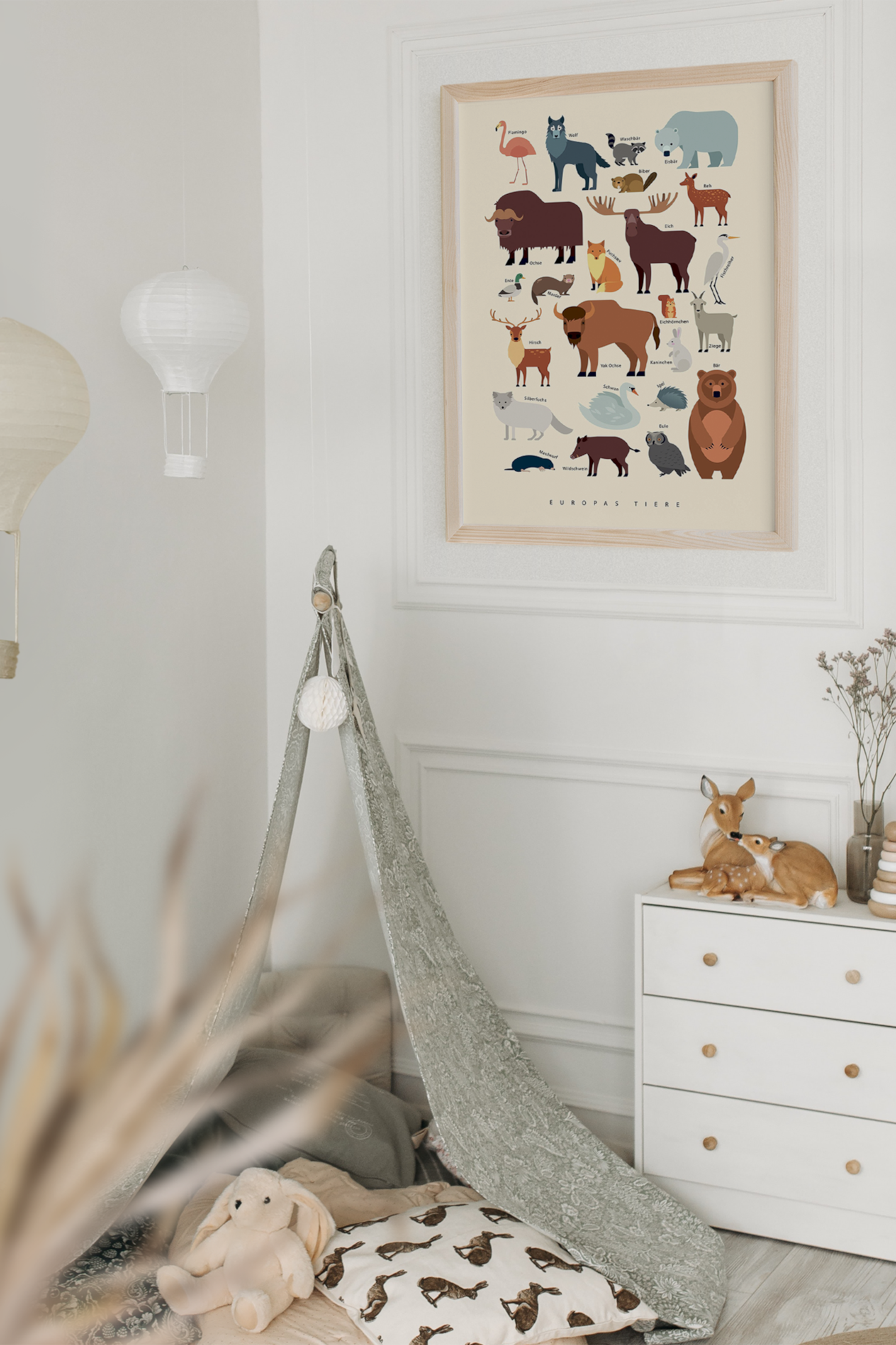Entdecke die Tierwelt Europas mit diesem bezaubernden Poster! Vom mächtigen Elch bis hin zum niedlichen Igel – das Poster ist voller detailreicher Illustrationen von Europas ikonischsten Tieren. Perfekt für Kinder, die die Natur kennenlernen und mehr über die Tiere erfahren möchten, die in unserer Umgebung leben.