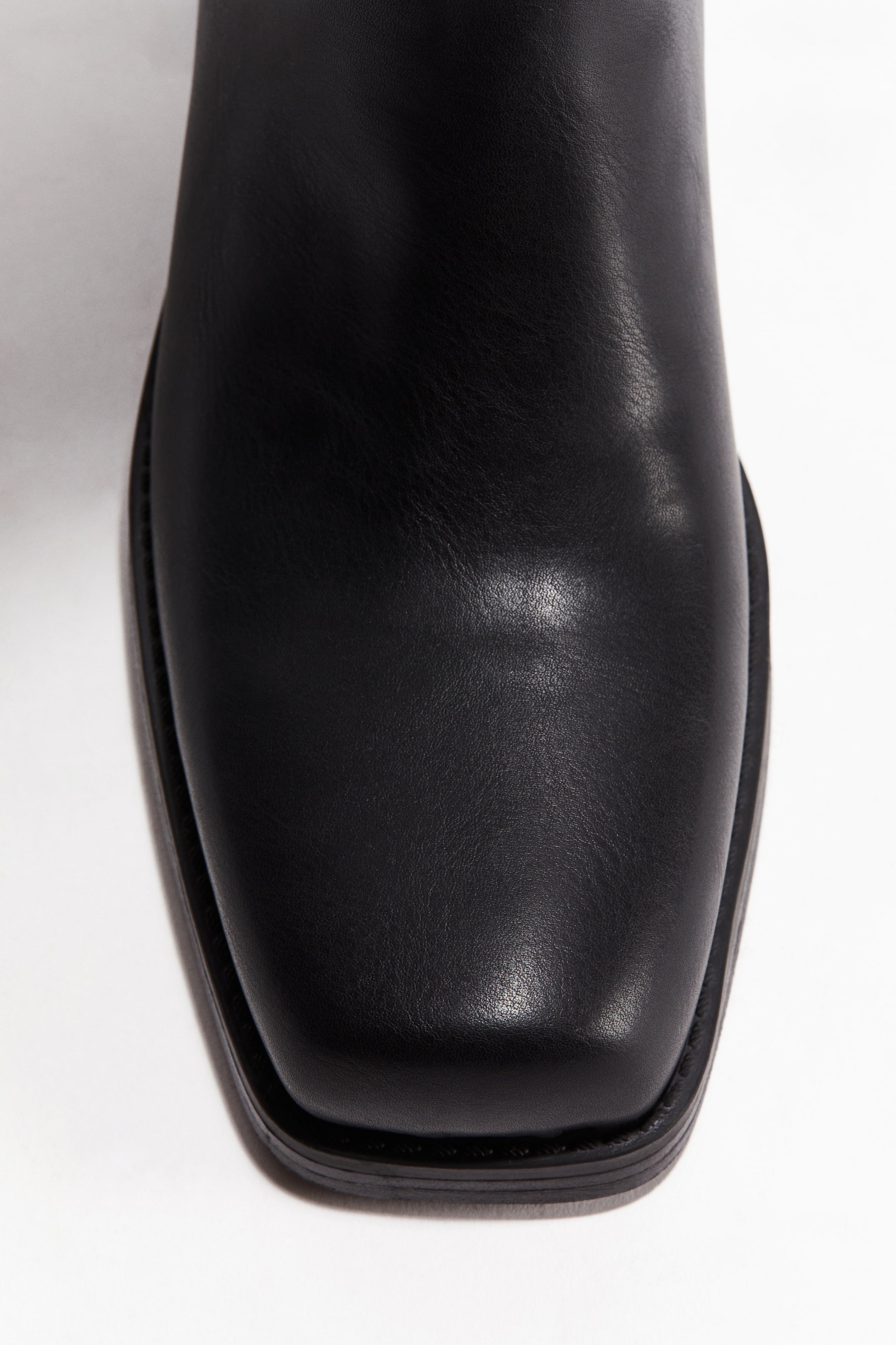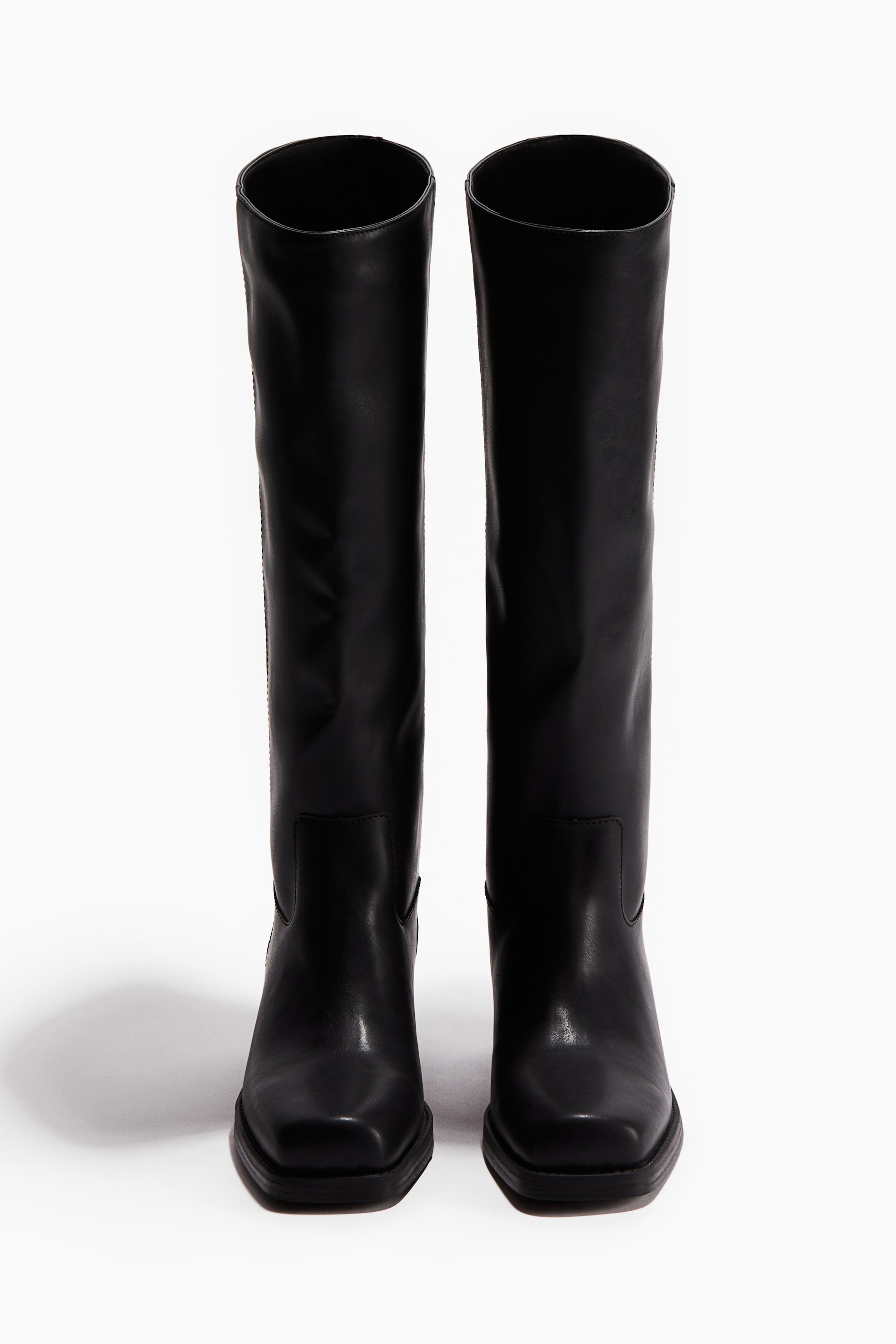 Bikerstiefel mit kniehohem Schaft, eckiger Spitze und Blockabsatz. Jerseyfutter.