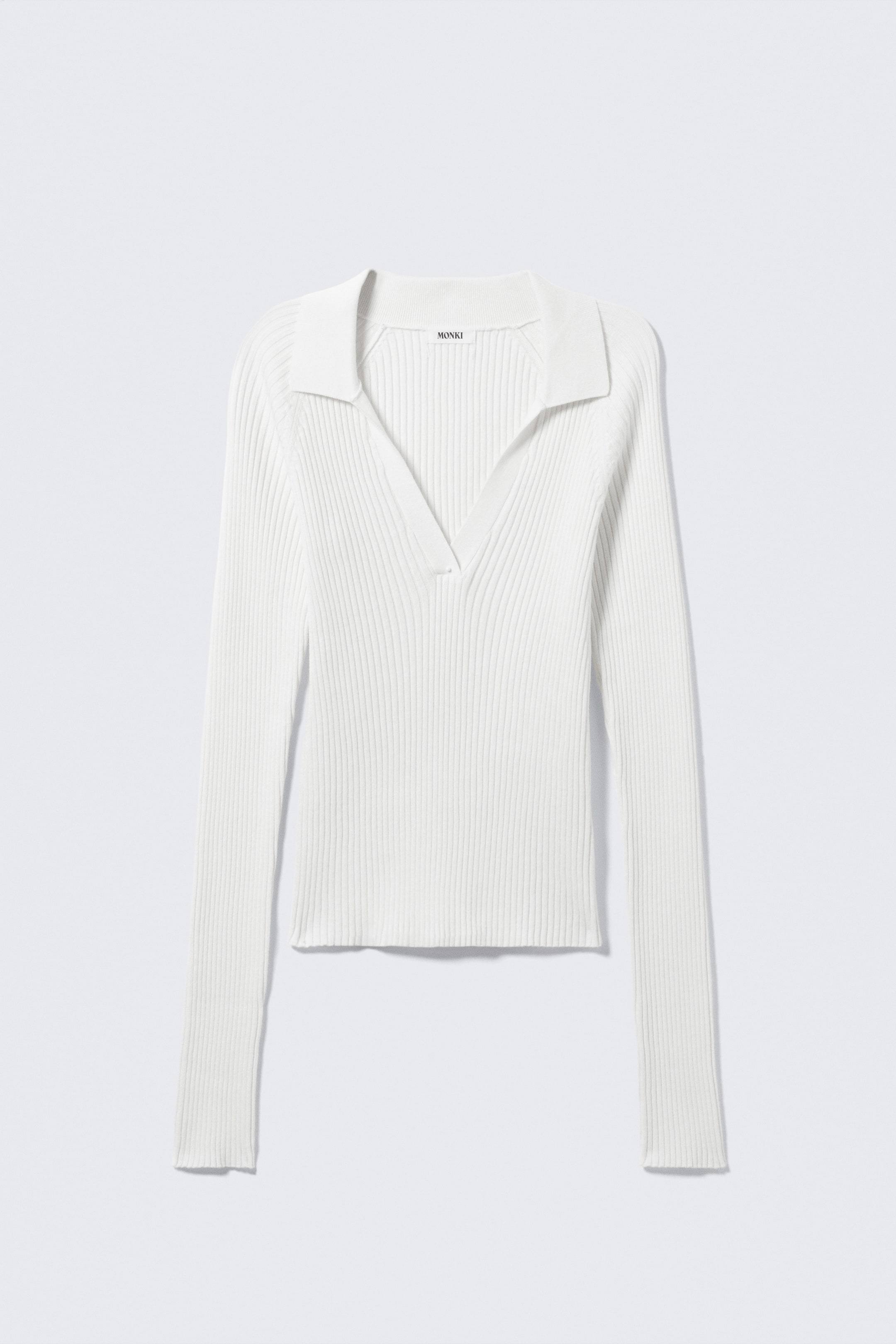 Ein langärmliges Top mit einer klaren, körperbetonten Silhouette und einer weichen, gerippten Textur. Aus weichem Baumwollgarn gestrickt, mit einem flachen Kragen und einem tiefen V-Ausschnitt für einen markanten, strukturierten Look, und Raglanärmeln.