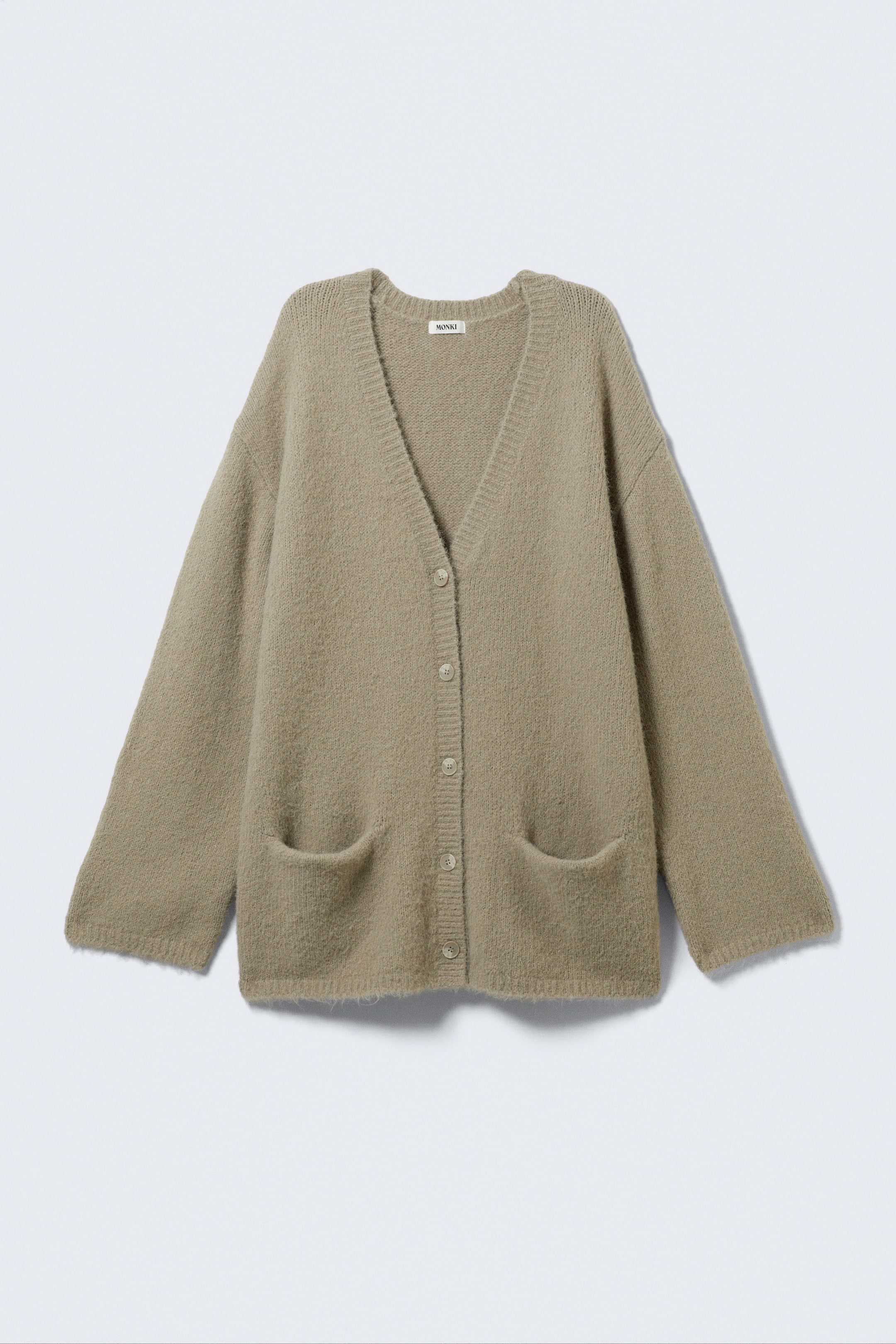 Eine Strickjacke mit V-Ausschnitt, gerippten Säumen, Knopfleiste und eingesetzten Taschen in oversized Passform. Hergestellt aus einer Mischung aus recyceltem Polyester, Polyamid und Wolle.
