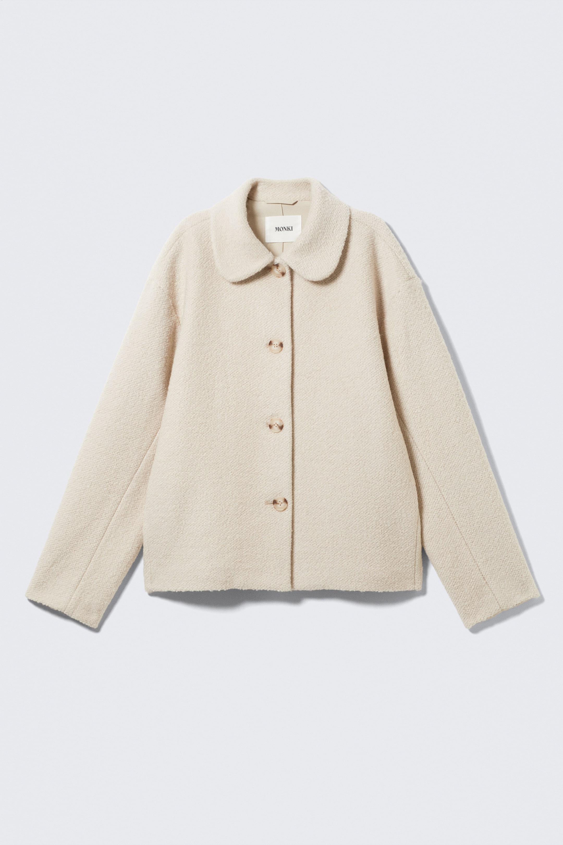 Eine kastige Jacke mit Knöpfen aus einem strukturiertem Wollmischgewebe. Sie hat einen abgerundeten Kragen, überschnittene Schultern und farblich abgestimmte Knöpfe. Das durchgehende Futter sorgt für zusätzliche Struktur und Wärme. Die weiche Außenschicht besticht durch ihren minimalistischen Look - Level up für deine Alltagsgarderobe.
