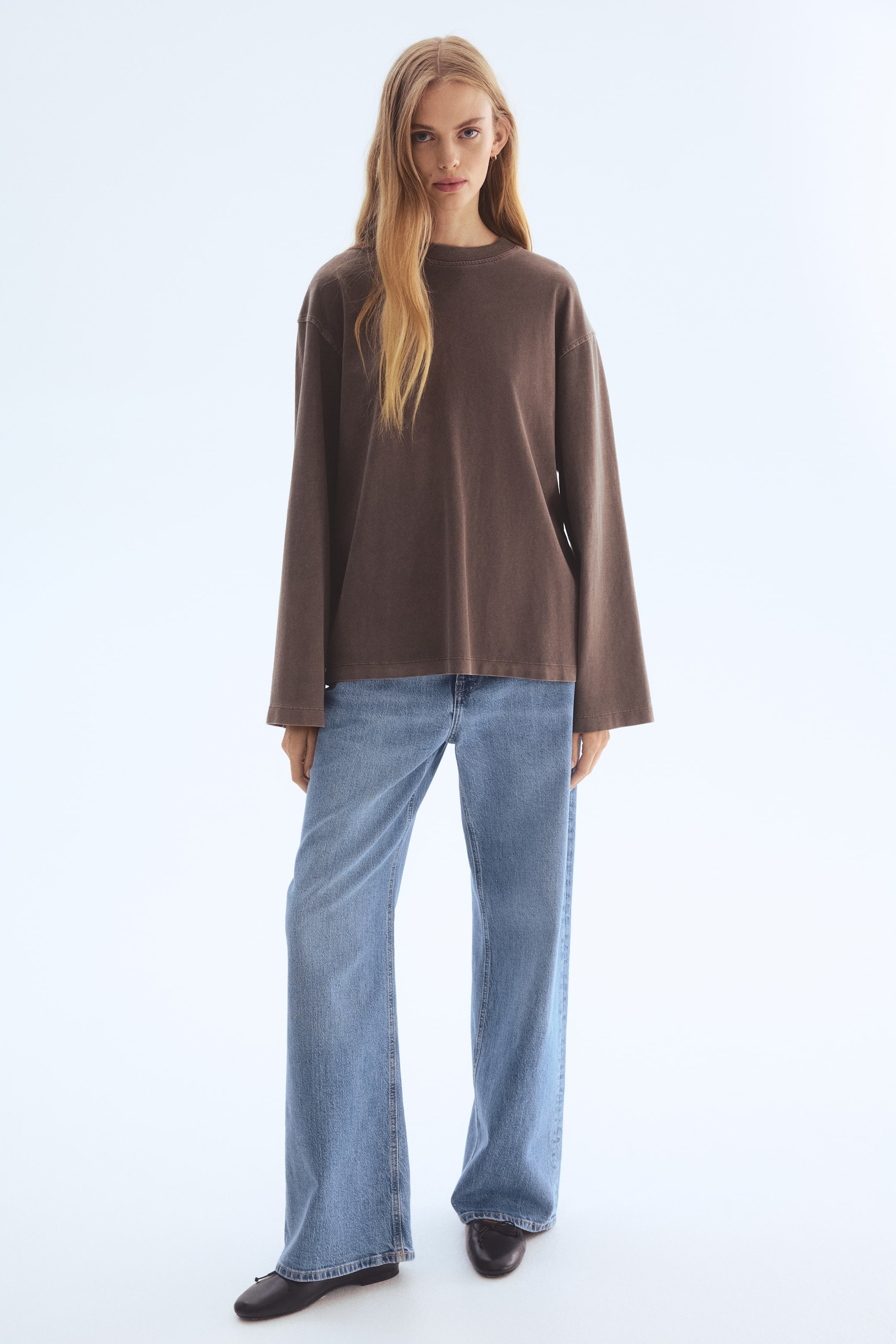 Shirt aus Baumwolljersey im Washed-Look. Lockere Passform. Modell mit Rundausschnitt, überschnittenen Schultern und Langarm.