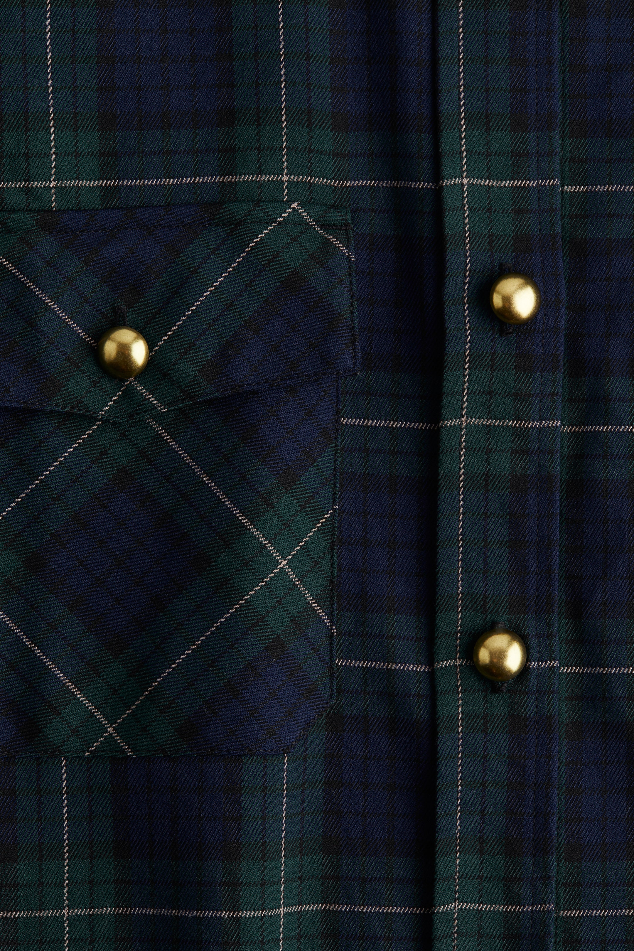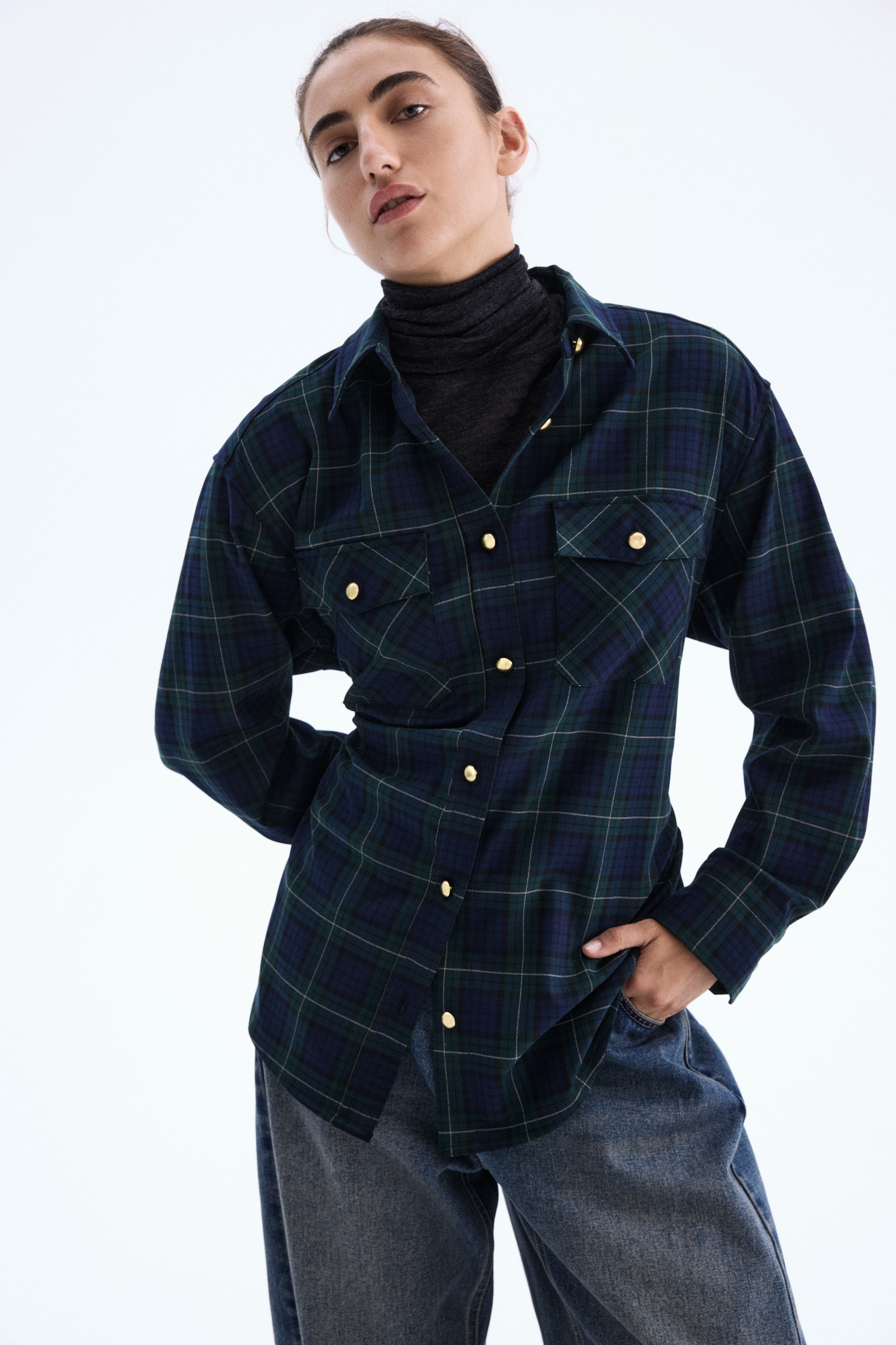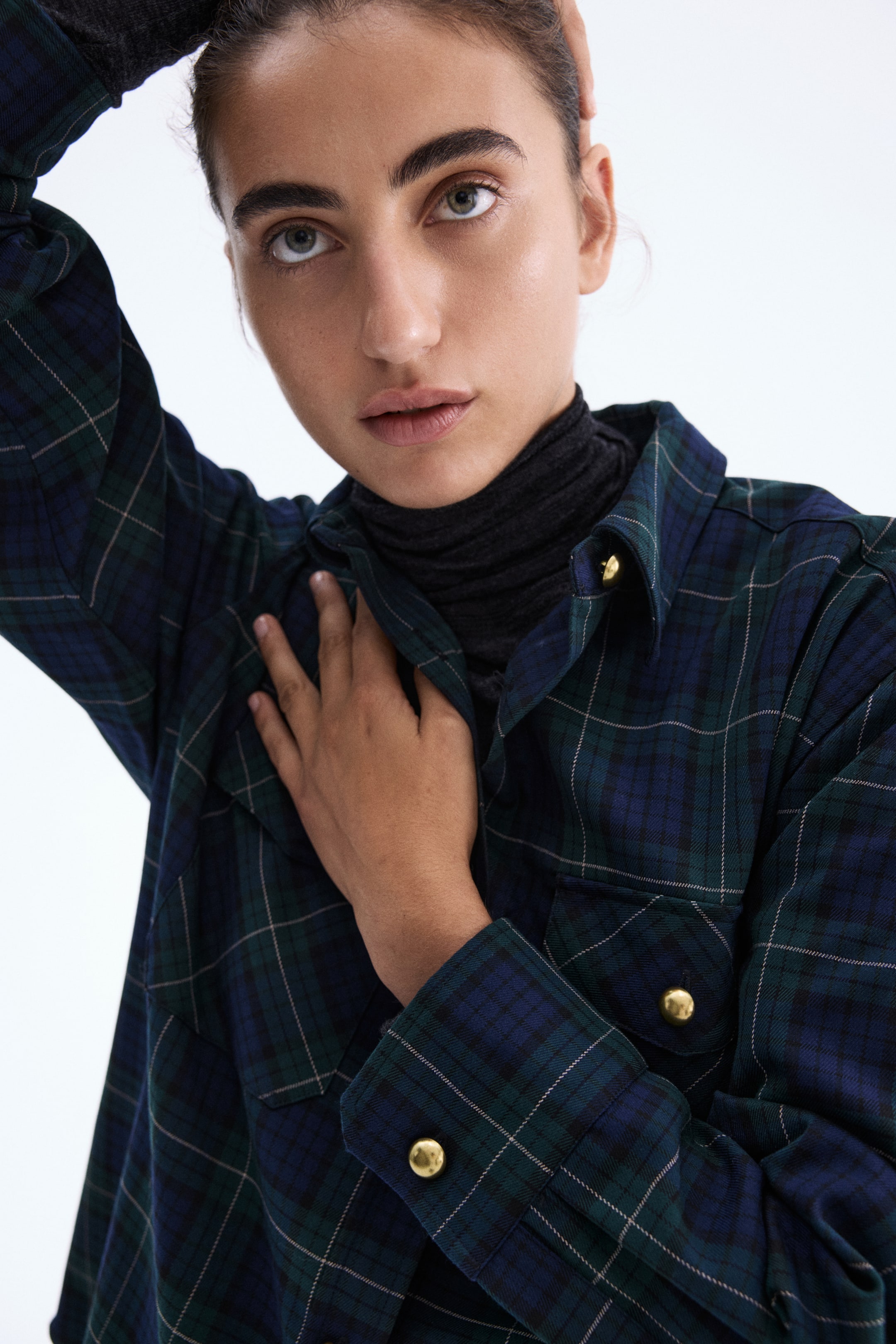 Πουκάμισο σε φαρδιά γραμμή από απαλή φανέλα με γιακά, κουμπιά μπροστά και ωμίτη. Τσέπες με καπάκι και κουμπί στο στήθος, χαμηλή μανικοκόλληση και μακρύ μανίκι με κούμπωμα στη μανσέτα. Ελαφρώς στρογγυλεμένο τελείωμα.