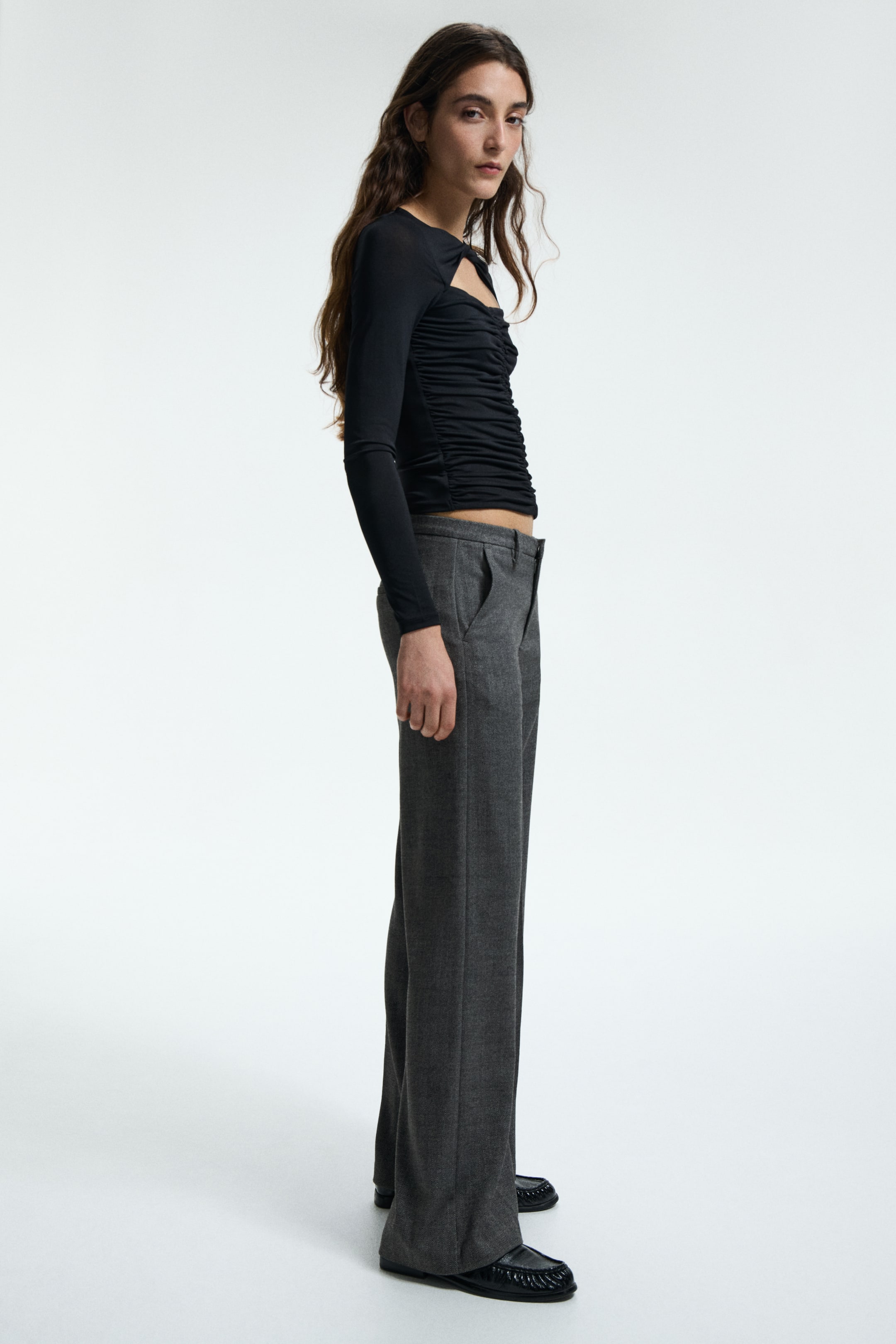 Κομψό παντελόνι με κλείσιμο με φερμουάρ, κρυφό κουμπί και κρυφή κόπιτσα. Λοξές τσέπες στα πλάγια, τσέπες-φιλέτο πίσω και φαρδιά γραμμή με τσάκιση κάθετα μπροστά.