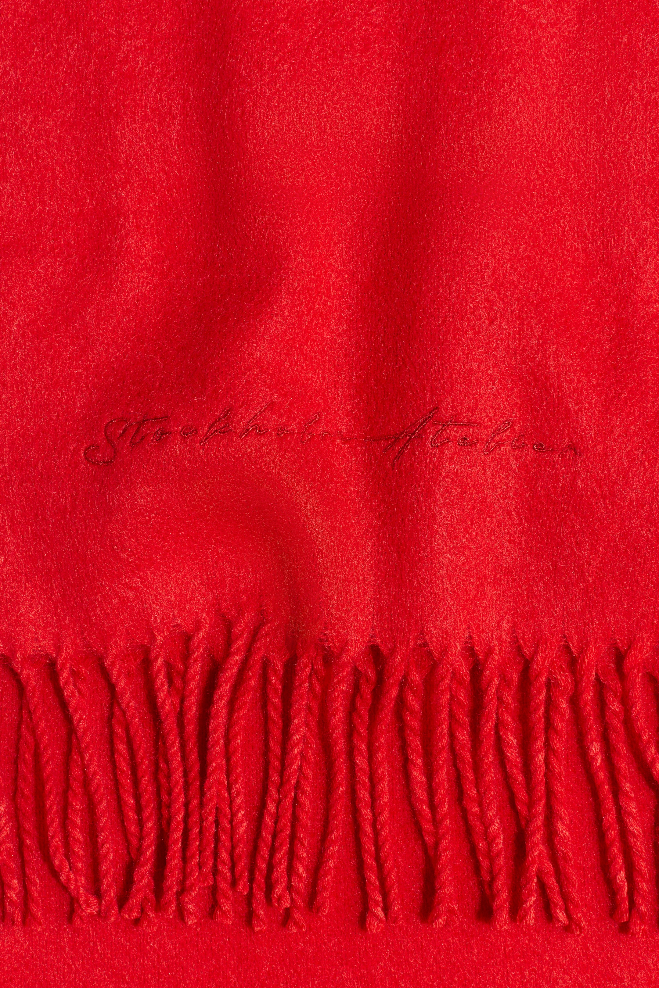 Κασκόλ με μαλακή ύφανση, χνουδωτή υφή και ακανόνιστες άκρες. Γραπτό κεντημένο σχέδιο στην ίδια απόχρωση στο ένα άκρο και στριφτά κρόσσια στις στενές πλευρές.