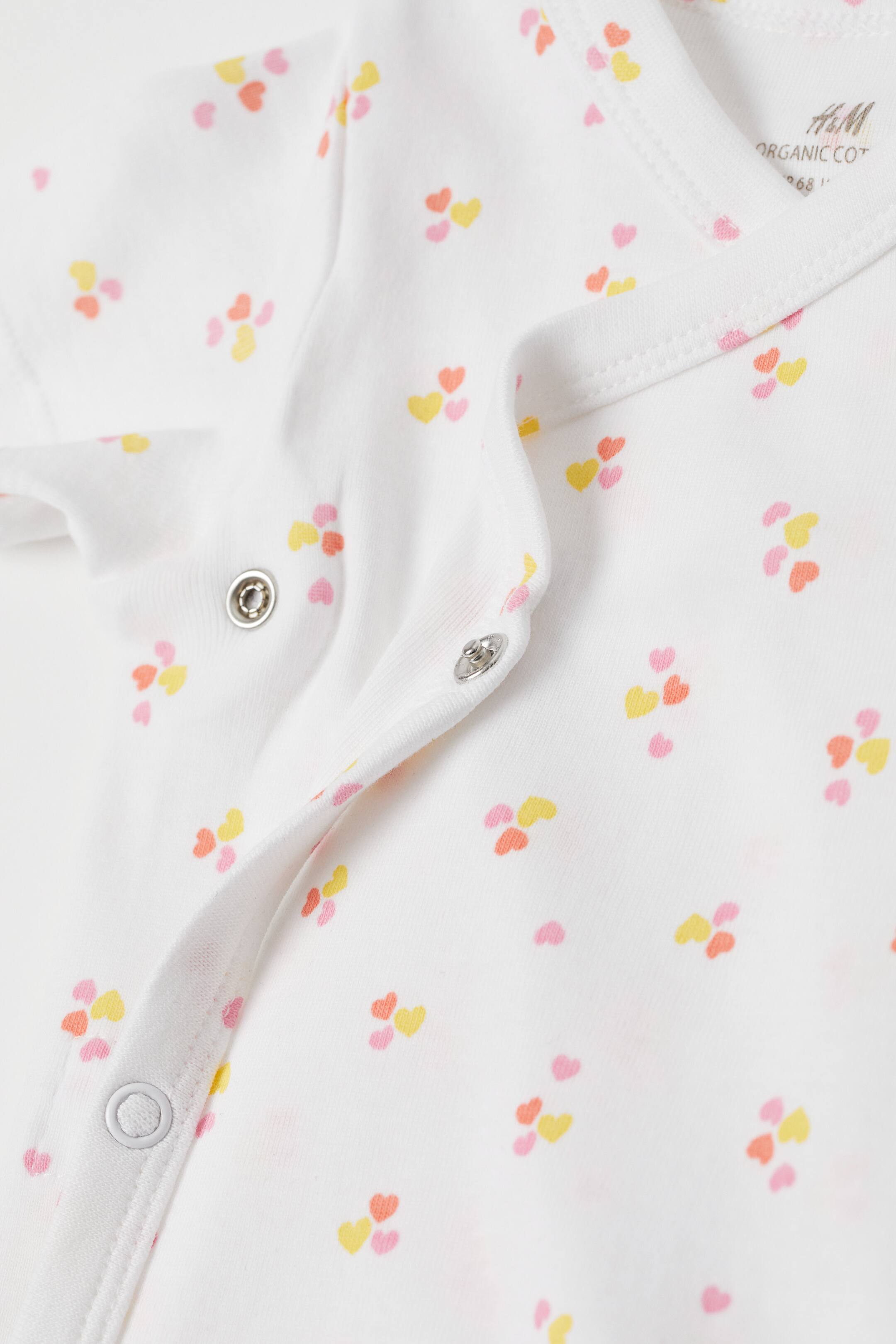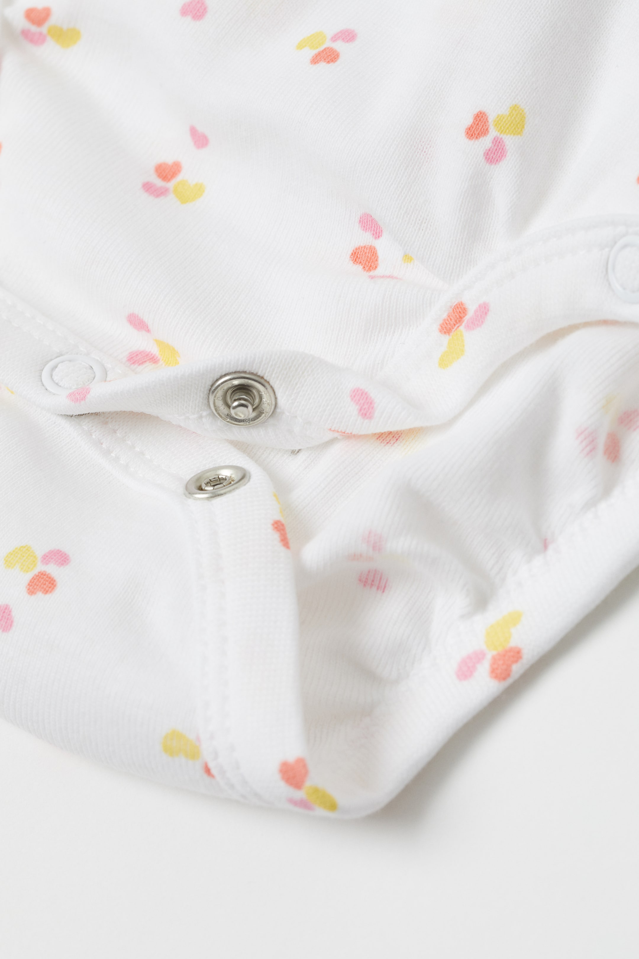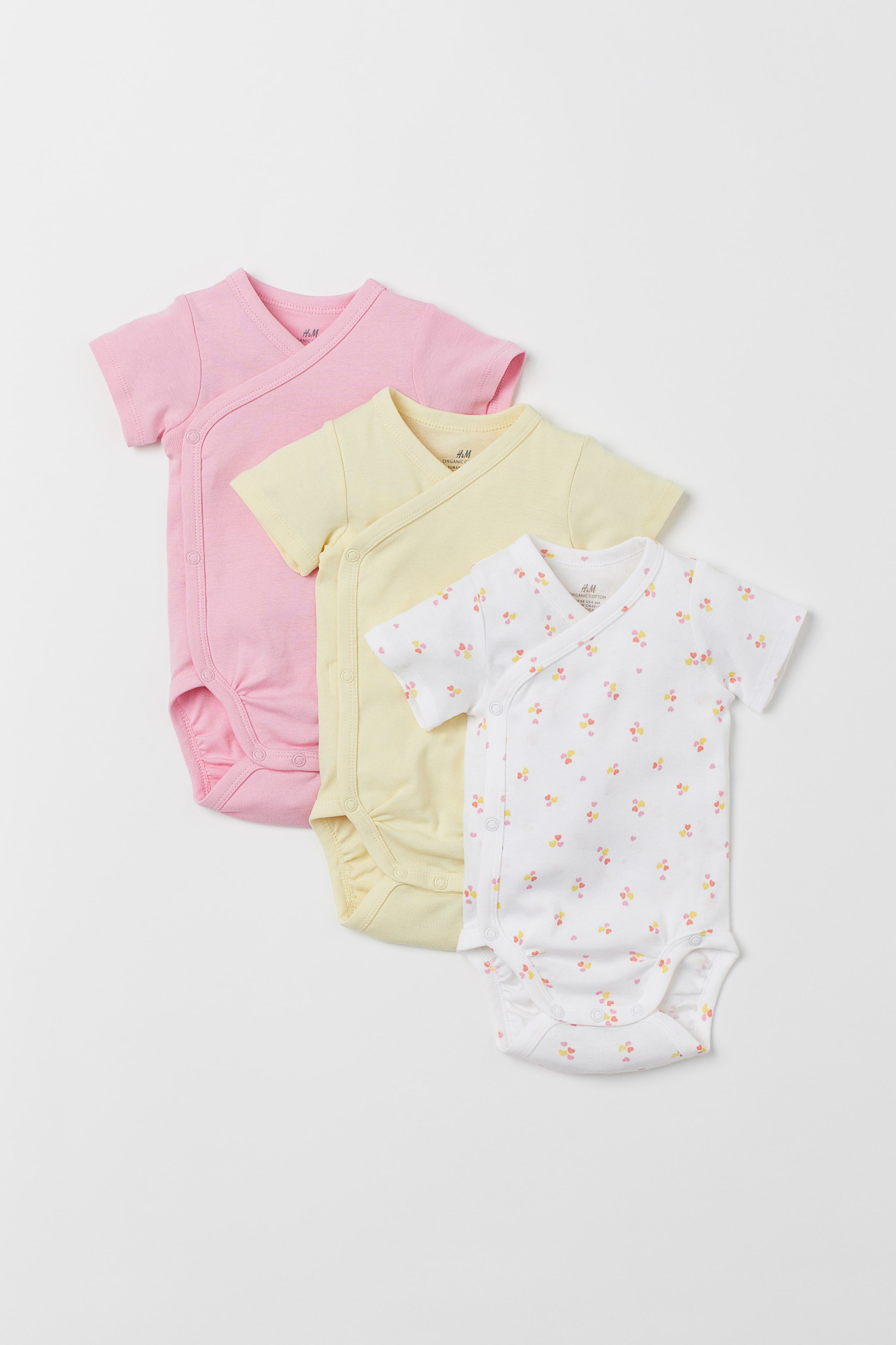 Short-sleeved, wrapover bodysuits in soft cotton jersey with press-studs down one side and at the crotch.