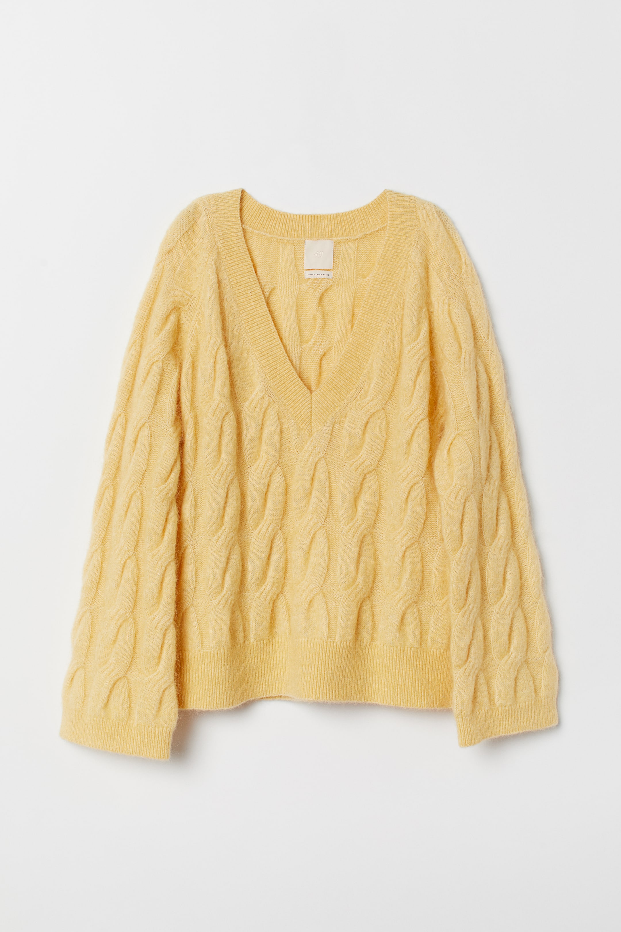 Cable-knit jumper knitted in a soft wool and mohair blend with a V-neck, wide raglan sleeves and ribbing around the neckline, cuffs and hem.
