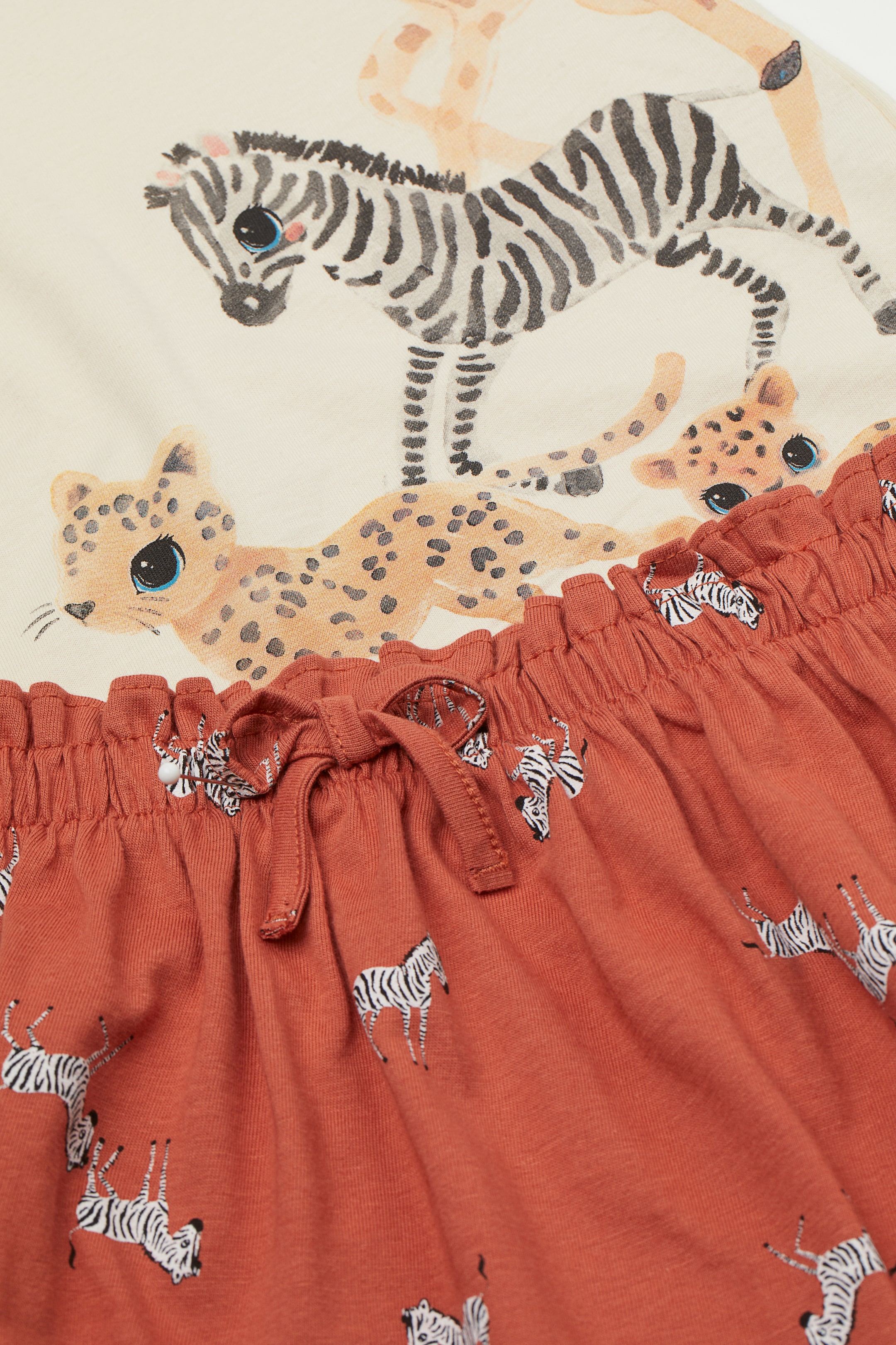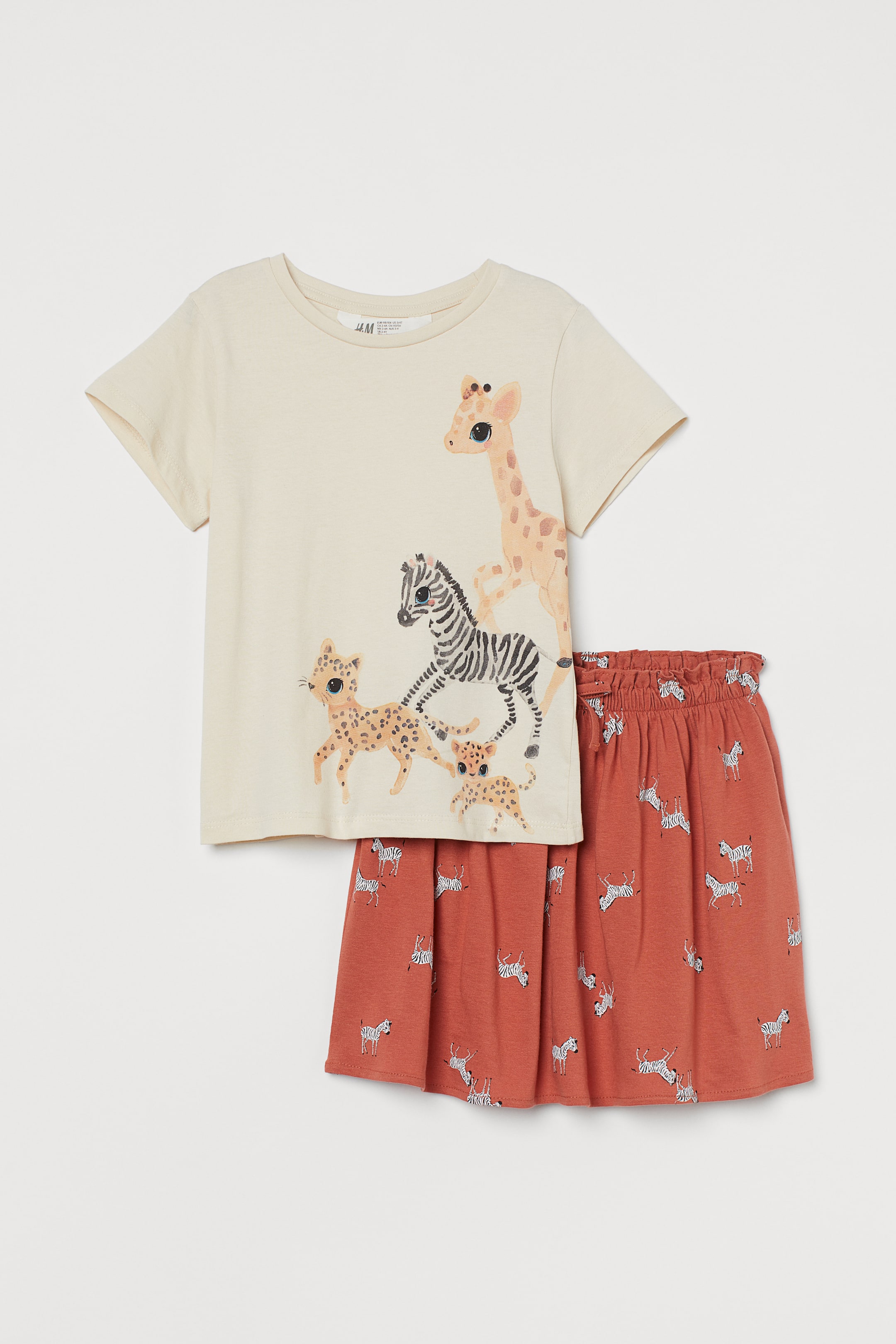 Set with a T-shirt and skirt in soft cotton jersey. T-shirt with a print motif on the front and round neckline with a narrow trim. Skirt with an all-over print, elastication and a frill trim at the waist, and a decorative bow at the front. Unlined.