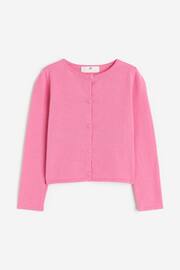 Cardigan in soft, fine-knit cotton with a round neckline, buttons down the front and long sleeves. Narrow trim around neckline, cuffs and hem.