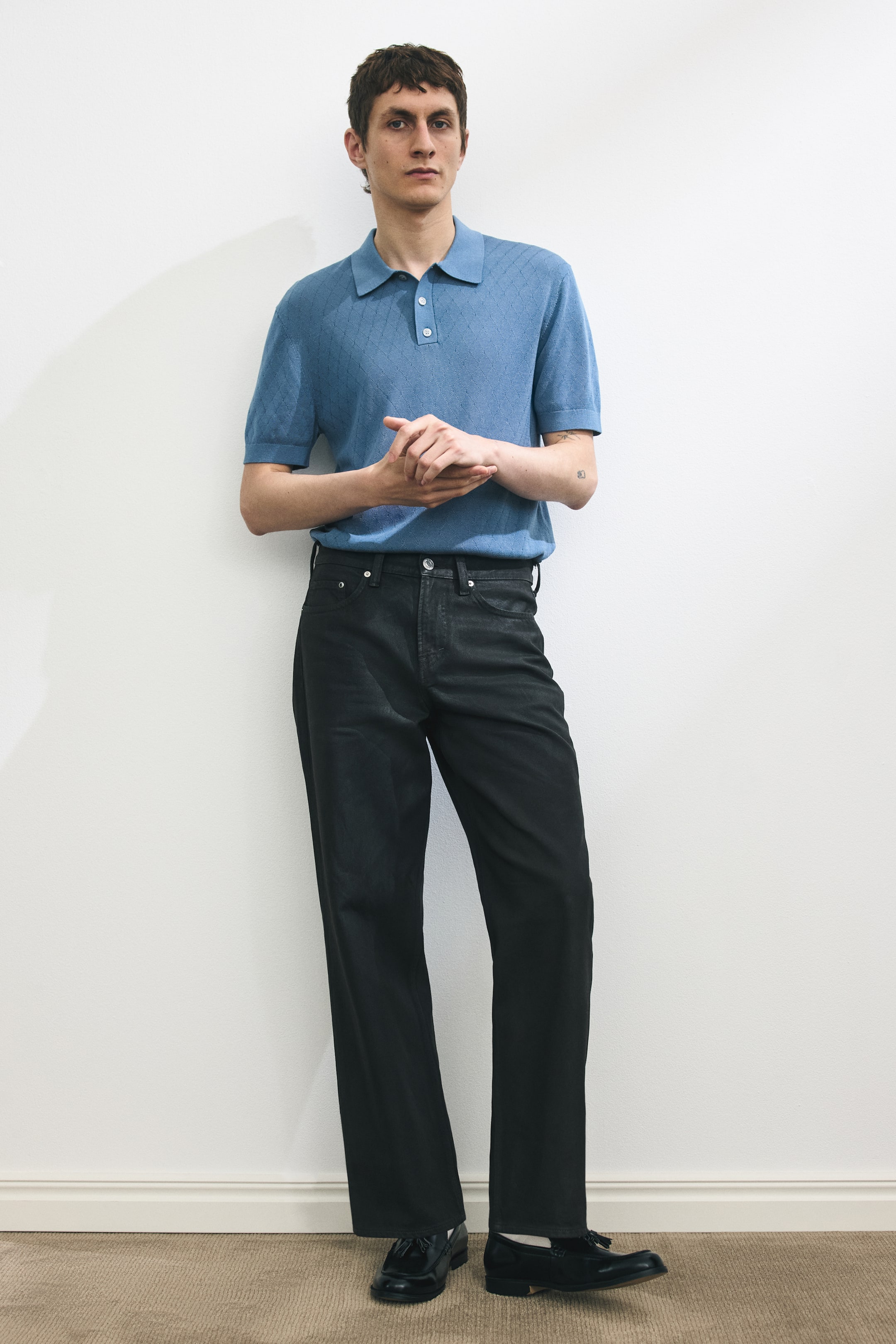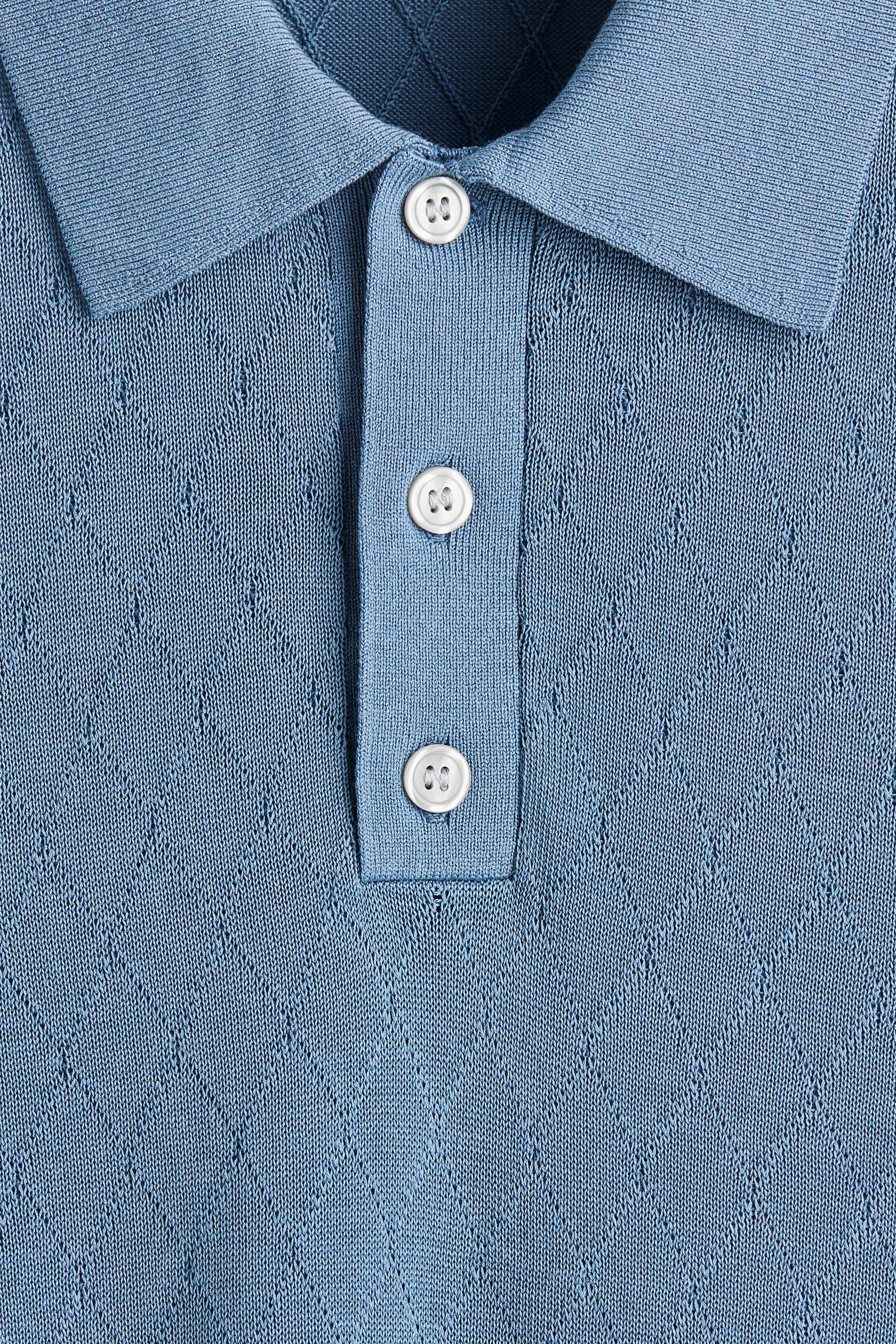 Polo shirt in a fine knit made from a cotton and lyocell blend containing some silk, featuring an argyle pattern. Designed with a collar, button placket, short sleeves, and a straight hem. Slim fit that hugs the contours of your body, creating a fitted silhouette.