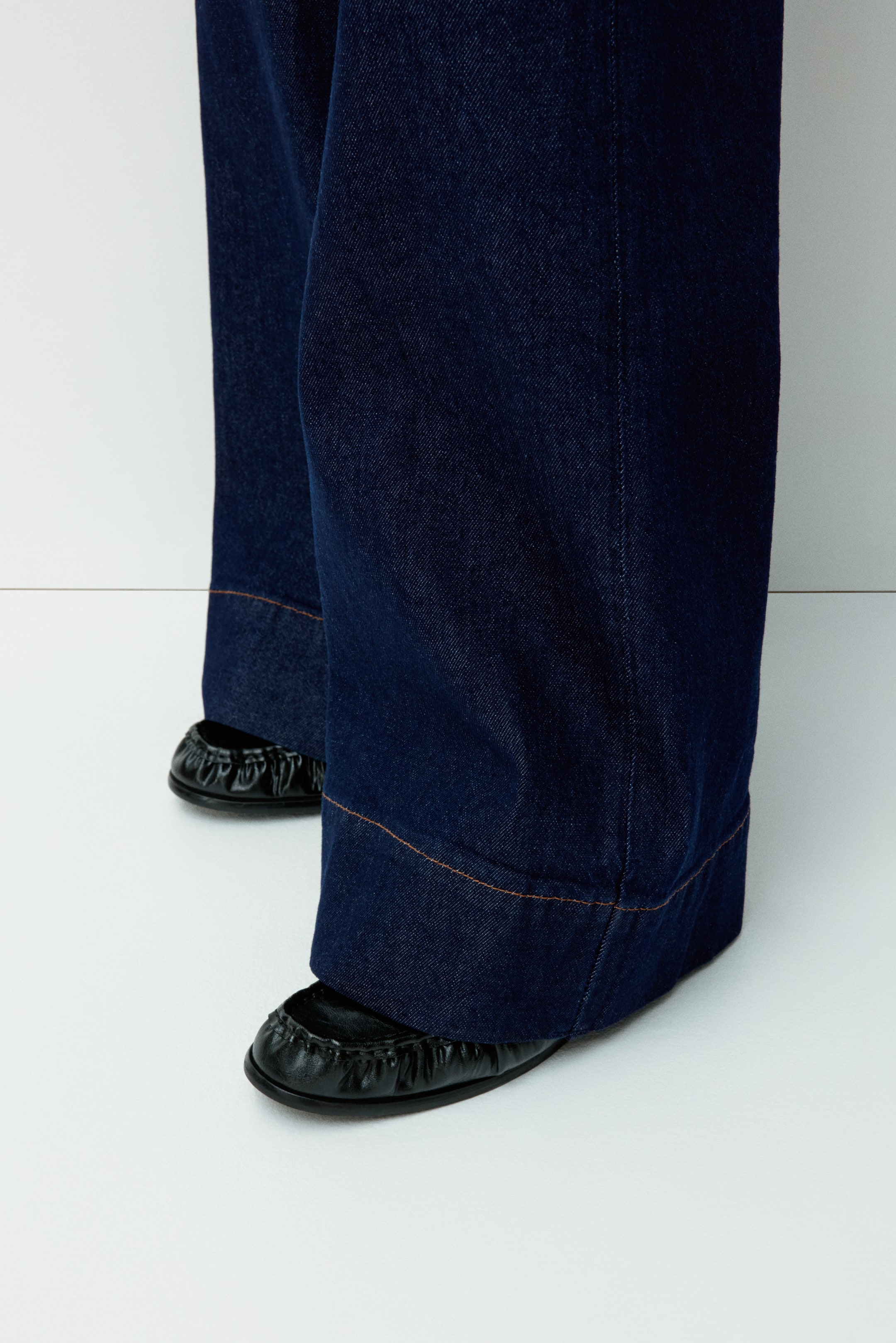Jeans in cotton denim with a slight stretch for good comfort. Wide leg with a regular fit from the waist to the hip and a wide cut from the thigh to the hem. Extra-high waist with a zip fly. Patch pockets at the front and back. Longer length, designed to fall over the foot with a stacking effect. Inspired by the 70s, designed for today.