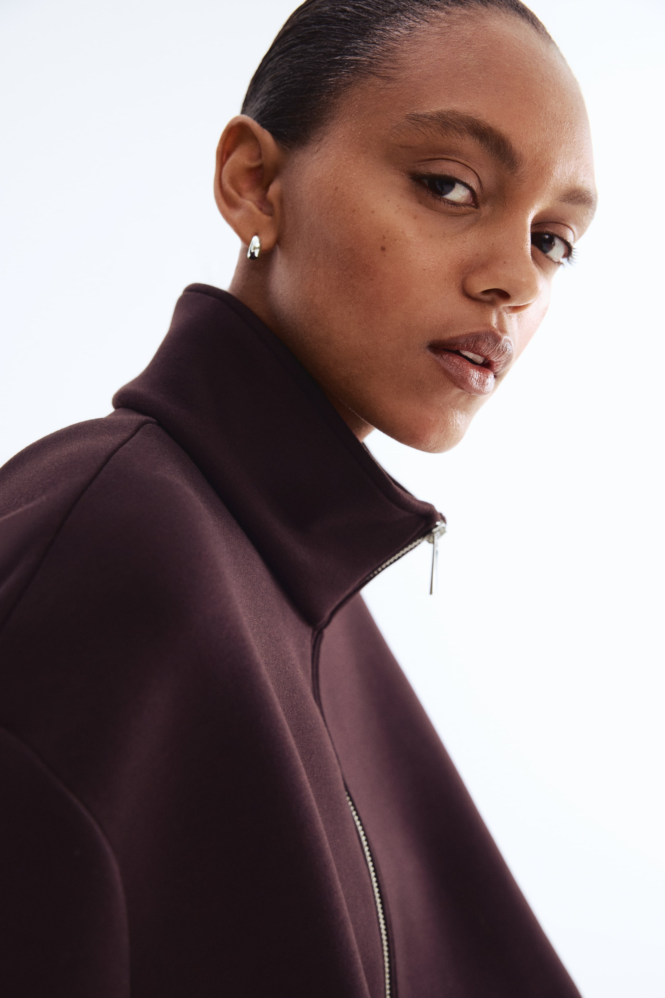 Jacket in scuba fabric with a funnel collar and a zip down the front. Dropped shoulders and pleats around the hem. Unlined.