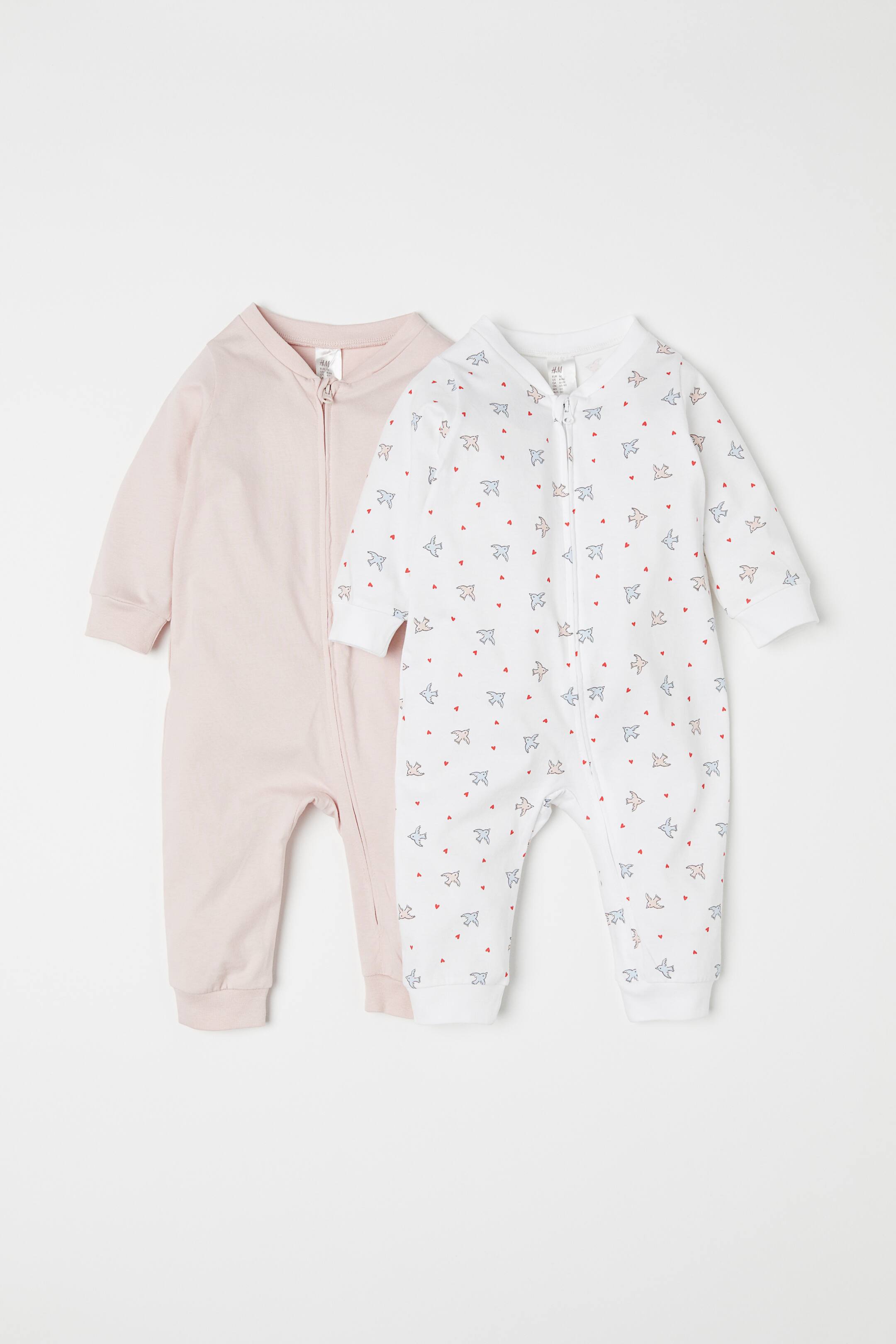Sleepsuits in soft cotton jersey with a zip down the front that continues down one leg and has a chin guard at the top. Ribbing around the neckline, cuffs and hem.
