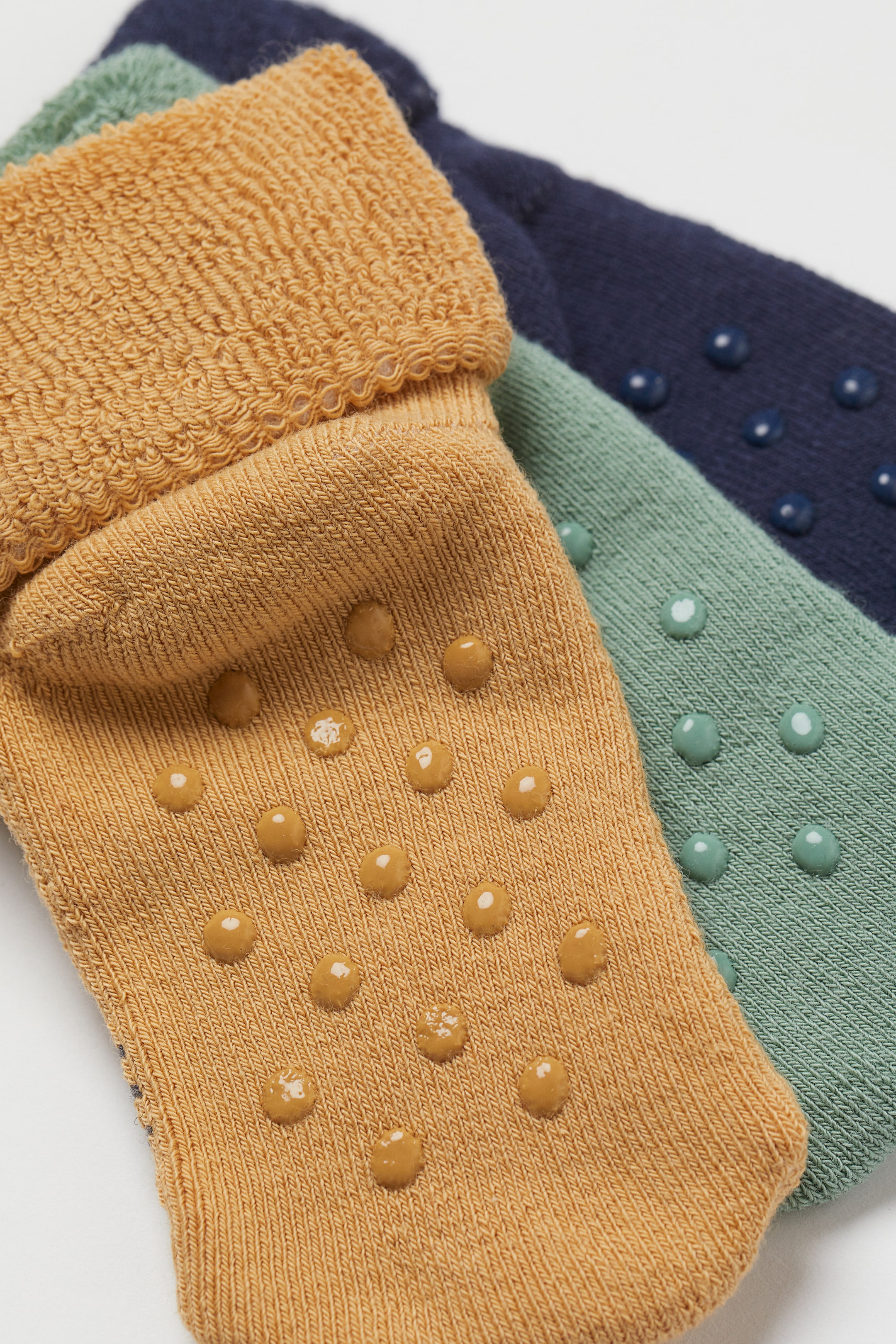 Socks in a soft, fine-knit cotton blend with a fold-down shaft and soft terry inside. Sizes 3-9 with anti-slip protectors.