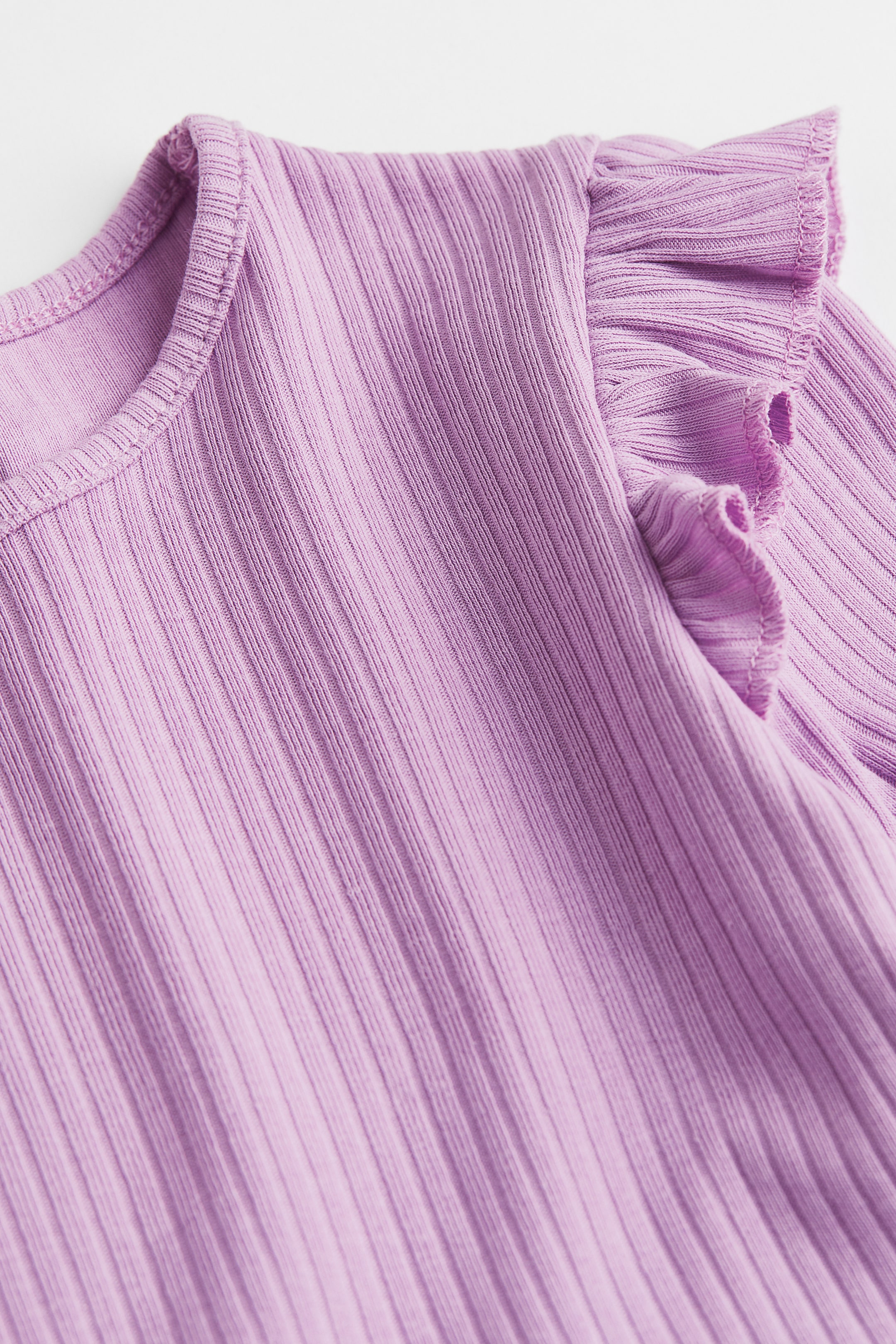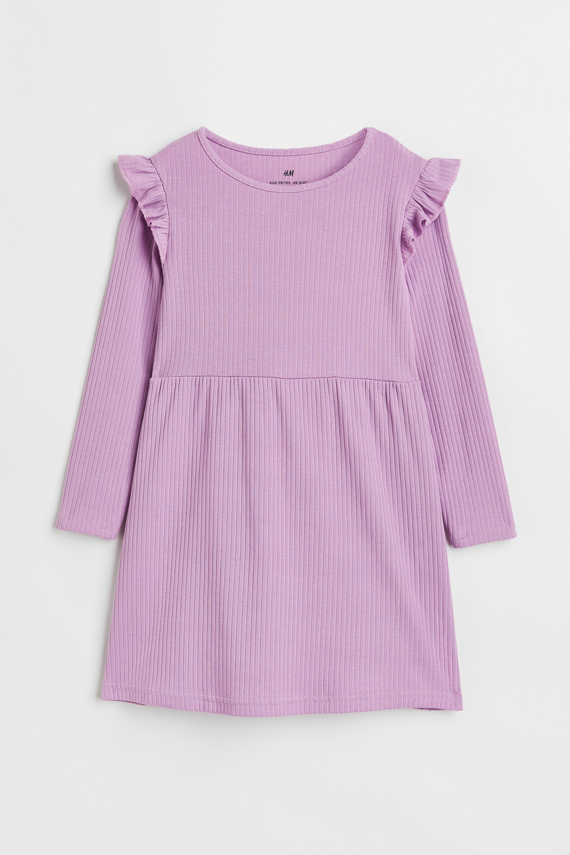Comfortable dress in ribbed cotton jersey, perfect for both play and parties. Long sleeves with an overlocked flounce on the shoulders, a seam at the waist and a gently flared skirt. Unlined.